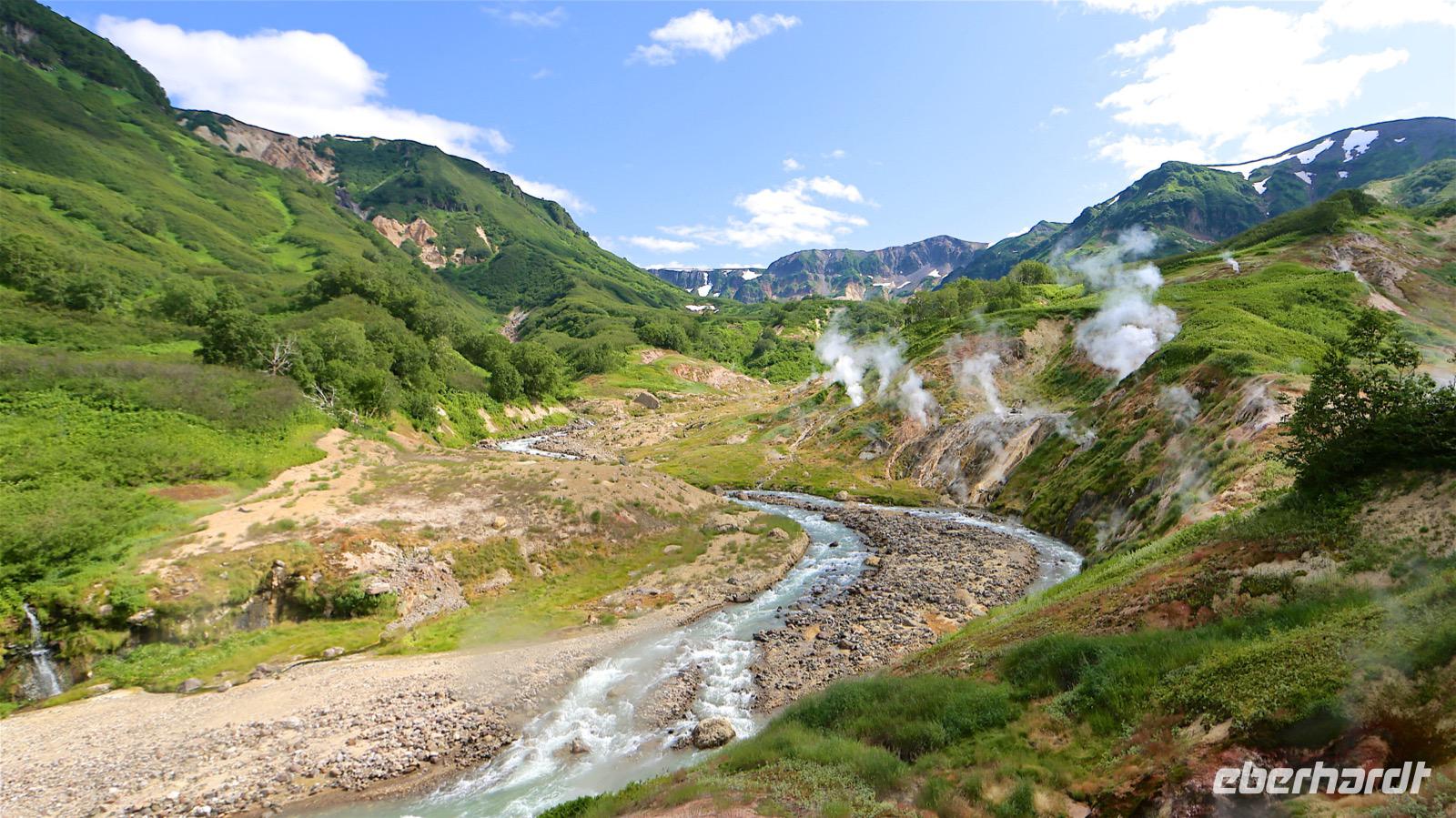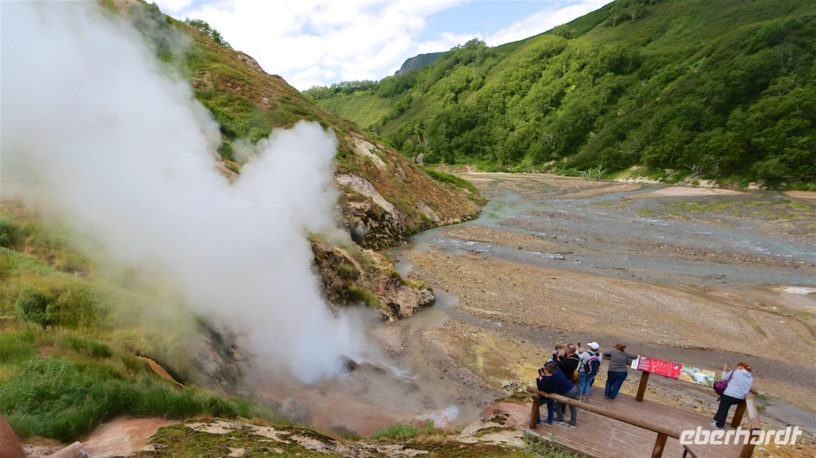Als wir schließlich um die Vulkane kreisen - Evgeniya, unser Guide auf der Tour, zeigt uns auf einer Tafel deren Namen - und die Krater und ihre Rauchfahnen bestaunen, macht sich Begeisterung breit. Spätestens jetzt ist allen die Einmaligkeit des begonnenen Abenteuers bewusst. 30 aktive Vulkane gibt es auf Kamtschatka, 300 sind es insgesamt, wir haben bereits einige davon aus nächster Nähe gesehen. In Superlativen setzt sich unser Ausflug fort. Im Tal der Geysire brodelt es aller Orten. Dampf, Schlamm, heiße Wasserfontänen wohin das Auge blickt. Wir erfahren viel Neues zu diesen Naturschauspielen und sehen die ersten Spuren der Bären. Nur wenig vor uns scheint einer von ihnen unseren Weg gekreuzt zu haben. Wir verstehen nun noch besser, warum uns die mit Flinten bewaffneten Ranger begleiten und zum Zusammenbleiben anhalten.
