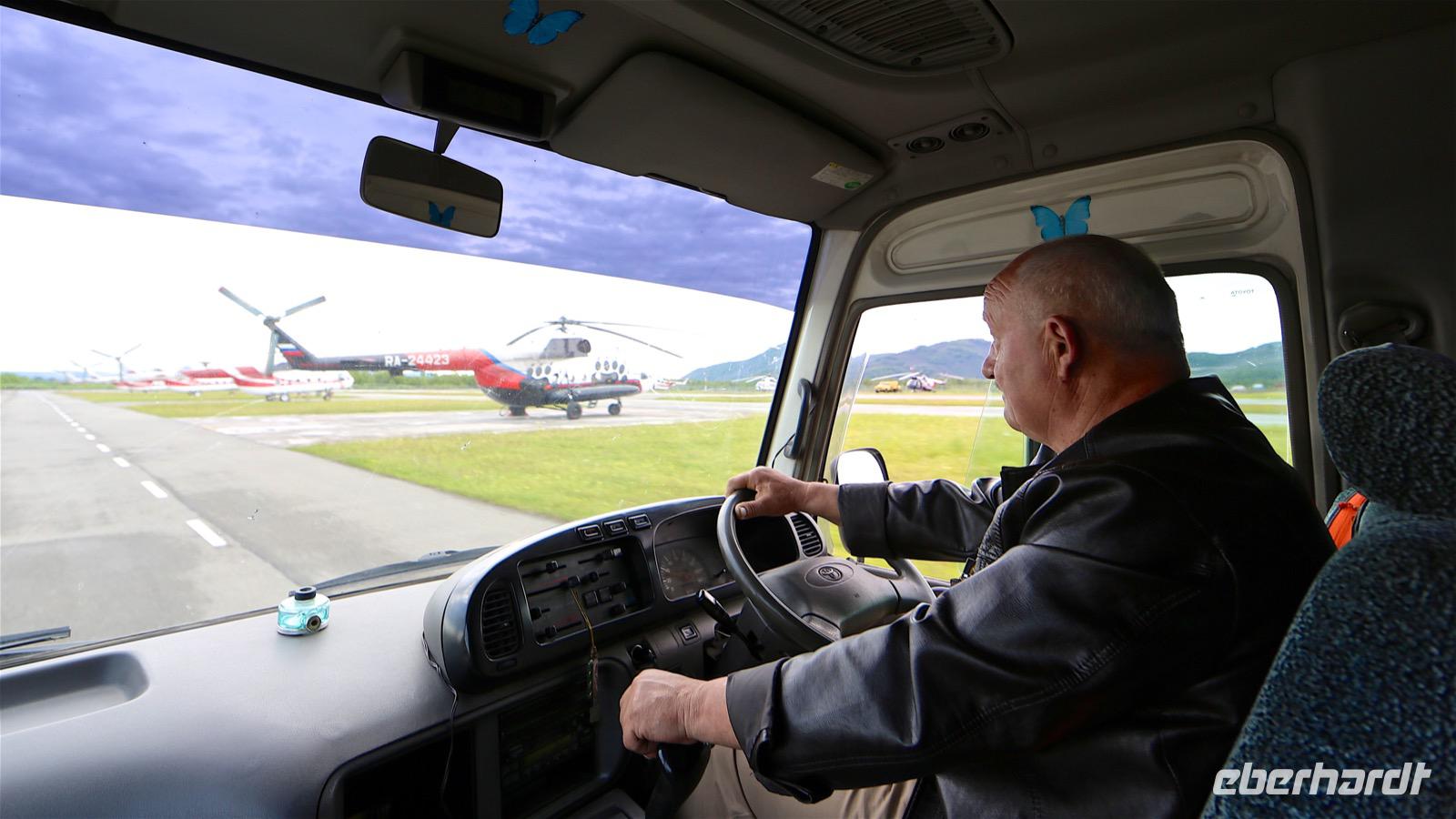 Zum heutigen Ausflug starten wir um 8:00 Uhr, er soll uns zum Kurilensee und den dortigen Braunbären führen. Etwa 20 000 von ihnen leben auf Kamtschatka, wir wollen sie gern ein wenig beobachten. Es ist bewölkt, aber warm. Zum Flugplatz ist es heute etwas weiter, etwa eine Stunde mit dem Bus, rechnet Maria. Für heute ist eine Maschine der Vertikal-T gebucht. Jewgeni, unser freundlicher Fahrer, möchte uns unterwegs mit einem Video zu Kamtschatka auf das Kommende einstimmen, sind doch die Vulkane erneut nicht zu sehen. Für 09:00 Uhr ist unser Abflug vorgesehen. Unterwegs jedoch erhalten wir Nachricht, dass auf Grund der Wettersituation am Kurilensee frühestens um 10:00 Uhr gestartet werden kann. Wir haben eine Stunde zu überbrücken und versuchen eine kleine Rundfahrt durch Petropawlowsk und halten an einem Aussichtspunkt hoch über der Avacha-Bucht. Die Aussicht über die Bucht ist grandios, die Gipfel jedoch sind alle in den Wolken. Gegen 10:00 Uhr erreichen wir dann unseren heutigen Flughafen. Er wirkt recht verwahrlost, es stehen hier drei funktionstüchtige Hubschrauber der Vertikal-T - darunter der für uns bestimmte - und eine ganze Reihe kleinerer Flugzeuge a.D., vorzugsweise AN2 aus Sowjetzeiten - ein Flugzeugfriedhof. Der eigentliche Flughafen sei derzeit in Rekonstruktion, werden unsere Fragen kommentiert.