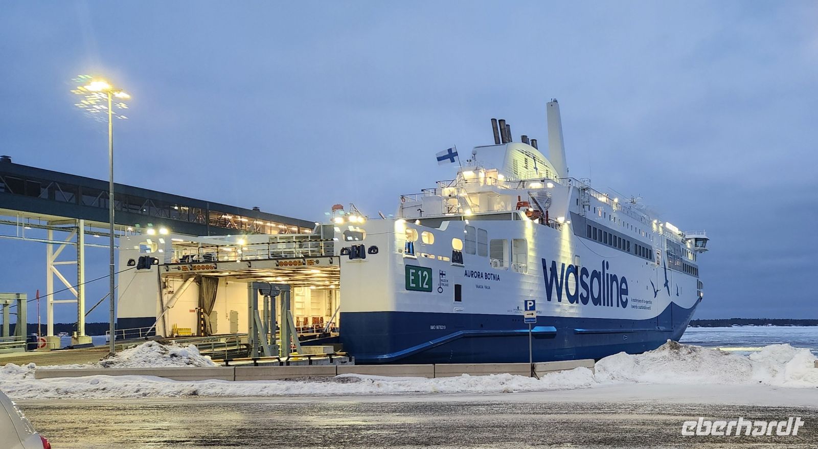 Unsere Eiskreuzfahrt startet in Vaasa. Vaasa liegt an der westlichen Küste, am Bottnischen Meerbusen. Wir starten früh am Morgen, majestätisch liegt se da, die MS Aurora Botnia.
