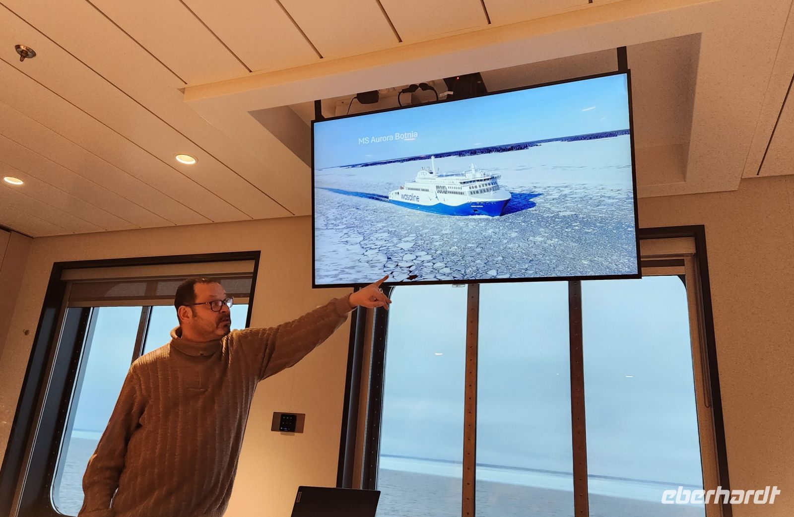 Während eines Vortrages in einem Konferenzraum des Schiffes erfahren wir viel Wissenswertes über das Schiff und die Polarlichter.