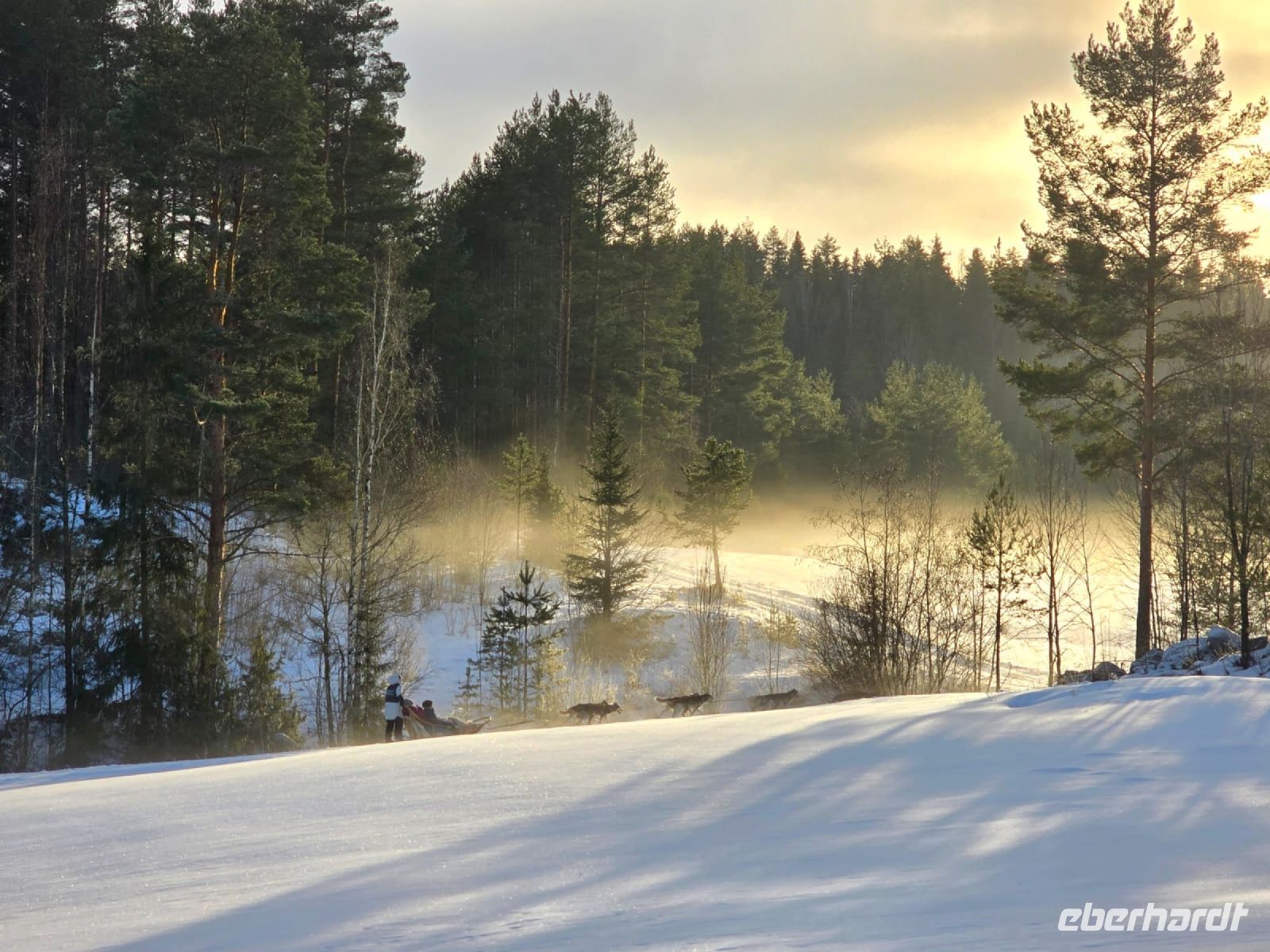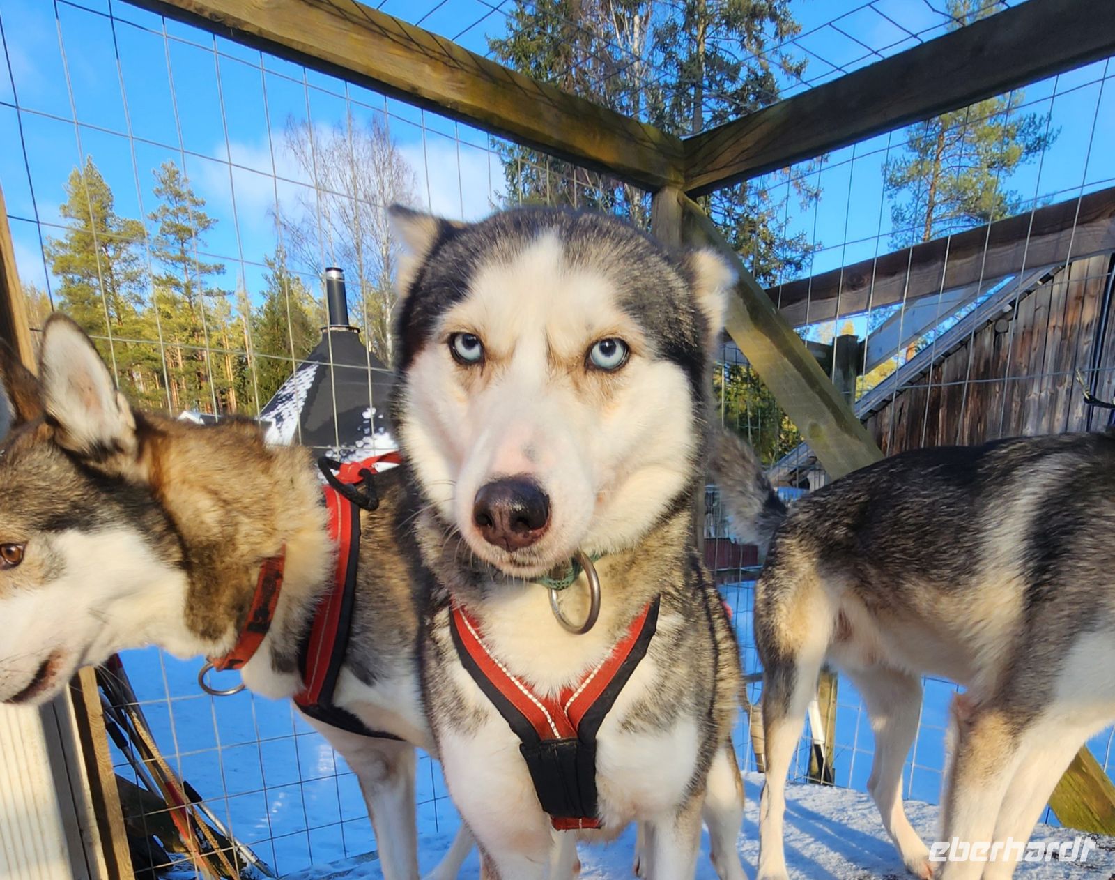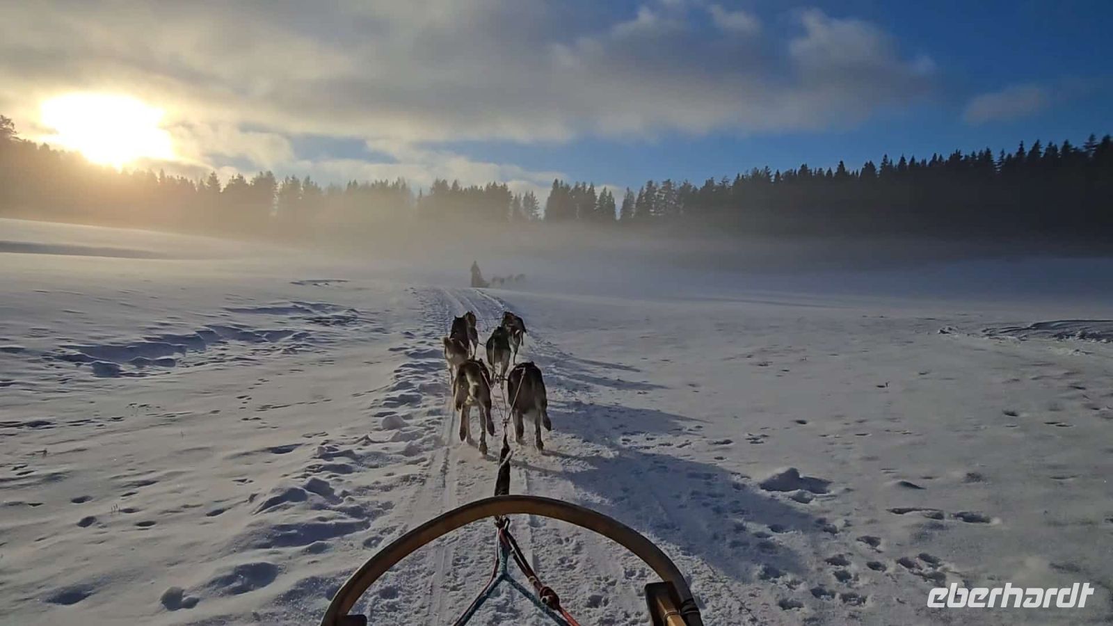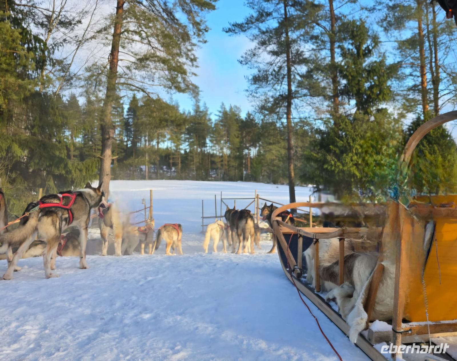 Wir dürfen selbt das Geschirr anlegen. Zu zweit nehmen wir im Schlitten Platz und drehen alle eine große Runde durch die märchenhafte, winterliche Landschaft. Und zur Krönung werden wir sogar noch mit allerschönstem Sonnenschein beschenkt. Zum Abschluss gibt es für uns einen heissen Saft und Kekse am offenen Feuer in einer urig eingerichteten Holzhütte.