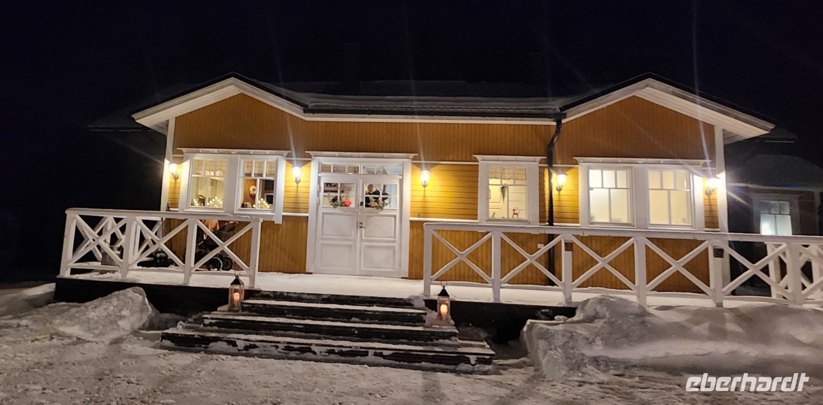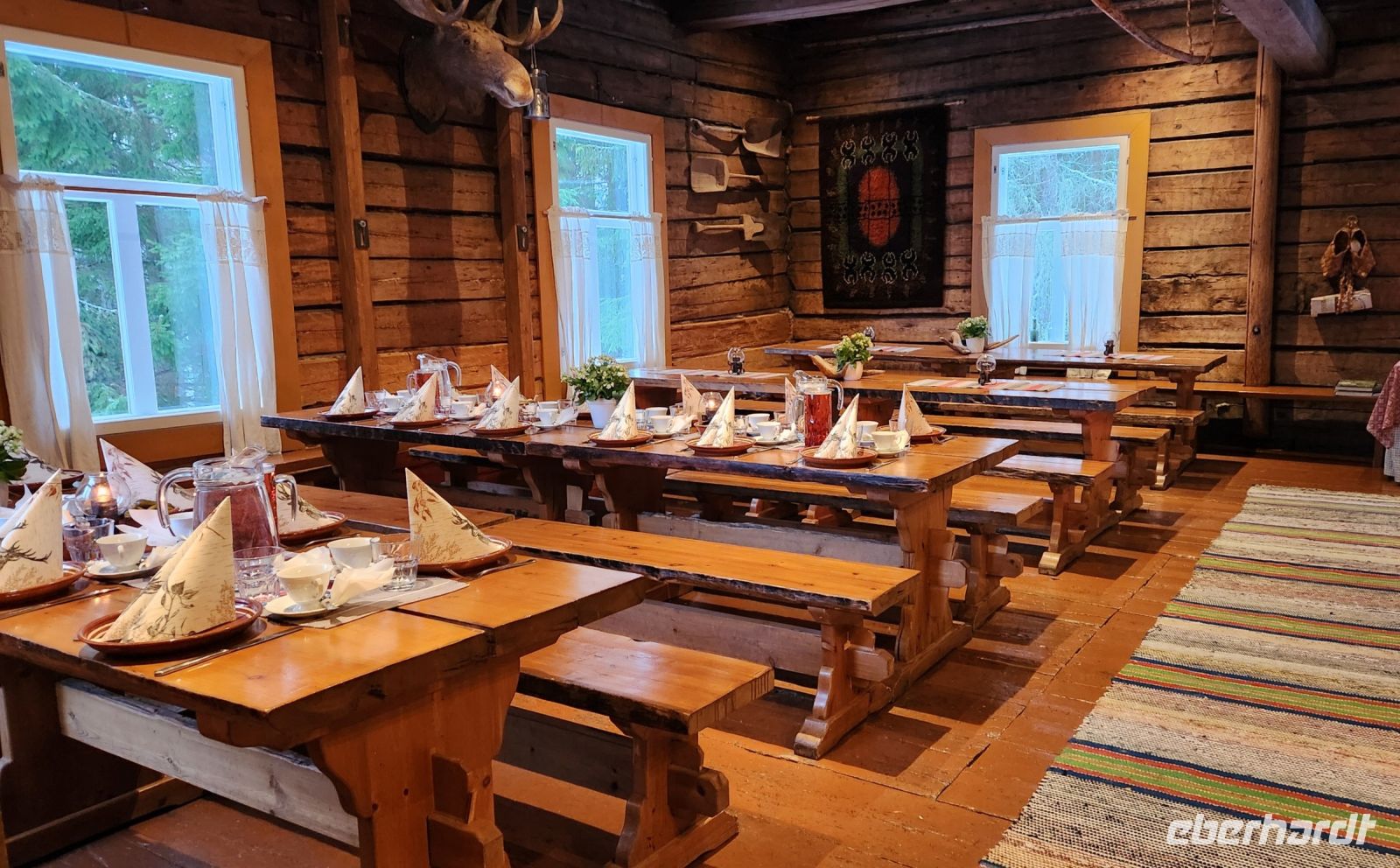 Unser nächstes Ziel ist das Herrenhaus Moose Manor. Für uns wurde ein traditionelles, finnisches Gericht gekocht, eine Wildtopfpfanne, als Nachtisch serviert man uns Blaubeer-Talkkuna, ein Dessert aus getrocknetem Hafer und Gerste. Wir sitzen am offenen Feuer in diesem alten Herrenhaus, es ist wirklich urgemütlich.
