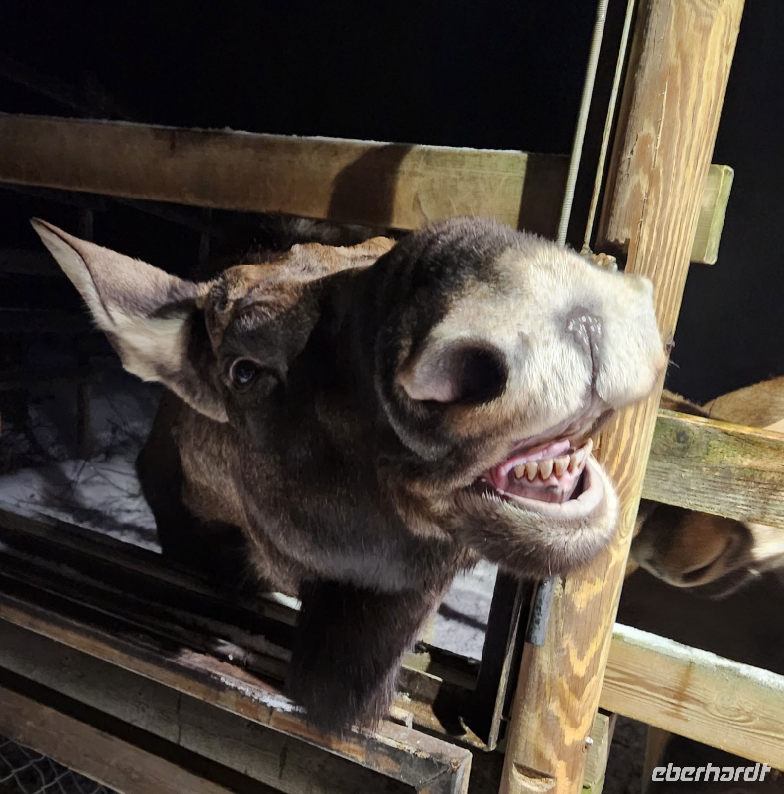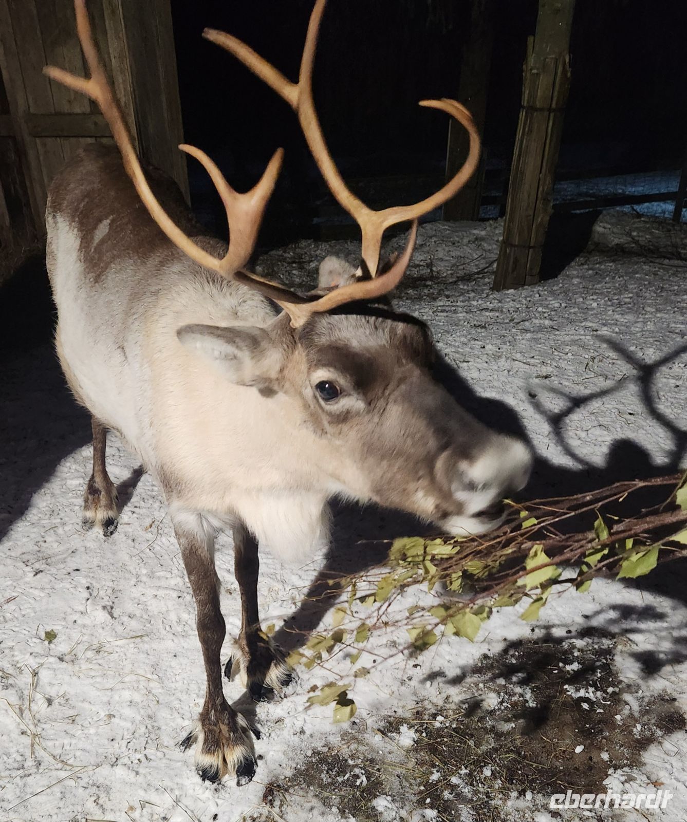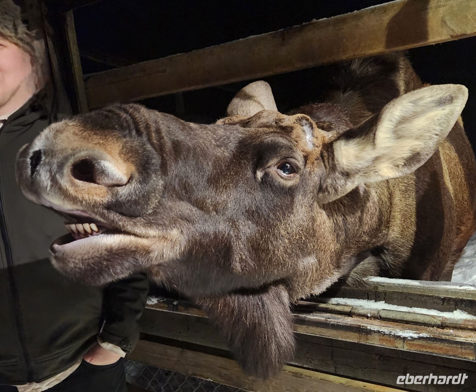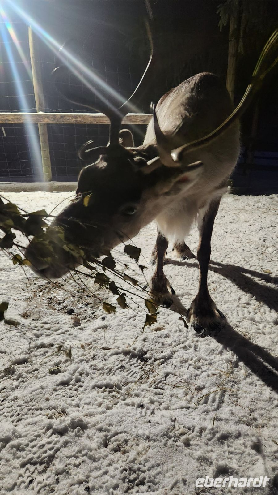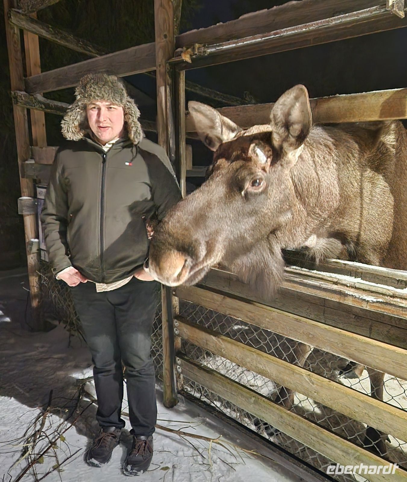 Dann ist es endlich soweit. Wir gehen in das Gehege vieler Rentiere. Sofort werden wir von ihnen umringt und füttern und streicheln diese Tiere, die die meisten von uns noch nie zuvor gesehen haben. Und zum krönenden Abschluss lernen wir die Elche kennen und jeder, der sich traut, bekommt auch seinen versprochenden Elchkuss, gewappnet mit einer Möhre im Mund !!!