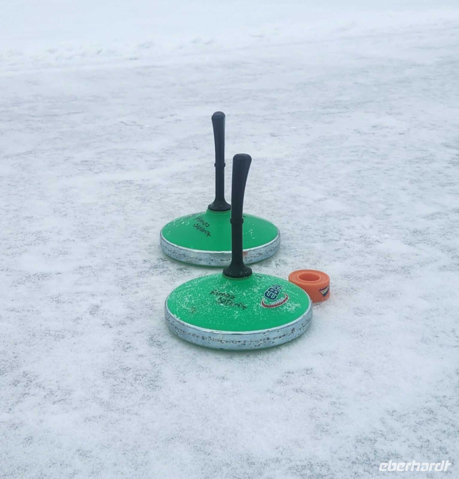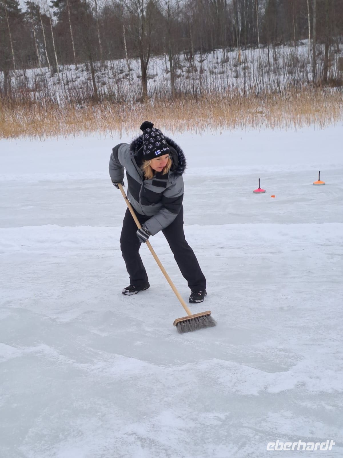 Nach einer kleinen Stärkung heisst es dann : Mannschaften bilden. Wir spielen auf einem zugefrorenen See Eiscurling nach ganz einfachen Regeln, wir haben unendlich viel Spaß dabei, am lustigsten ist dabei immer der Wischer mit seinem Besen!