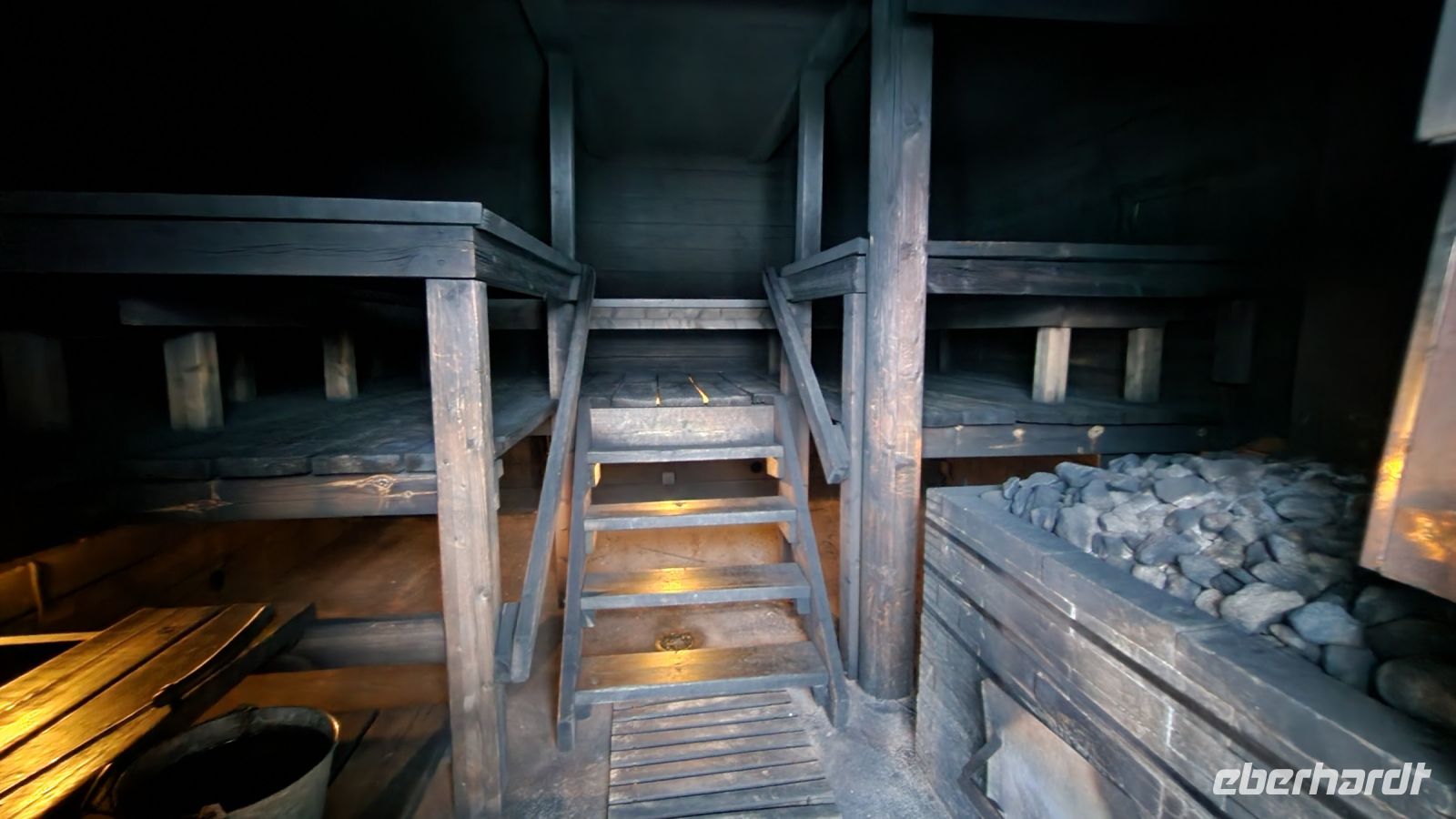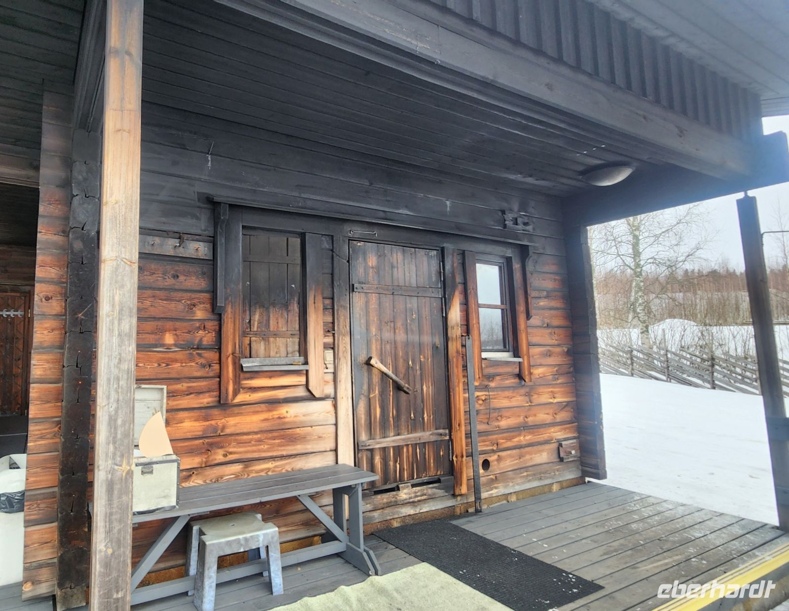 Am Nachmittag ist dann Entspannung angesagt - eine traditionelle Rauchsauna wurde für uns angeheizt. Völlig schwarz und dunkel vom Russ ist diese kleine Hütte von innen, für alle ein völig unbekanntes, neues Erlebnis. Die ganz Mutigen tauchen für einen kurzen Moment in den anliegenden See unter, dieses Gefühl bleibt für immer unvergesslich. Aber auch ein Whirl-Pool mitten in der Winterlandschaft mit herrlich warmem Wasser steht bereit und mit einem Glas Sekt in der Hand fühlt man sich, als gehöre man zu den oberen Zehntausend.