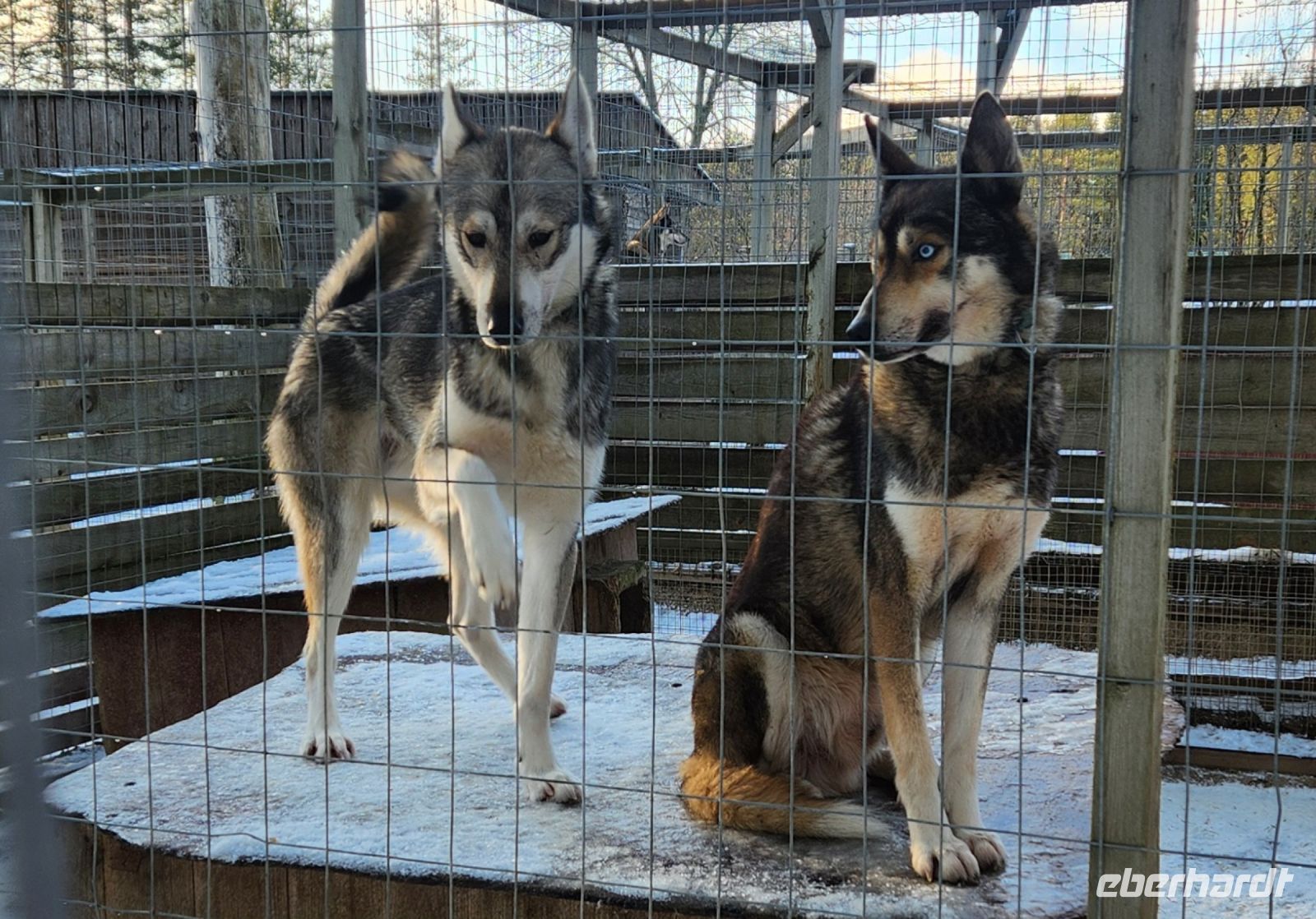 Gegen Mittag erreichen wir " McAhon Safarit", die Huskyfarm. Wir werden mit lautem, aufgeregten Gebell von den vielen Huskys begrüßt. Herzlich begrüßt uns dann auch Herta. Sie erklärt uns alles ganz genau und dann dürfen wir zu den Hunden. Fröhlich und zutraulich springen sie an uns hoch, rennen wild durcheinander und beschnuppern uns. Angst oder Bedenken hat keiner von uns, wir streicheln sie und versuchen viele tolle Fotos als Erinnerung zu machen.