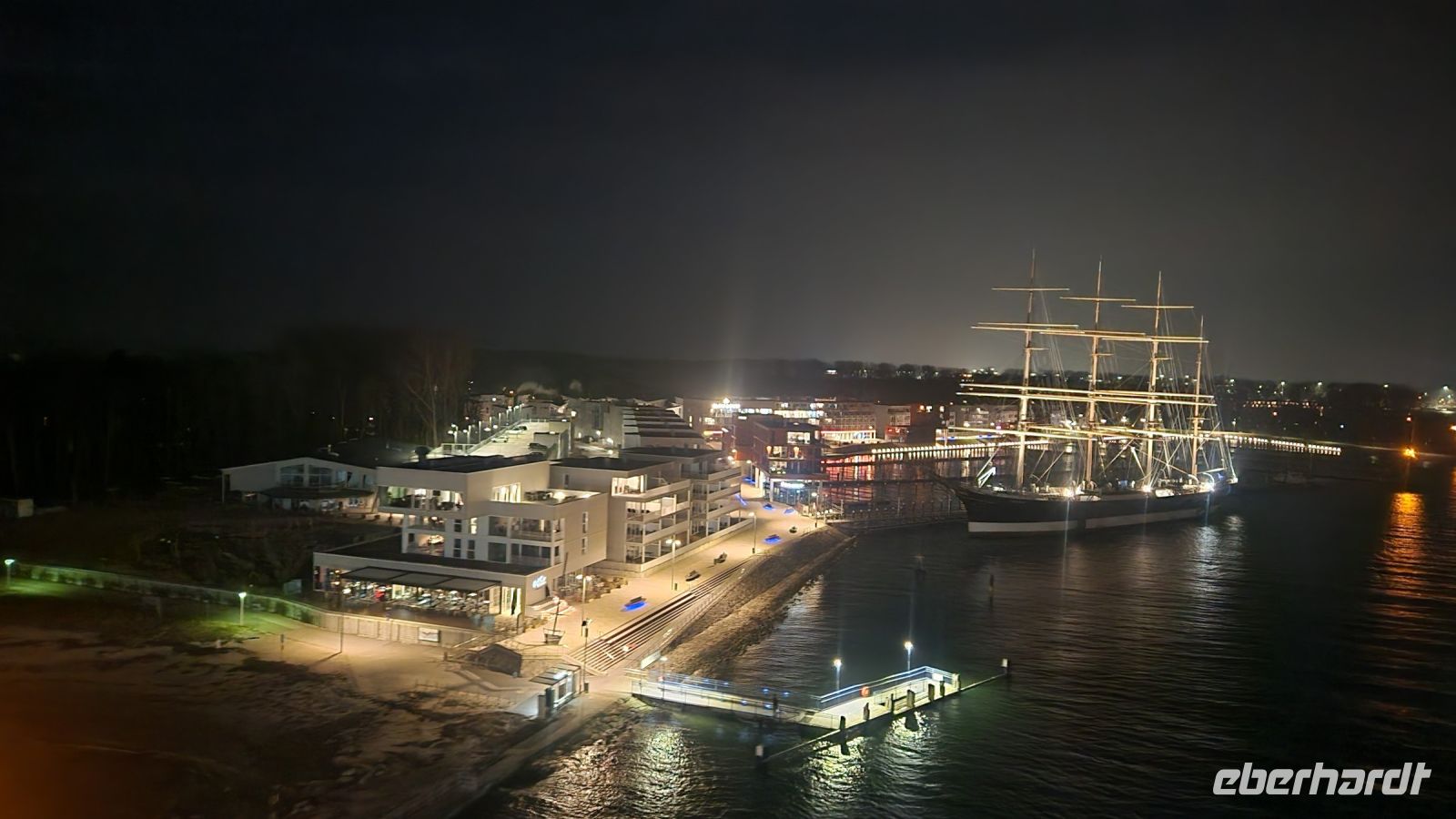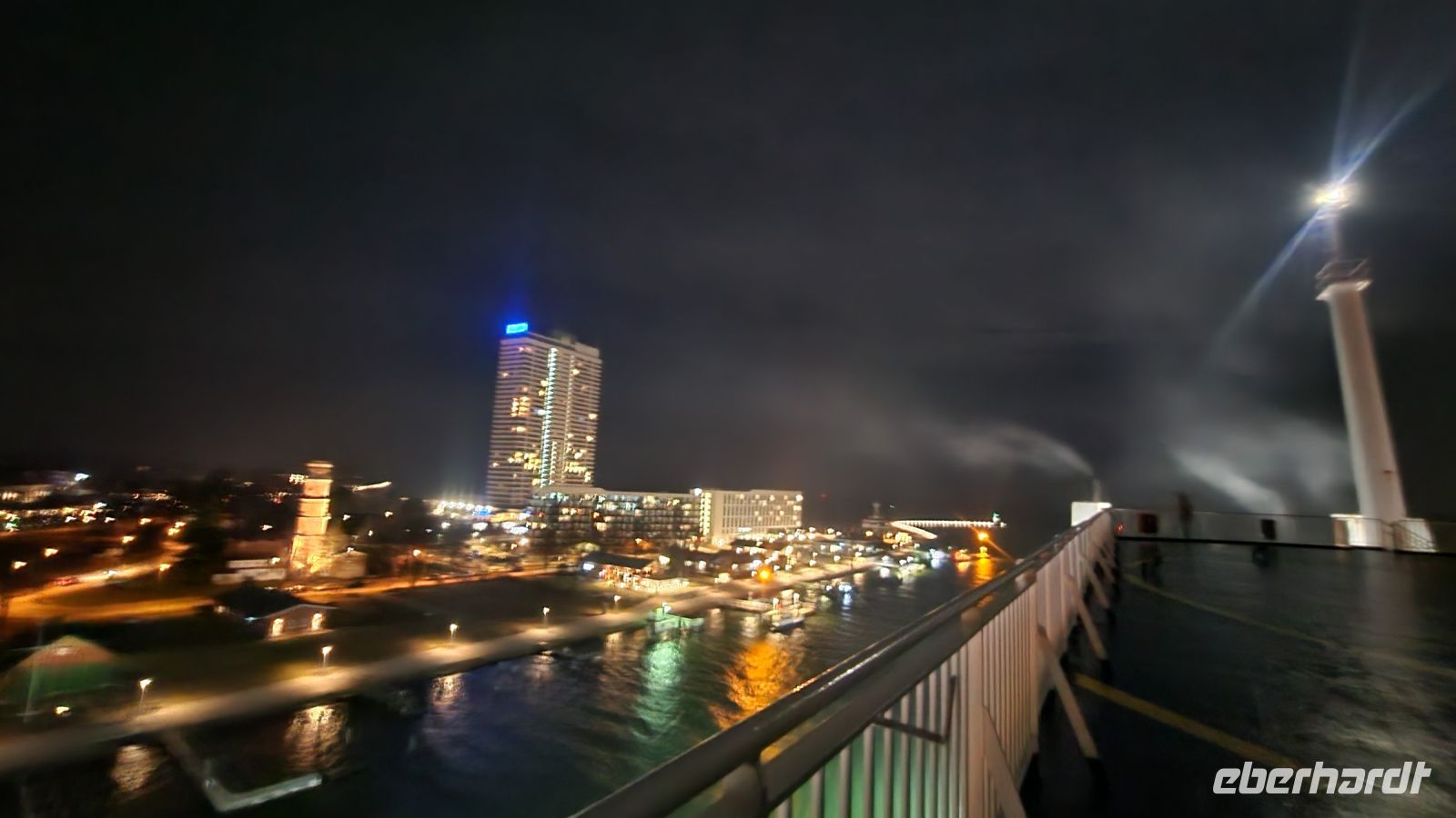 Und dann ist unser letztes Abendessen auch schon gekommen. Danach wird der Koffer wieder zugeklappt und wir treffen uns alle auf dem Oberdeck, um die Einfahrt in den Travemünder Hafen zu genießen. Wir entdecken die Passat, das alte Segelschiff, das als Wahrzeichen von Travemünde gilt, wunderschön beleuchtet im Hafen liegen und auch unübersehbar: das Maritim-Strand-Hotel, unsere Unterkunft für die kommende Nacht.