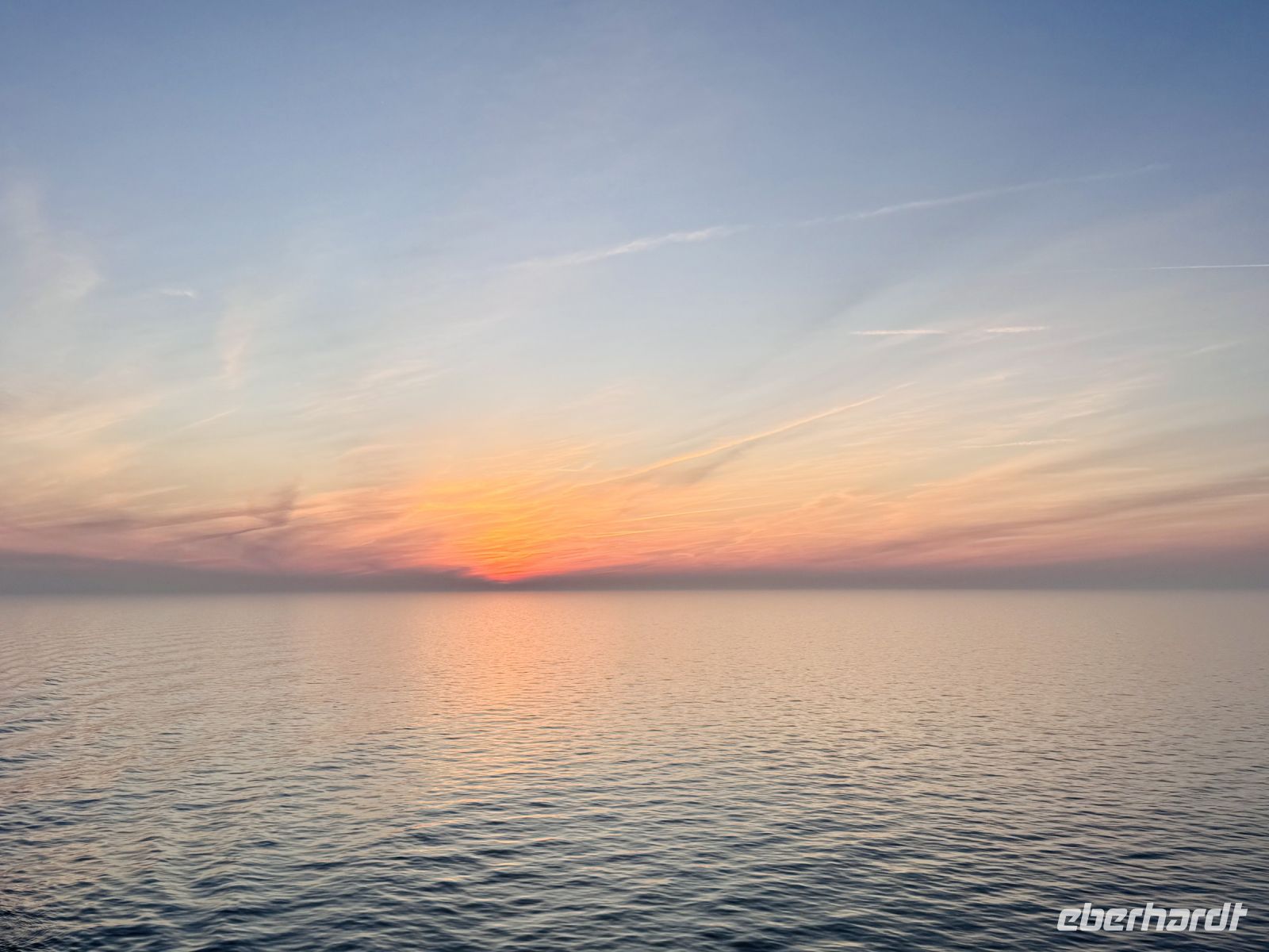 Der Morgen beginnt still. Nur ein sanftes Schaukeln erinnert daran, dass wir uns noch auf dem Meer befinden. Die Wellen rollen gemächlich dahin, kräuseln sich leicht im Wind, aber von rauer See kann keine Rede sein. Über uns hängt eine dichte Wolkendecke, die das Licht dämpft und dem Wasser einen silbrigen Glanz verleiht. Perfekt, um den Tag entspannt zu starten. Während wir beim Frühstück zusammensitzen, scheint es, als würde auch das Wetter langsam erwachen -die ersten helleren Flecken zeigen sich am Himmel. Ein heißer Kaffee, ein knuspriges Brötchen mit Butter und Honig – wir lassen uns Zeit und genießen den Blick nach draußen. Auf dem Außendeck weht eine angenehme Brise. Die Wellen tanzen in sanften Bewegungen. Wir lehnen uns an die Reling, lassen den Blick über das Wasser schweifen und atmen tief durch. Es ist dieser Moment der Ruhe, der eine besondere Magie in sich trägt – die Weite des Meeres, das gleichmäßige Rauschen, die langsame Verwandlung des Himmels. Nach und nach brechen die ersten Sonnenstrahlen durch die Wolken. Erst nur ein schmaler Lichtstreifen am Horizont, dann immer mehr, bis das Wasser schließlich in warmen Tönen schimmert. Wir entscheiden uns für einen letzten Gang in die Sauna – die wohltuende Wärme auf der Haut, danach ein paar Minuten im Whirlpool, das Wasser sprudelt, die Anspannung fällt ab. Der Abend naht, und mit ihm ein letztes, reichhaltiges Buffet an Bord. Noch einmal genießen wir die Vielfalt, lassen uns kulinarisch verwöhnen und stoßen auf die vergangenen Tage an. Die Gespräche sind lebhaft, doch immer wieder schweift unser Blick nach draußen – die Sonne steht tief, ihr Licht taucht das Meer in ein sanftes Gold. Als wir uns Travemünde nähern, spiegeln sich die Hafenlichter auf den sanften Wellen. Das Schiff gleitet ruhig in den Hafen, und wir spüren die Vorfreude auf eine letzte gemeinsame Nacht im Hotel. Während wir in die Kissen sinken, klingt das Rauschen des Meeres noch leise in uns nach – ein Echo eines Tages, den wir so schnell nicht vergessen werden.