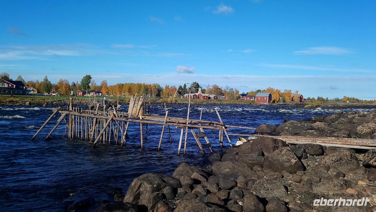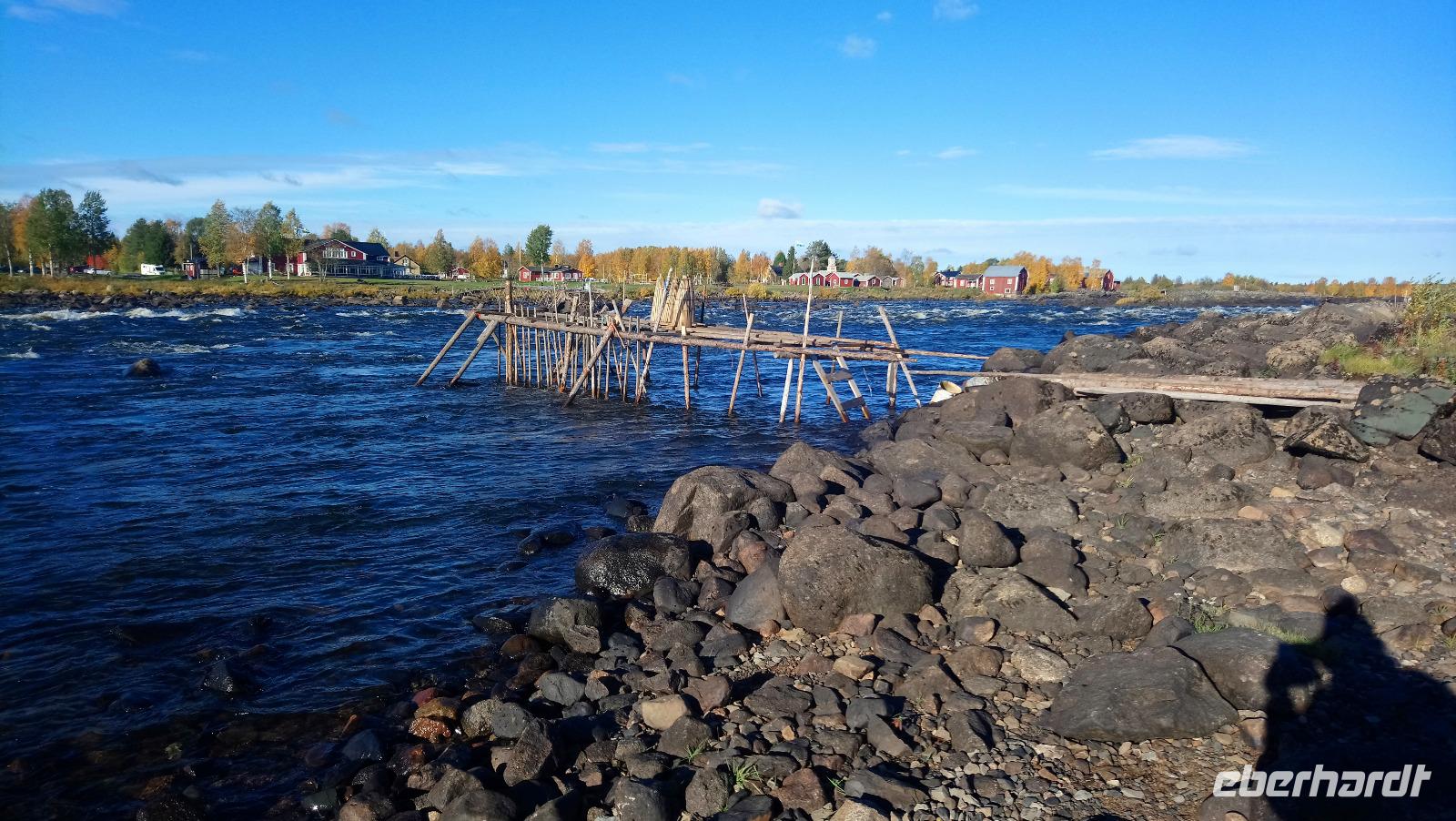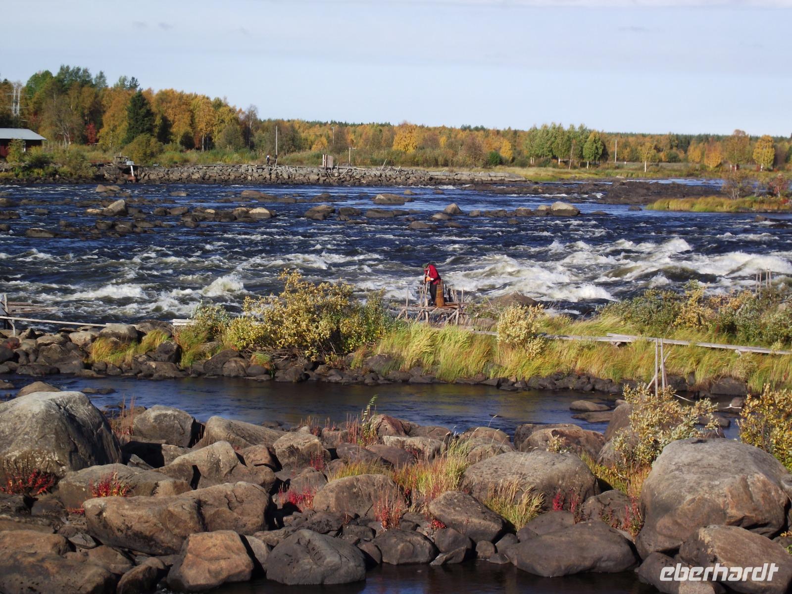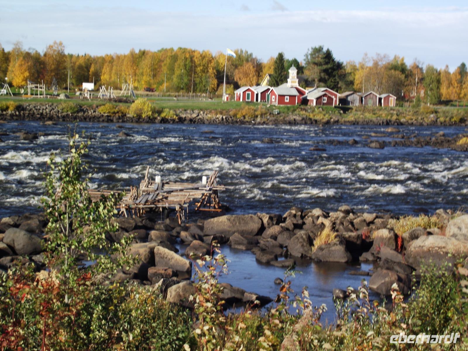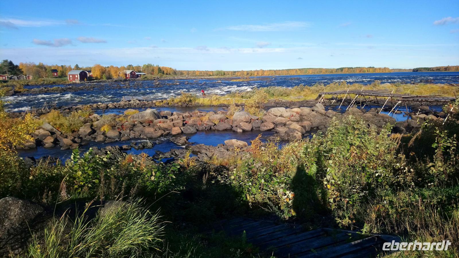 Bei strahlendem Sonnenschein und mit den ersten Herbststürmen ziehen wir weiter nach Torno. Nur wenige Kilometer nach der modernen Hafenstadt erreichen wir die Kukkoa Stromschnellen. Ein phantastischer Blick eröffnet sich uns. Das sprudelnde blaue Wasser, die farbigen Kleider der Fischer und die leuchtend roten Holzhäuser zeigen das Dorf von seiner schönsten Seite. Von Risto erfahren wir viel über die Tradition des Felchen Fischens in dieser Region in Lappland. Gegen Mittag dürfen wir diese am offenen Feuer gegrillte Fischspezialität auch probieren.