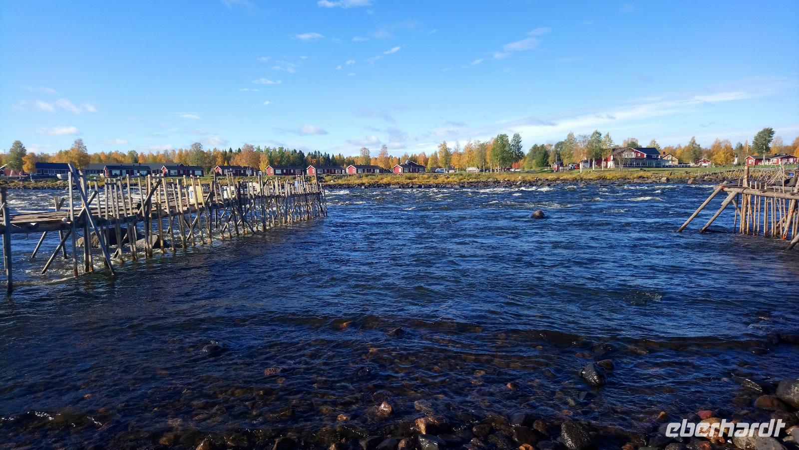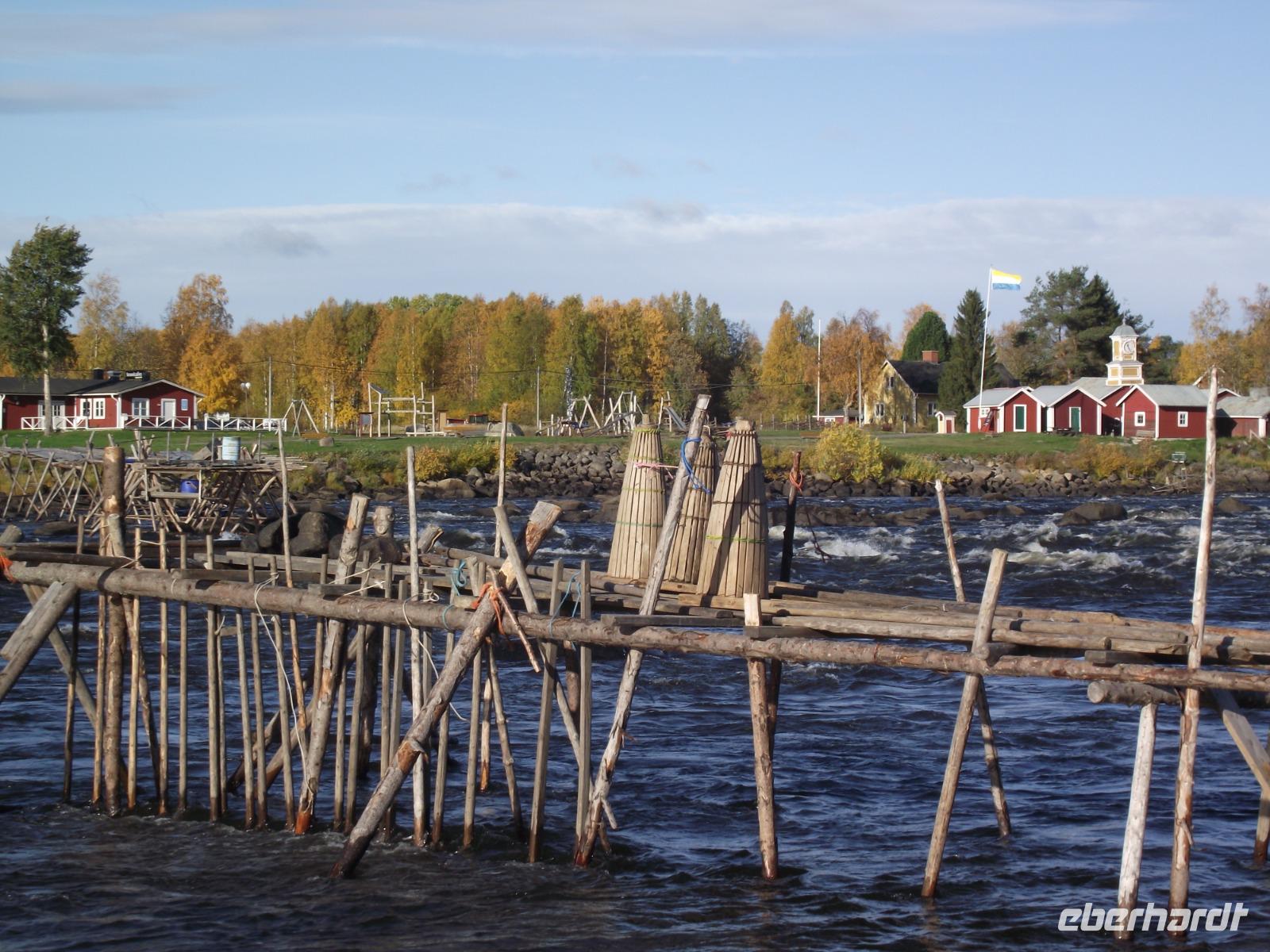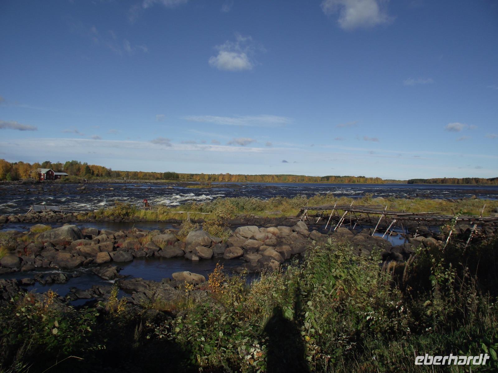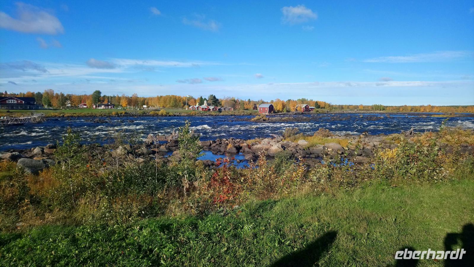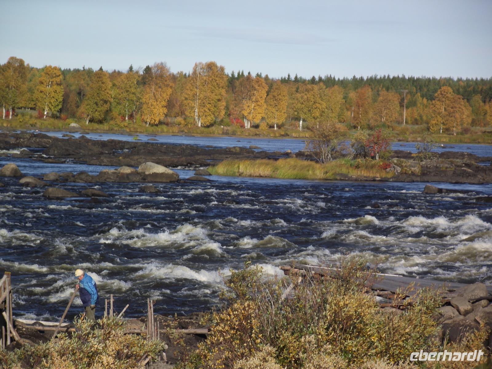 Bei strahlendem Sonnenschein und mit den ersten Herbststürmen ziehen wir weiter nach Torno. Nur wenige Kilometer nach der modernen Hafenstadt erreichen wir die Kukkoa Stromschnellen. Ein phantastischer Blick eröffnet sich uns. Das sprudelnde blaue Wasser, die farbigen Kleider der Fischer und die leuchtend roten Holzhäuser zeigen das Dorf von seiner schönsten Seite. Von Risto erfahren wir viel über die Tradition des Felchen Fischens in dieser Region in Lappland. Gegen Mittag dürfen wir diese am offenen Feuer gegrillte Fischspezialität auch probieren.
