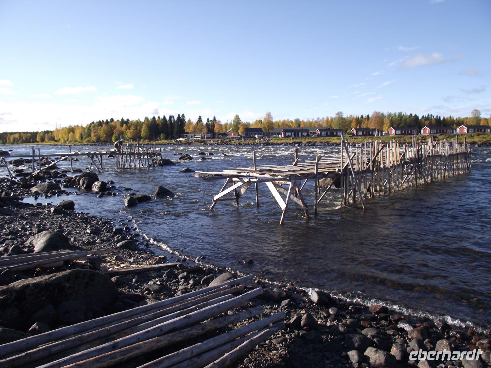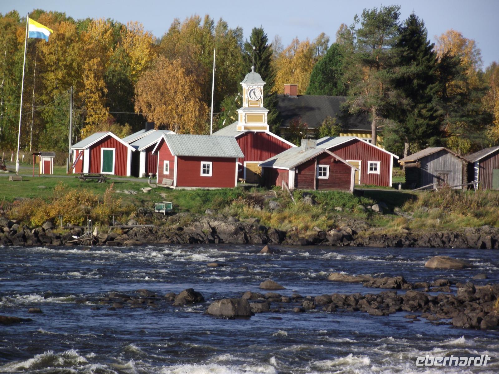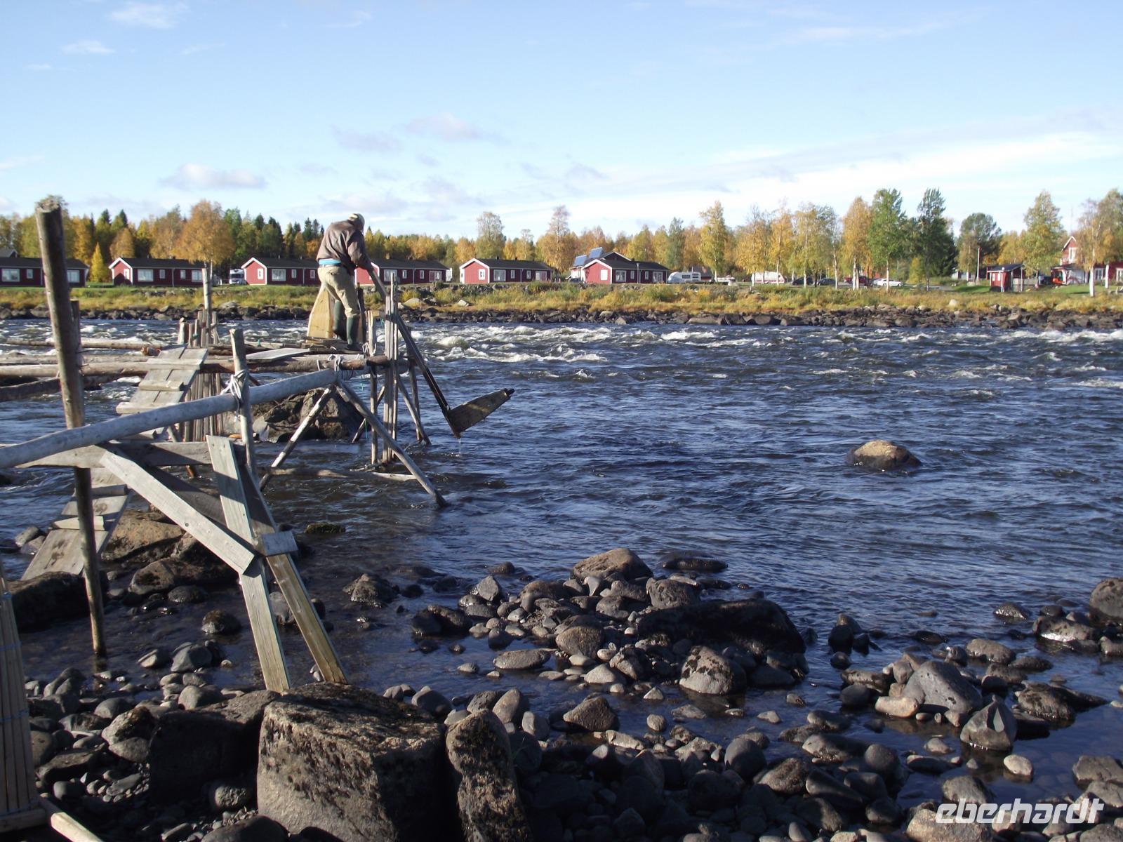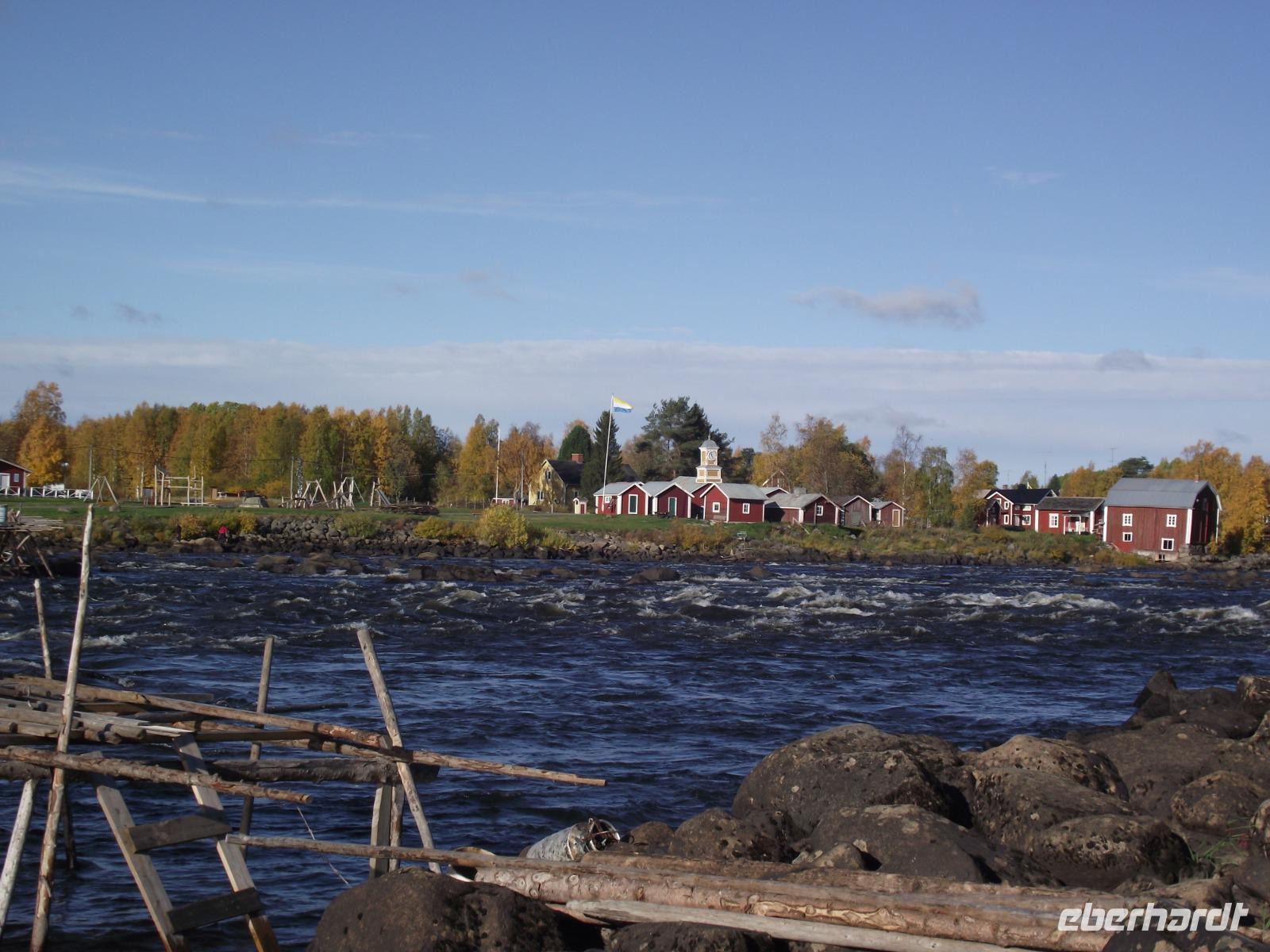 Bei strahlendem Sonnenschein und mit den ersten Herbststürmen ziehen wir weiter nach Torno. Nur wenige Kilometer nach der modernen Hafenstadt erreichen wir die Kukkoa Stromschnellen. Ein phantastischer Blick eröffnet sich uns. Das sprudelnde blaue Wasser, die farbigen Kleider der Fischer und die leuchtend roten Holzhäuser zeigen das Dorf von seiner schönsten Seite. Von Risto erfahren wir viel über die Tradition des Felchen Fischens in dieser Region in Lappland. Gegen Mittag dürfen wir diese am offenen Feuer gegrillte Fischspezialität auch probieren.
