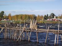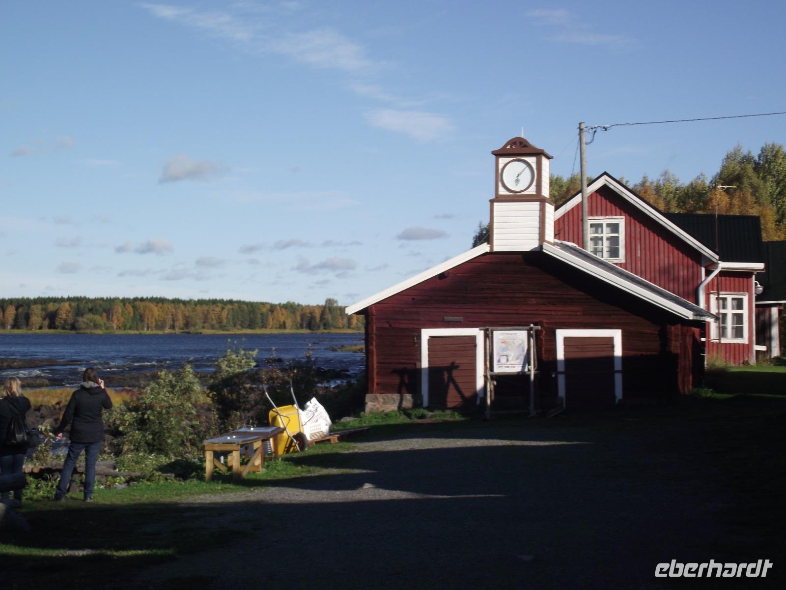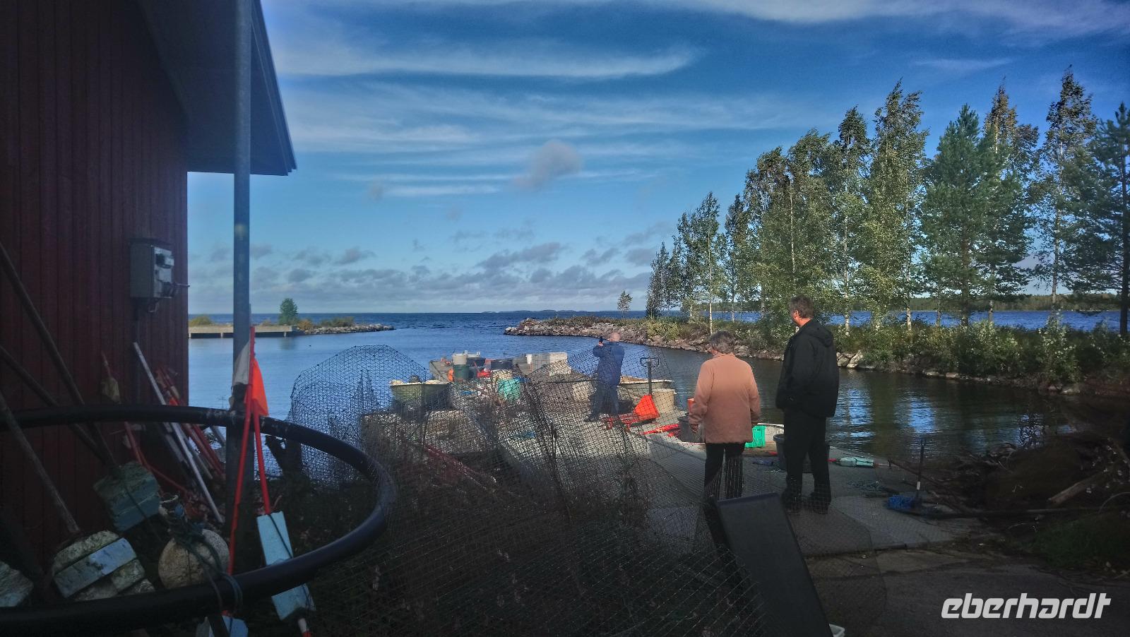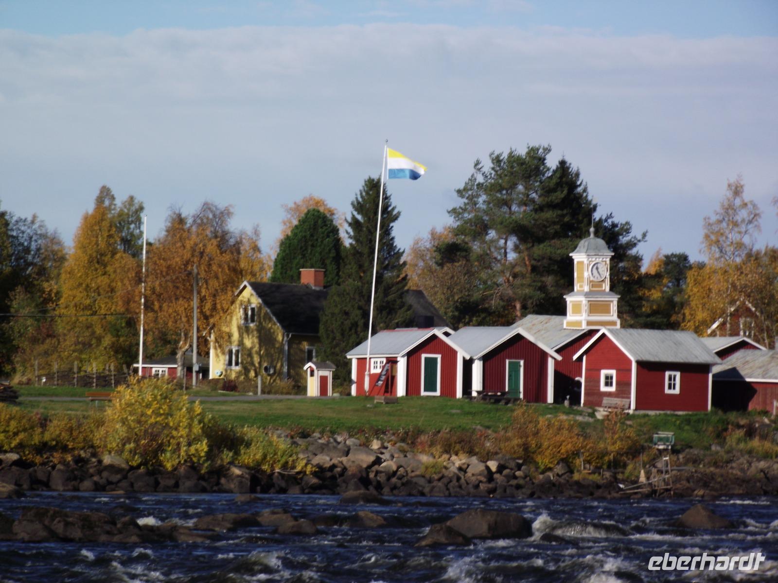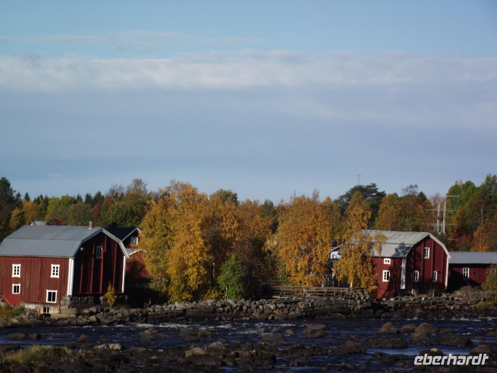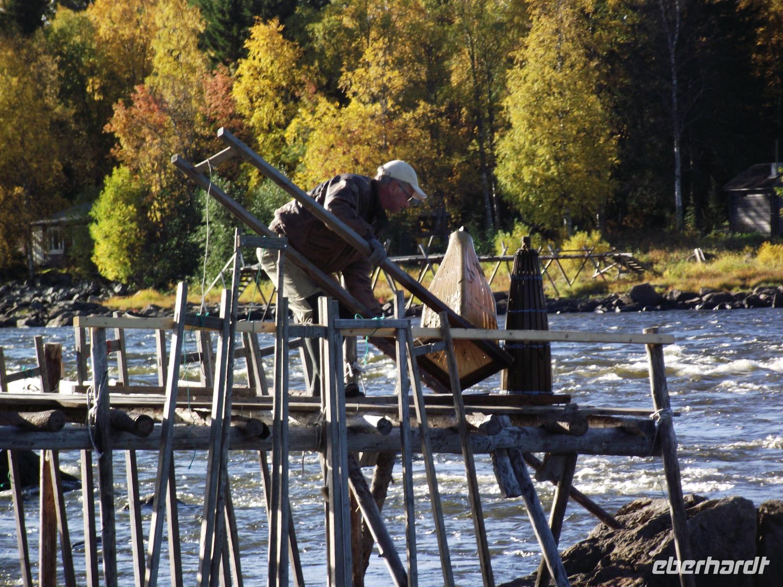 Bei strahlendem Sonnenschein und mit den ersten Herbststürmen ziehen wir weiter nach Torno. Nur wenige Kilometer nach der modernen Hafenstadt erreichen wir die Kukkoa Stromschnellen. Ein phantastischer Blick eröffnet sich uns. Das sprudelnde blaue Wasser, die farbigen Kleider der Fischer und die leuchtend roten Holzhäuser zeigen das Dorf von seiner schönsten Seite. Von Risto erfahren wir viel über die Tradition des Felchen Fischens in dieser Region in Lappland. Gegen Mittag dürfen wir diese am offenen Feuer gegrillte Fischspezialität auch probieren.