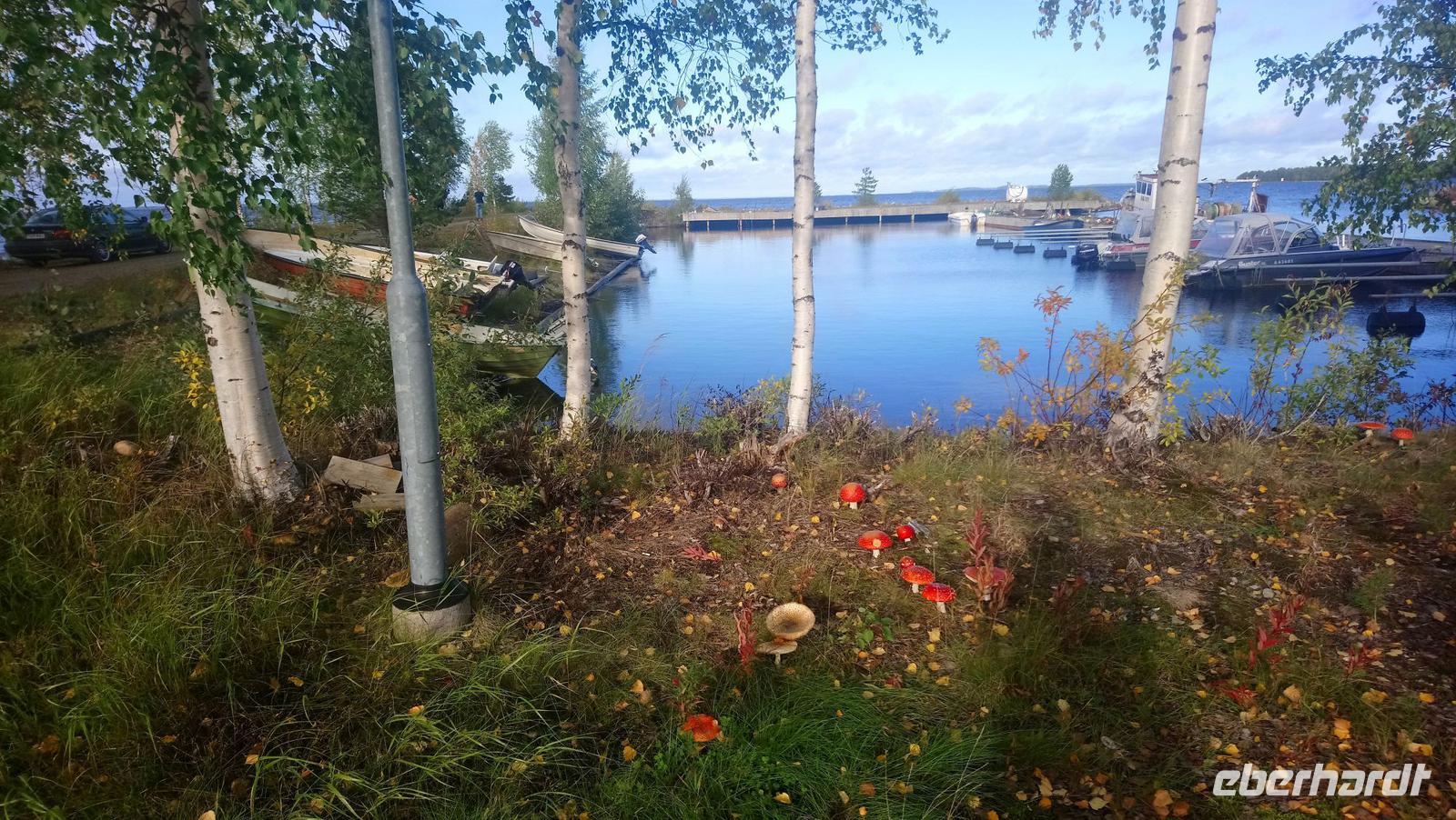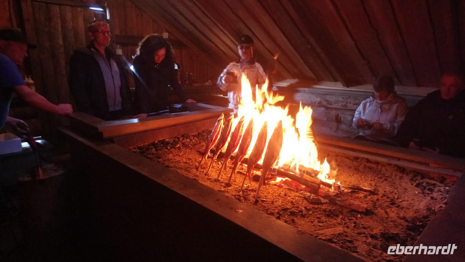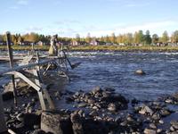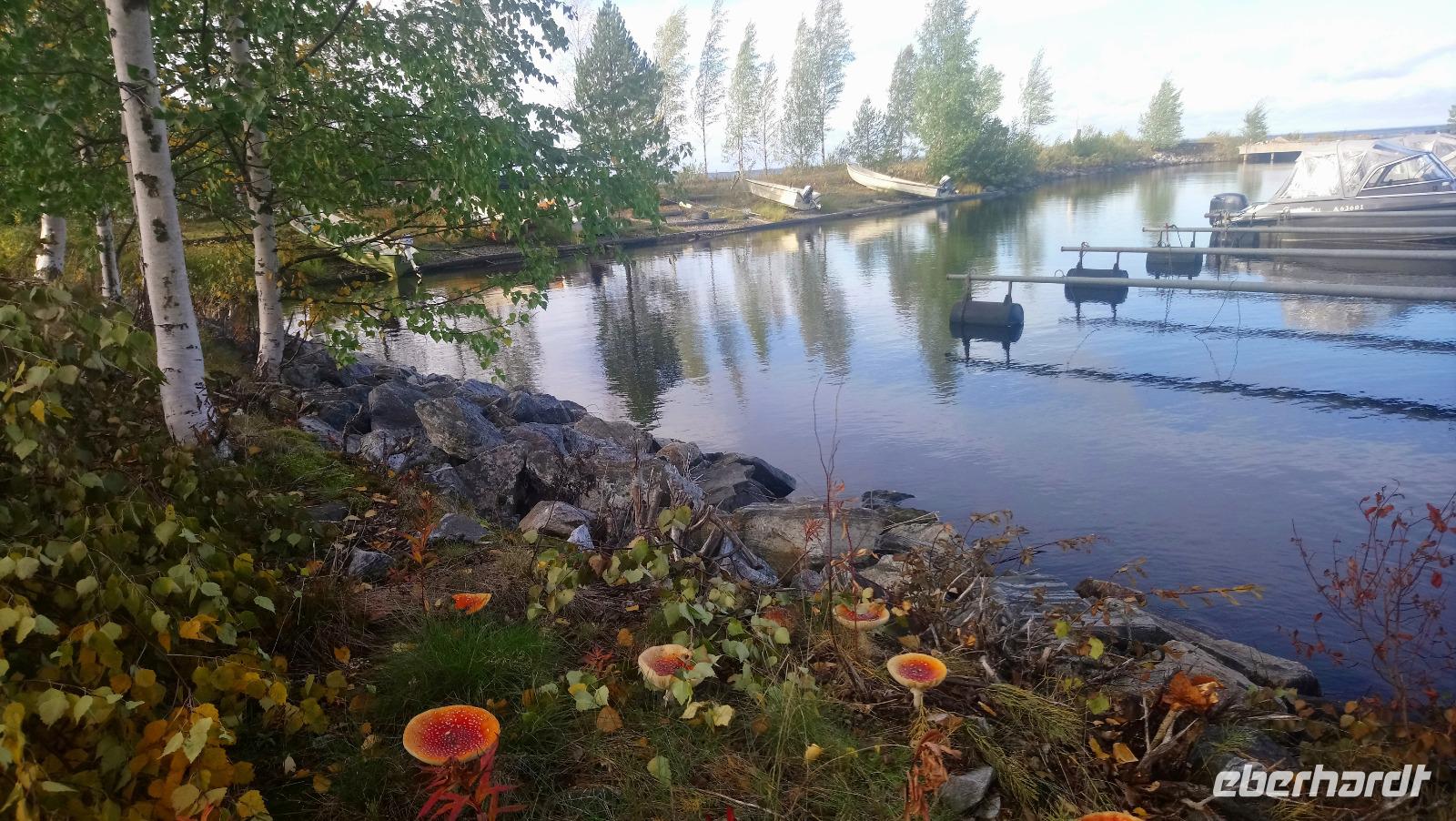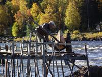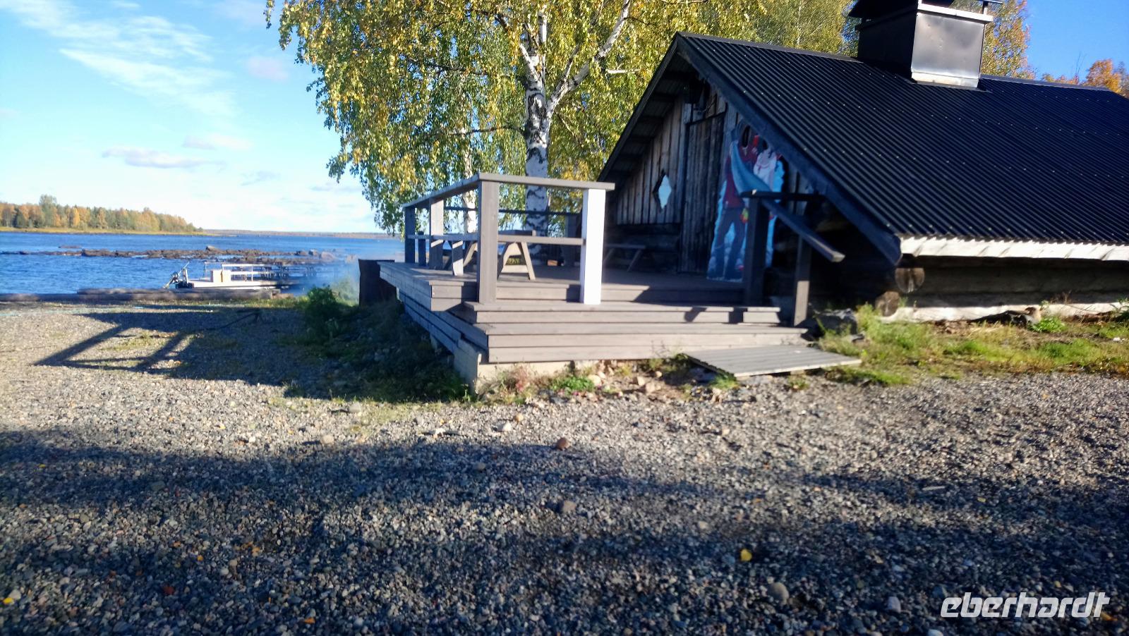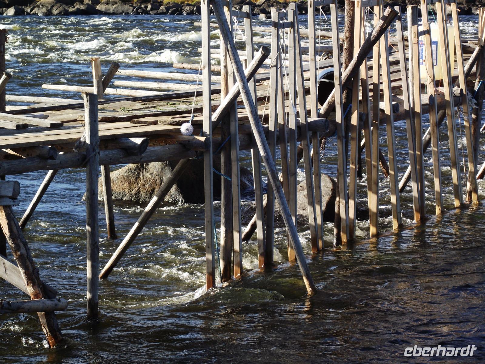 Bei strahlendem Sonnenschein und mit den ersten Herbststürmen ziehen wir weiter nach Torno. Nur wenige Kilometer nach der modernen Hafenstadt erreichen wir die Kukkoa Stromschnellen. Ein phantastischer Blick eröffnet sich uns. Das sprudelnde blaue Wasser, die farbigen Kleider der Fischer und die leuchtend roten Holzhäuser zeigen das Dorf von seiner schönsten Seite. Von Risto erfahren wir viel über die Tradition des Felchen Fischens in dieser Region in Lappland. Gegen Mittag dürfen wir diese am offenen Feuer gegrillte Fischspezialität auch probieren.
