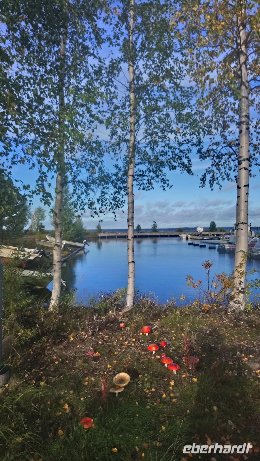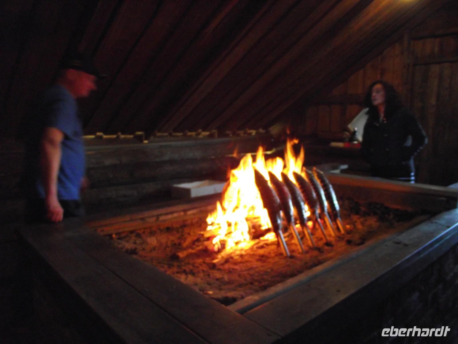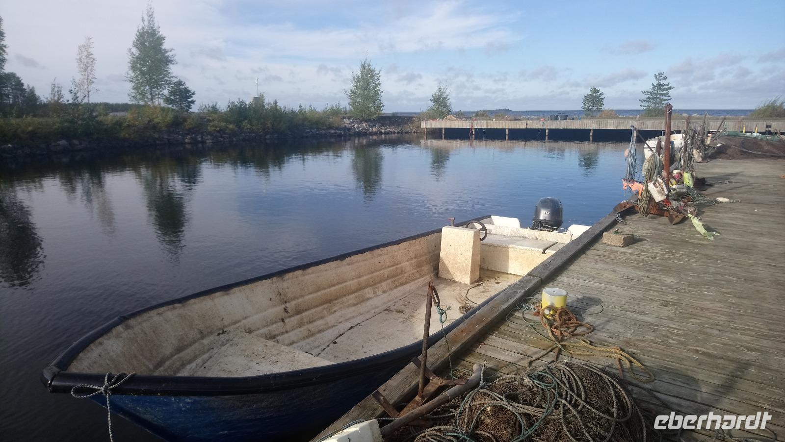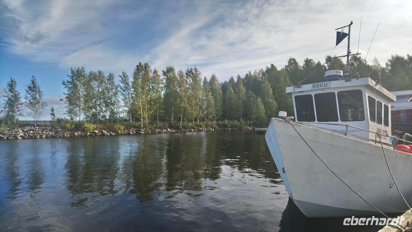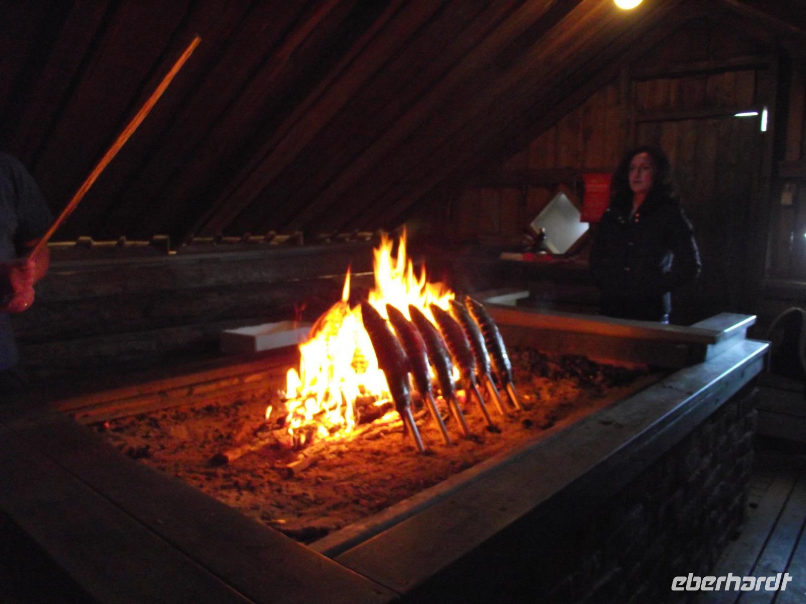 Bei strahlendem Sonnenschein und mit den ersten Herbststürmen ziehen wir weiter nach Torno. Nur wenige Kilometer nach der modernen Hafenstadt erreichen wir die Kukkoa Stromschnellen. Ein phantastischer Blick eröffnet sich uns. Das sprudelnde blaue Wasser, die farbigen Kleider der Fischer und die leuchtend roten Holzhäuser zeigen das Dorf von seiner schönsten Seite. Von Risto erfahren wir viel über die Tradition des Felchen Fischens in dieser Region in Lappland. Gegen Mittag dürfen wir diese am offenen Feuer gegrillte Fischspezialität auch probieren.