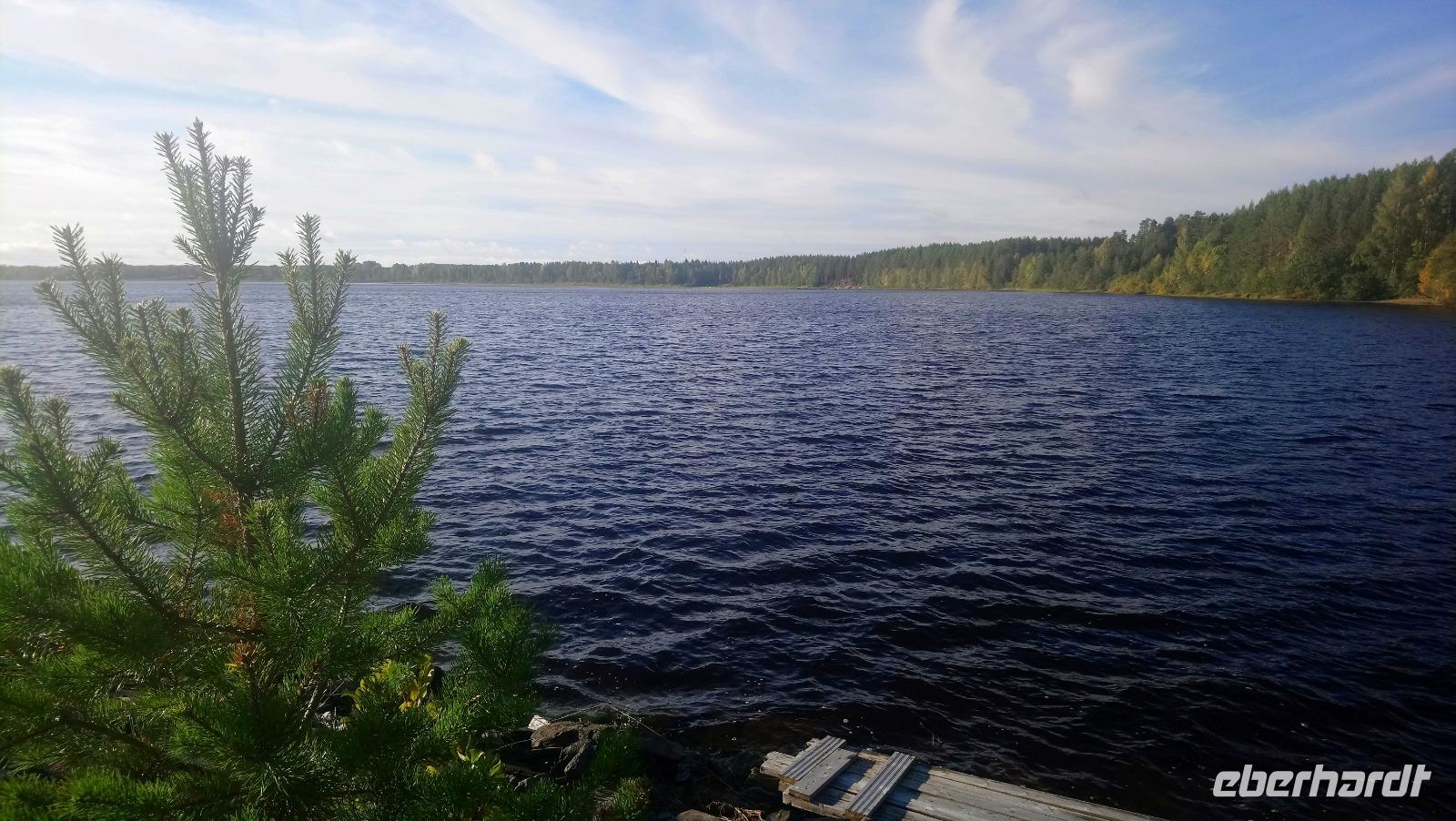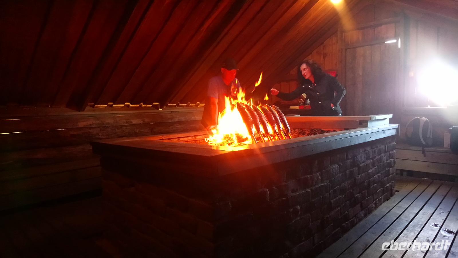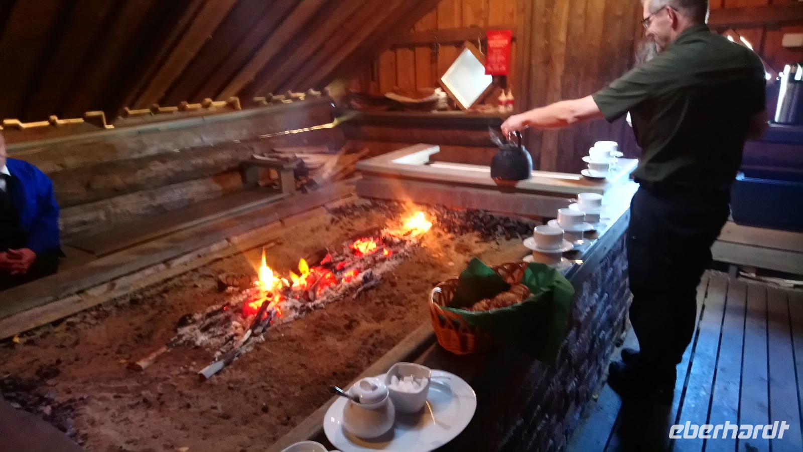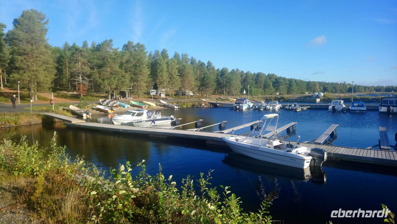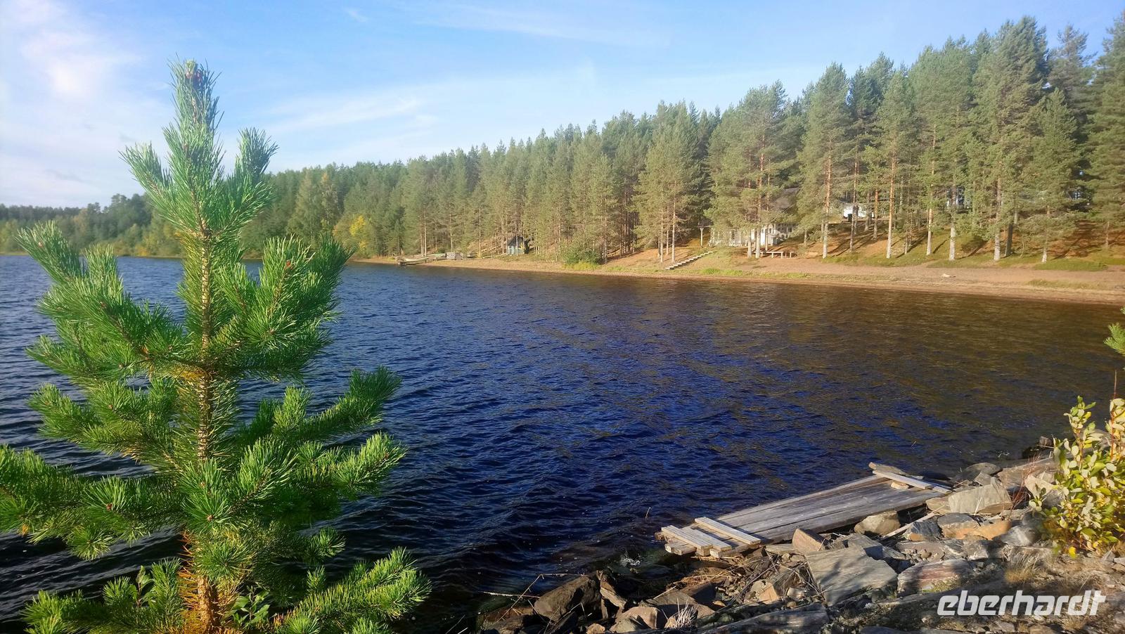 Bei strahlendem Sonnenschein und mit den ersten Herbststürmen ziehen wir weiter nach Torno. Nur wenige Kilometer nach der modernen Hafenstadt erreichen wir die Kukkoa Stromschnellen. Ein phantastischer Blick eröffnet sich uns. Das sprudelnde blaue Wasser, die farbigen Kleider der Fischer und die leuchtend roten Holzhäuser zeigen das Dorf von seiner schönsten Seite. Von Risto erfahren wir viel über die Tradition des Felchen Fischens in dieser Region in Lappland. Gegen Mittag dürfen wir diese am offenen Feuer gegrillte Fischspezialität auch probieren.