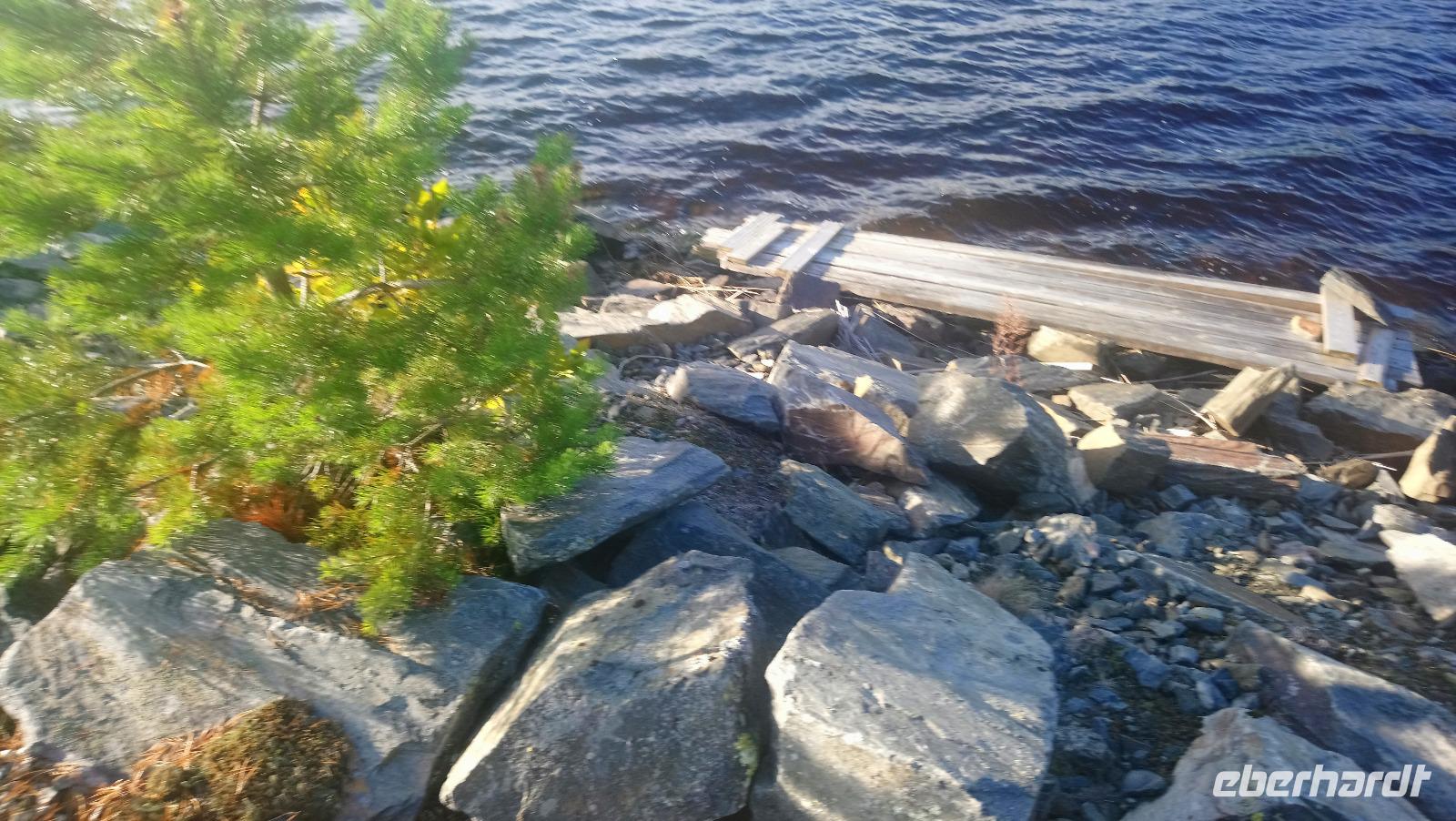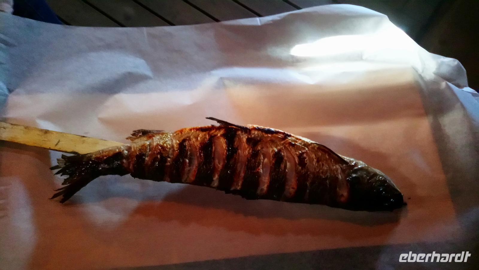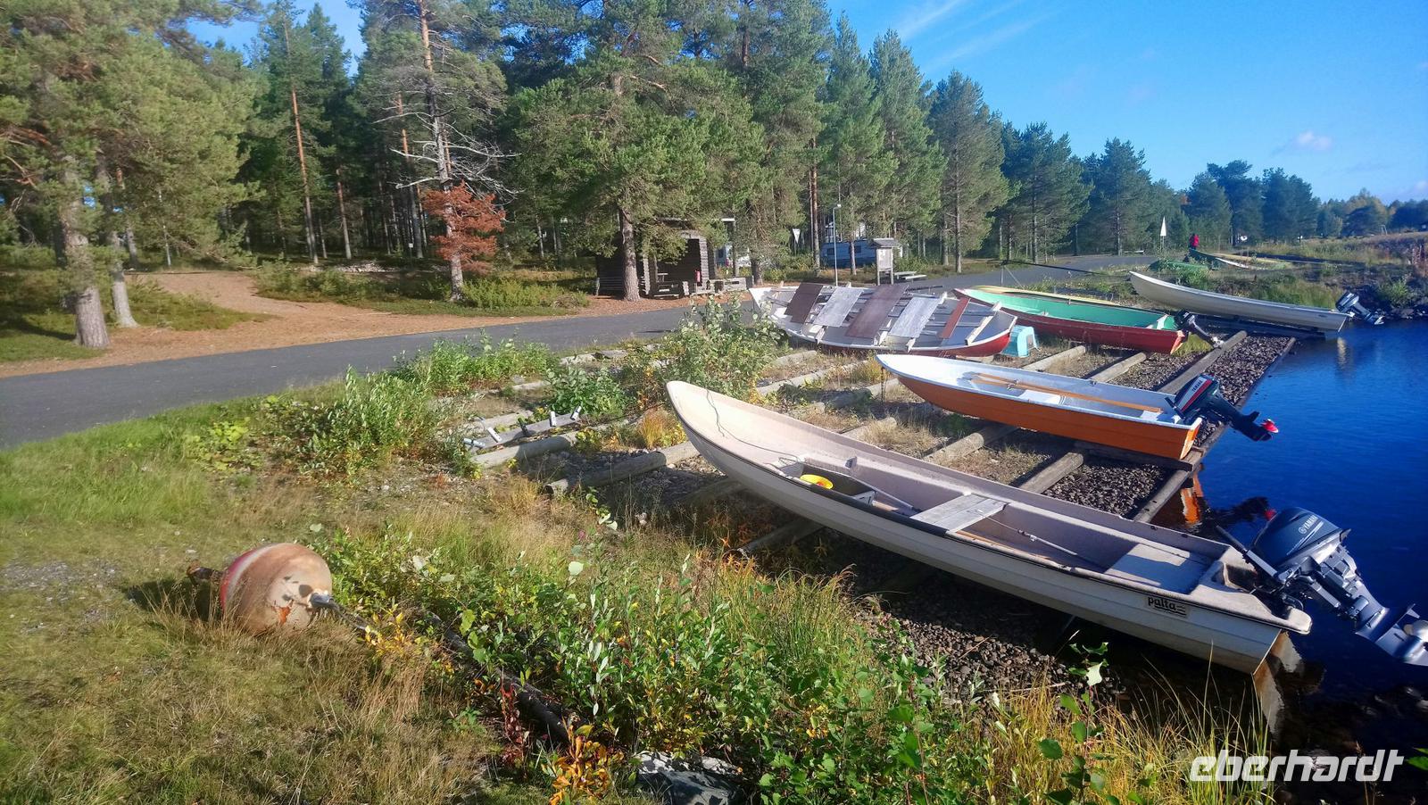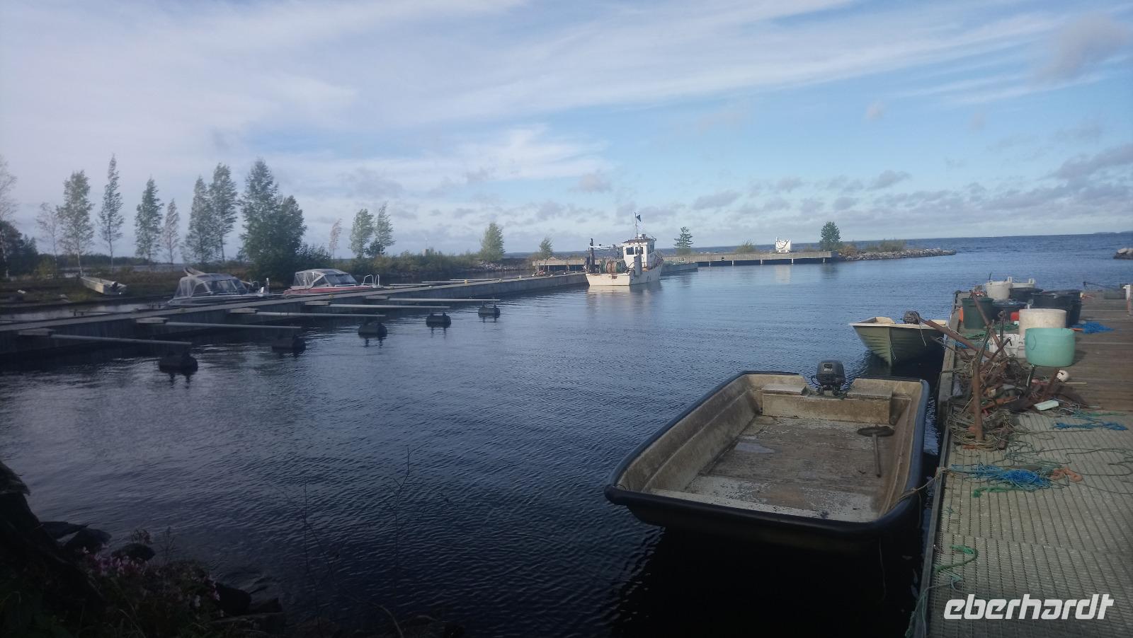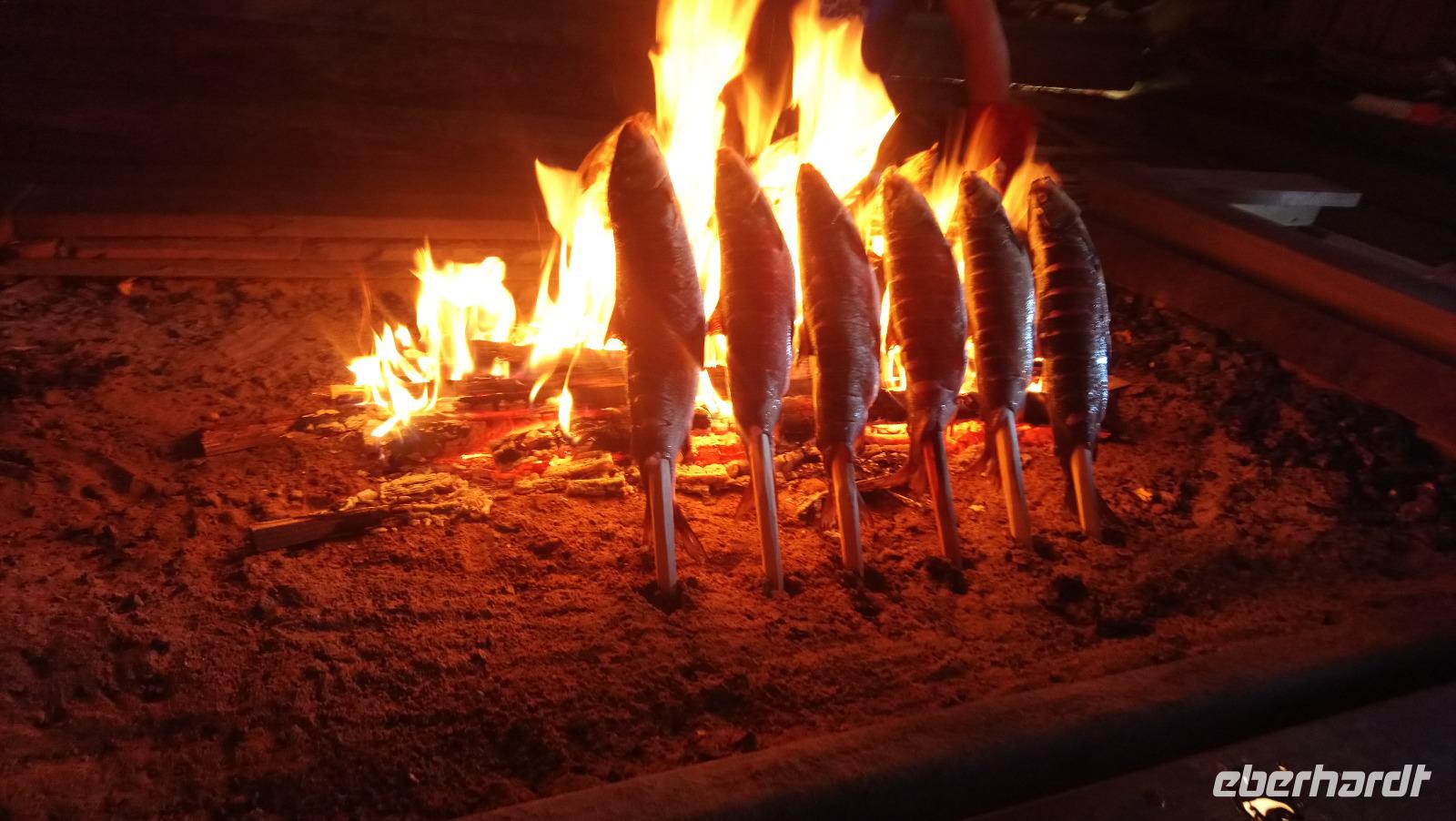 Bei strahlendem Sonnenschein und mit den ersten Herbststürmen ziehen wir weiter nach Torno. Nur wenige Kilometer nach der modernen Hafenstadt erreichen wir die Kukkoa Stromschnellen. Ein phantastischer Blick eröffnet sich uns. Das sprudelnde blaue Wasser, die farbigen Kleider der Fischer und die leuchtend roten Holzhäuser zeigen das Dorf von seiner schönsten Seite. Von Risto erfahren wir viel über die Tradition des Felchen Fischens in dieser Region in Lappland. Gegen Mittag dürfen wir diese am offenen Feuer gegrillte Fischspezialität auch probieren.