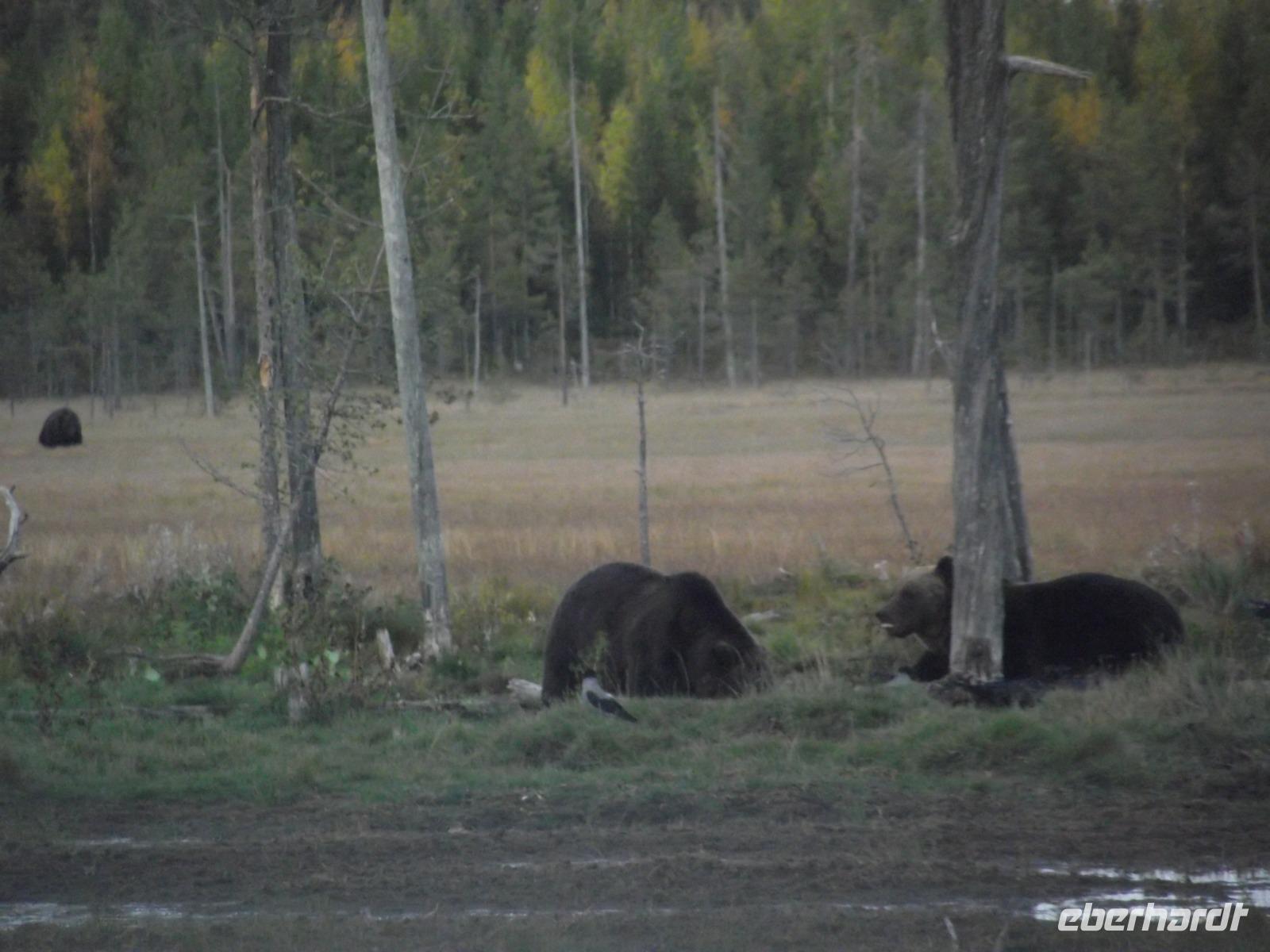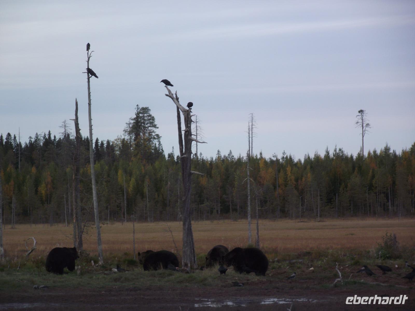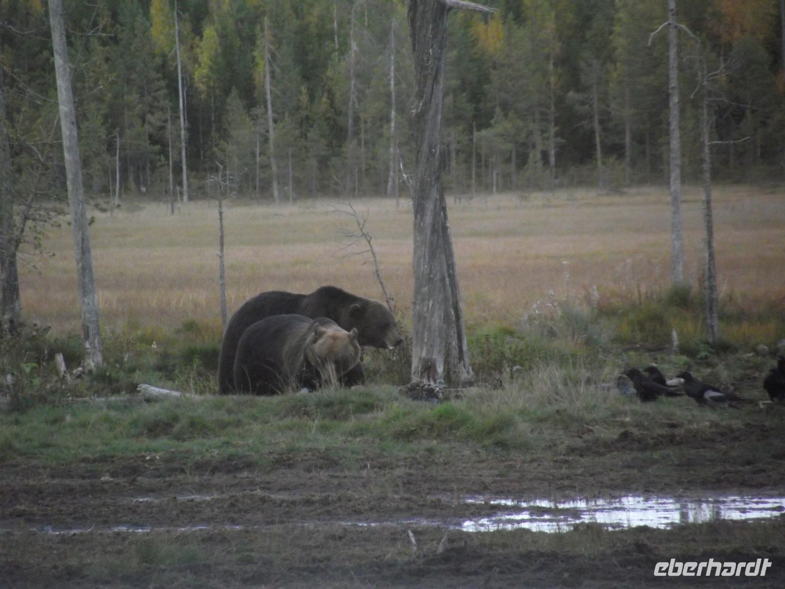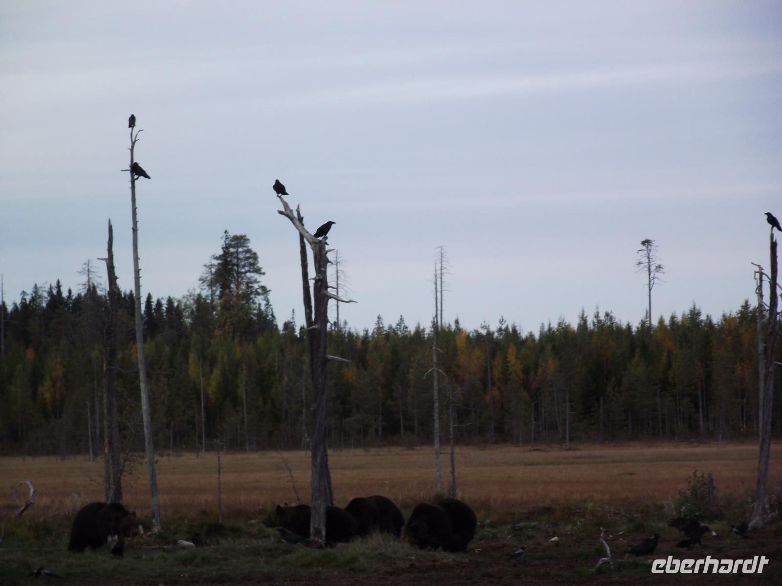 Heute fällt uns das Abschiednehmen von dem gemütlichen Waldhotel richtig schwer. Die Sonne scheint strahlend, Pilze locken überall in Massen zum aufsammeln und die Stille ist grandios. Eine gute Ausgangslage für einige Stopps bei unserer Weiterreise nach Vuakatti. Einem Insidertip von Thomas folgend, stoppen wir auf der Manamsalo Insel auf dem Oulusee. Beeindruckende Fotomotive wie eine Waldkirche, jahrtausendalte Felsformationen aus Gneis und verträumte Häfen bieten sich uns. Am Mittag erreichen wir unsere Hotelanlage Katinkulta in Vuokatti. Es bleibt Zeit, um die geräumigen Zimmer zu beziehen um dann mit einem Minibus weiter zu reisen nach Kuhmo. Kurz vor Kuhmo biegen wir ab und gelangen über Waldstraßen an die russische Grenze. Noch liegt ein kurzer Fußmarsch vor uns, ehe wir die Holzhütte für die Bärenbeobachtungen erreichen. Von nun an hieß es schweigen. Wir hatten Glück. Es dauerte keine 10 Minuten bis sich Lasse, dem berühmten Naturfotografen und uns viele Braunbären als Fotomotive präsentierten.