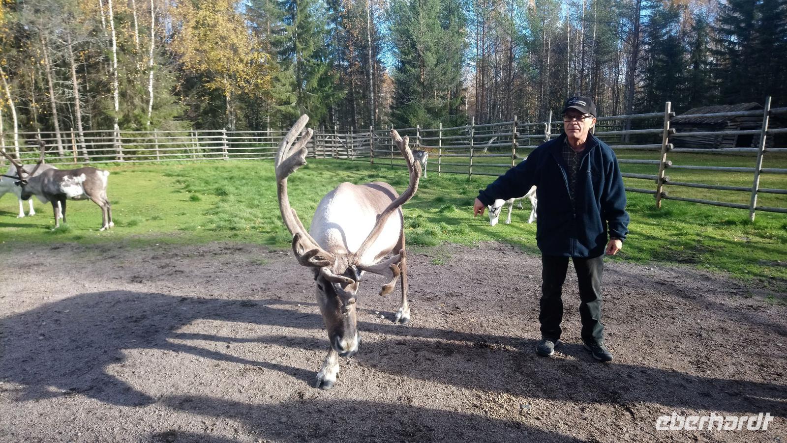 Am Nachmittag besuchen wir Janni auf der Rentierfarm in Rovaniemi. Nach entsprechender Anleitung dürfen wir die Rens nicht nur berühren sondern auch füttern. Bei einer Tasse Kaffee oder Tee berichtet Janni sehr unterhaltsam von seinen Erfahrungen mit den Rentieren. Allen Gästen fällt es schwer von diesem gastlichen Platz Abschied zu nehmen.