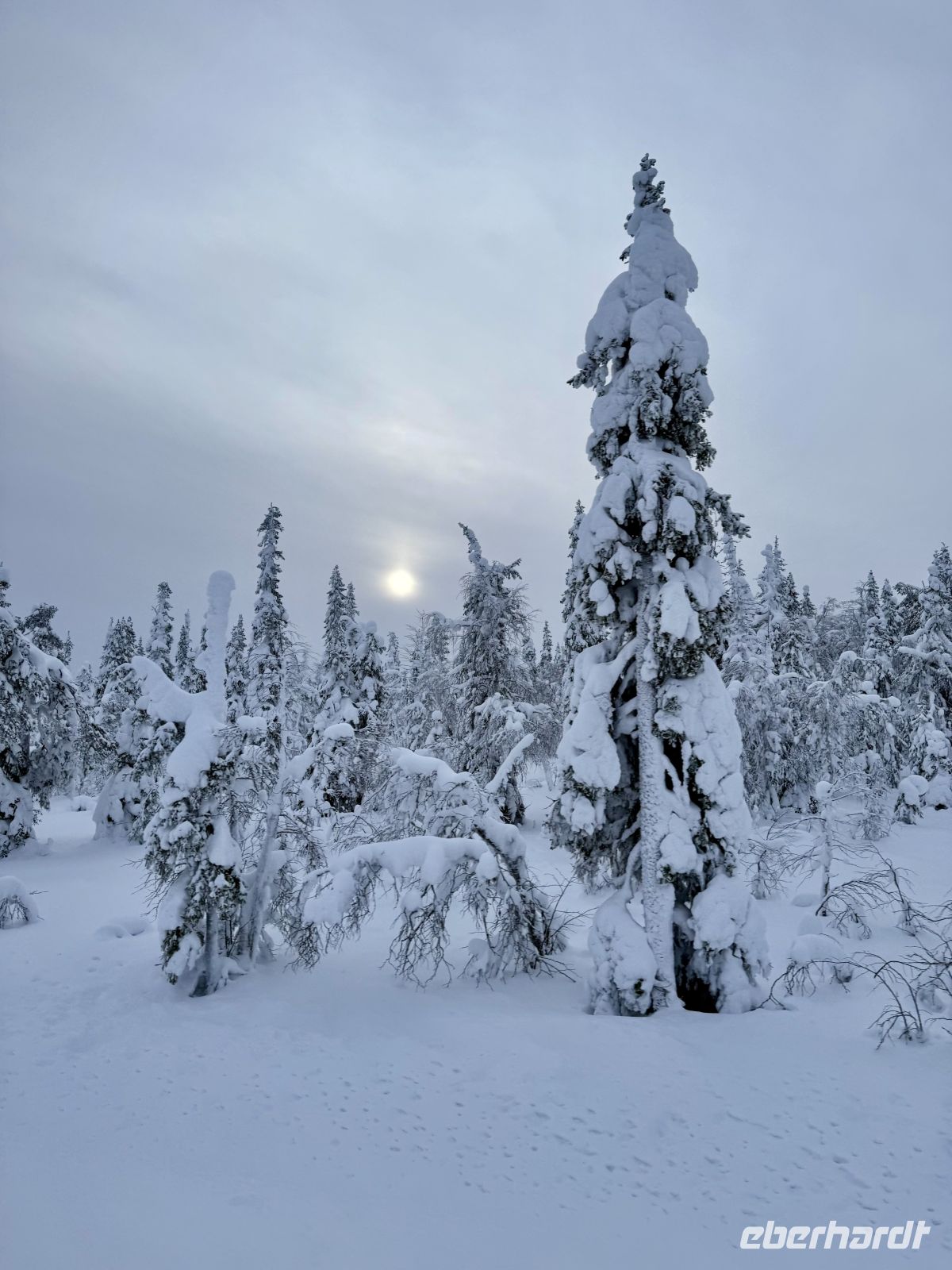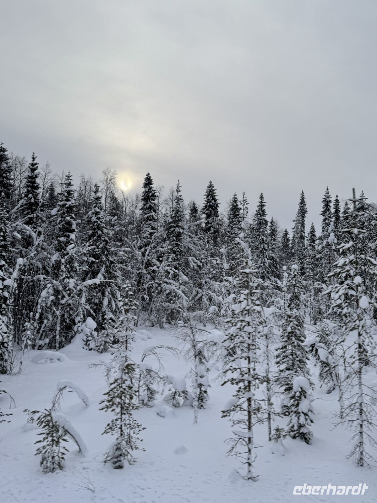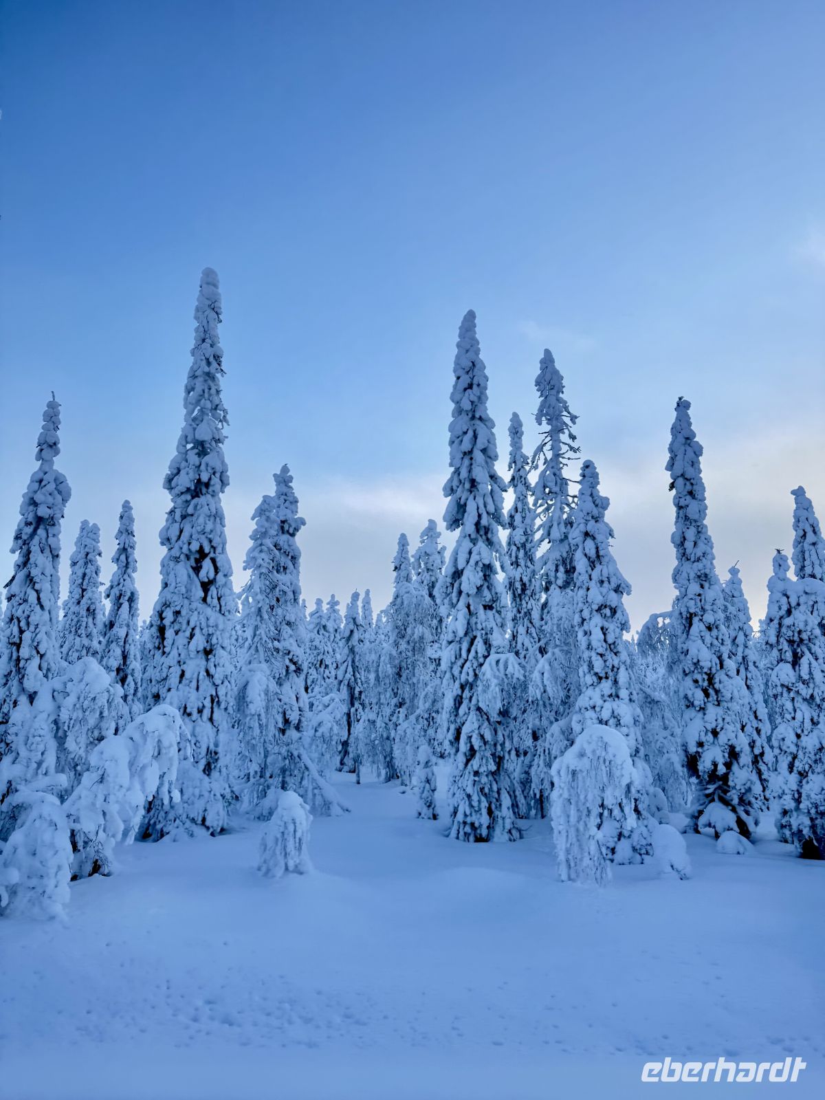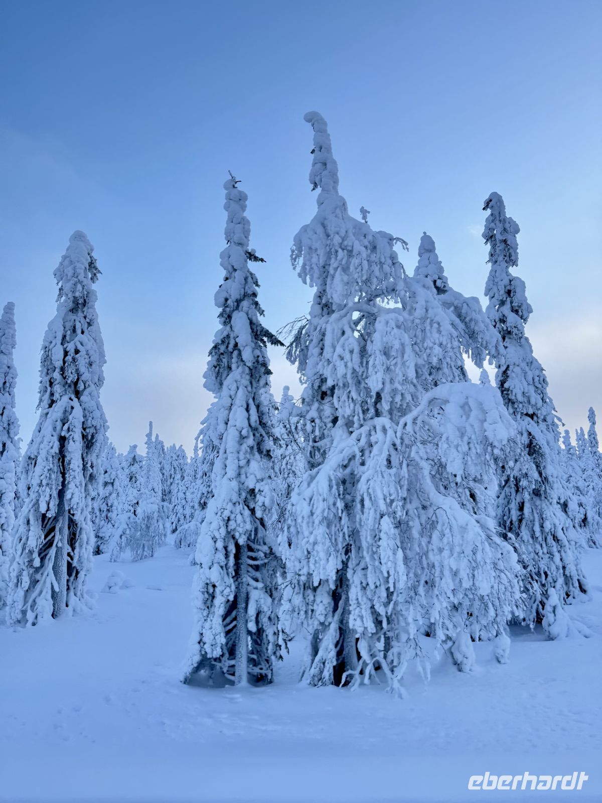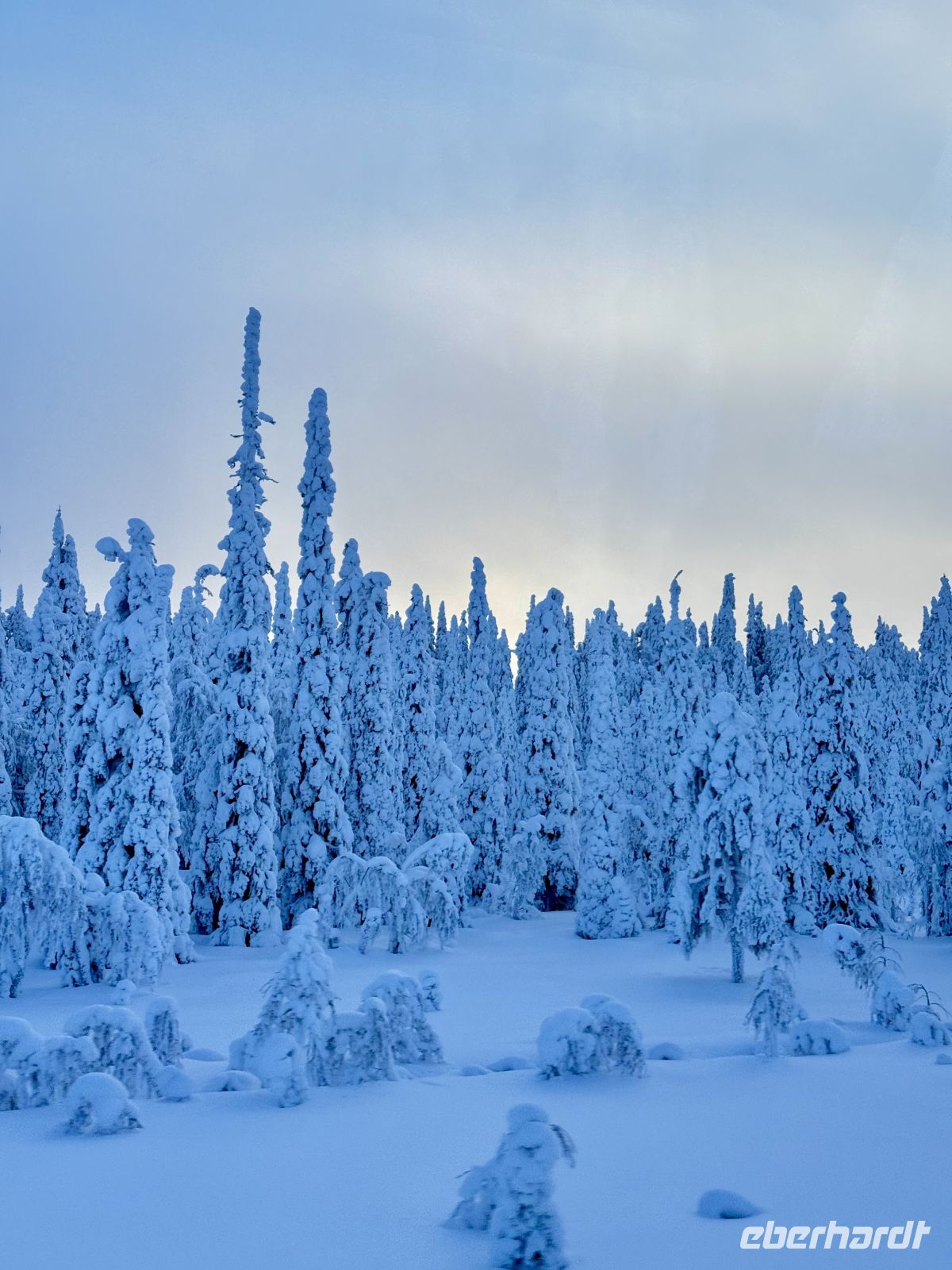 Mir schien es schon immer, dass eine Reise wie ein kurzes Leben innerhalb des ohnehin schon kurzen Lebens ist, das wir führen. Wo die Gegenwart nur ein Augenblick ist. Und das Überraschende an beiden „Leben“ ist ihre Fähigkeit, uns zu erstaunen. Wenn wir glauben, einen Gipfel der Euphorie erreicht zu haben, umgeben von wilder Natur, angenehmer Gesellschaft und Traumlandschaften, bricht ein neuer Tag an, der uns eine Lektion erteilen will, indem er die Schönheit des Vortages bei weitem übertrifft. Und genau so war unser Tag heute. Nachdem wir am Vortag die Hundeschlittenfahrt genossen hatten und dachten, das sei wohl das Schönste, was wir auf dieser Reise erleben würden, kam überraschend – zumindest für jene, die es nicht erwarteten – eine unvergleichliche Wanderung. Wenige Minuten genügten, um uns mit einer Panorama-Seilbahn auf den Berg zu bringen, eine Fahrt, die wir jede Minute genossen. Doch die größte Überraschung erwartete uns auf dem Gipfel: eine völlig andere Landschaft, buchstäblich wie aus einem Märchen. Die Arktis fühlte sich in diesem Moment nah an, denn vor unseren Augen lag ein Wald, der fast vollständig unter dem Schnee begraben war. Die Unwirtlichkeit und zugleich die Schönheit des Klimas spiegelten sich in einer Postkarte wider, die sich vor uns enthüllte. Voller Emotionen wagten wir uns in diesen magischen Wald, natürlich mit Schneeschuhen, damit wir nicht ein paar Meter tief im Schnee versinken würden, der weiß und geduldig alles mit seinem weichen Mantel bedeckte. Hier und da unglaubliche Ausblicke, „schlafende Riesen“, die wie Bäume unter einem ewigen Mantel wirken, in dieser neuen magischen Welt, die wir gerade erst entdeckt haben. Wir stahlen mit einem „Klick“ bereitwillig Bilder, immer in der Hoffnung, dass die Erinnerung so länger anhält oder dass dieses Bild bezeugen kann, was für einen gewöhnlichen Sterblichen sonst wie eine verrückte Beschreibung klingen mag. Die Stunden vergingen; die zweite Hälfte des Tages war ebenso schön, aber in verschiedene Richtungen verteilt: einige auf dem Fahrrad, andere zu Fuß, an dem einen oder anderen Punkt trafen wir uns wieder und entdeckten dieses kleine weiße Stück Erde, das uns so viel zu zeigen hatte.