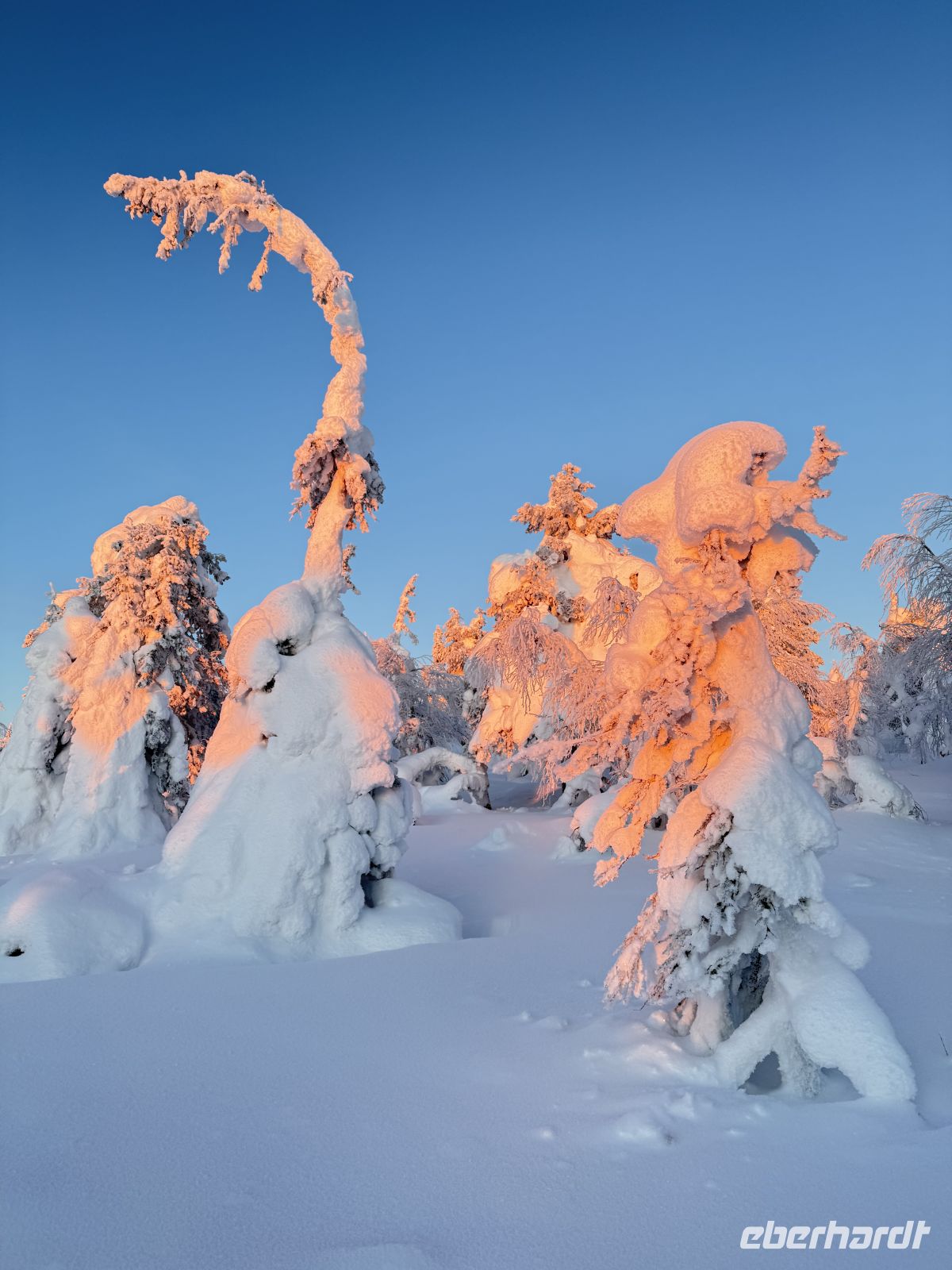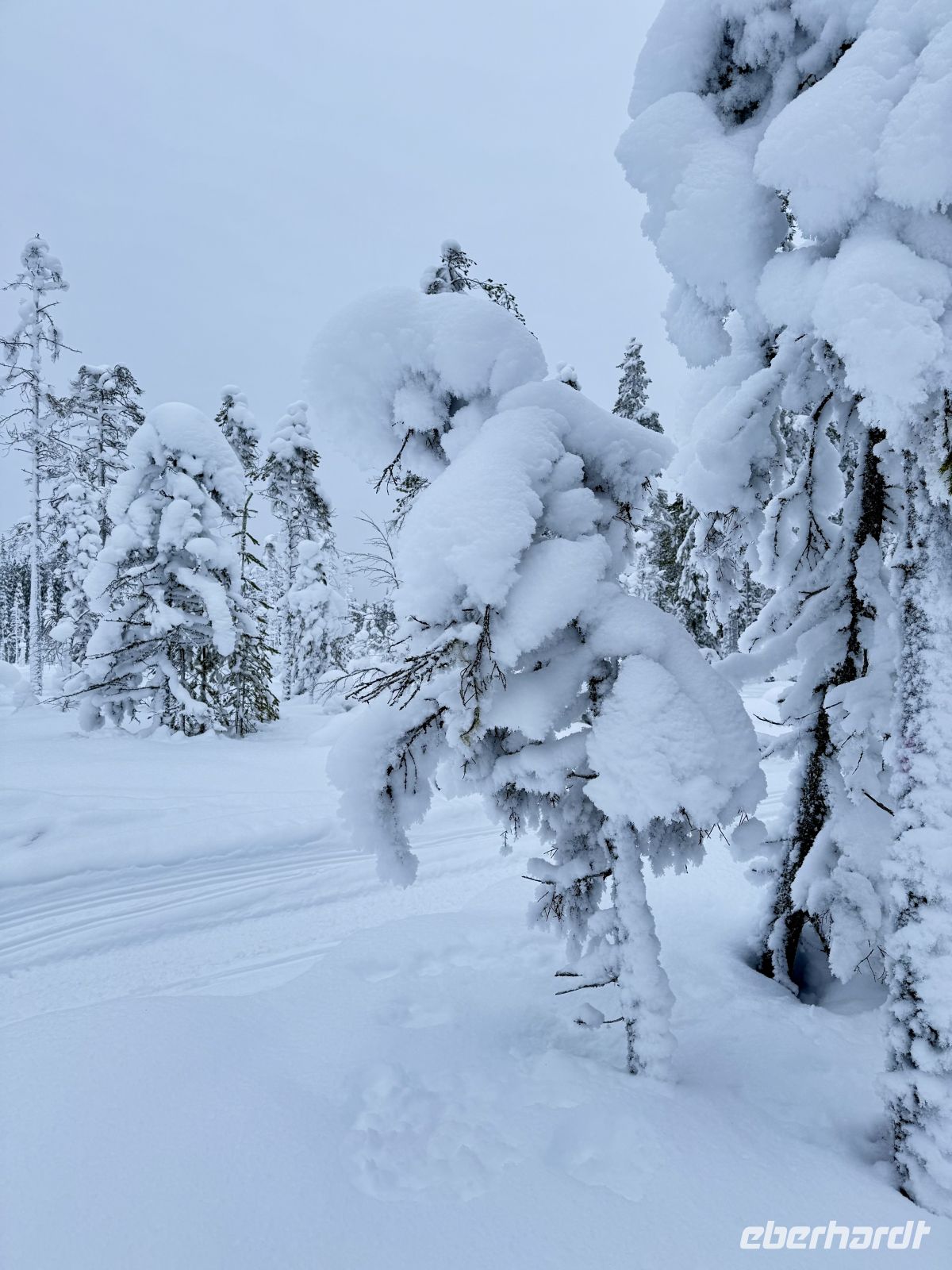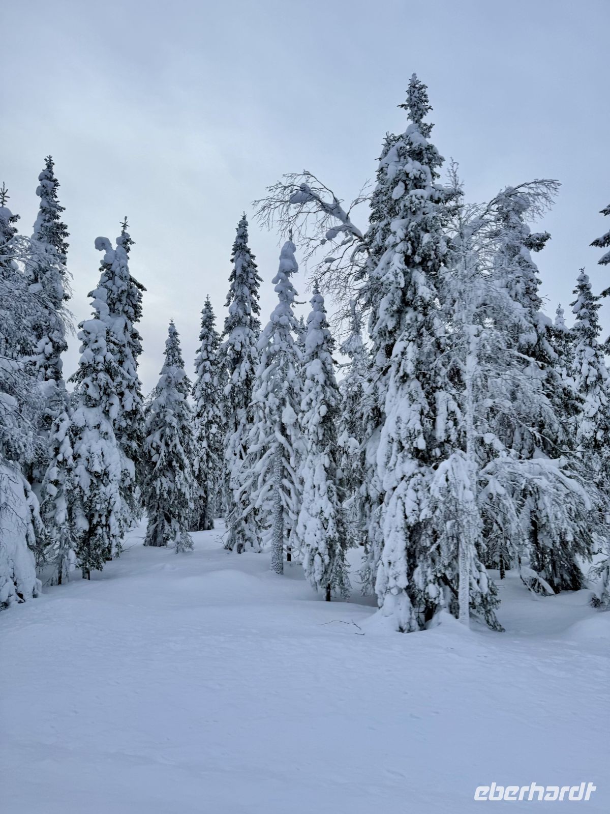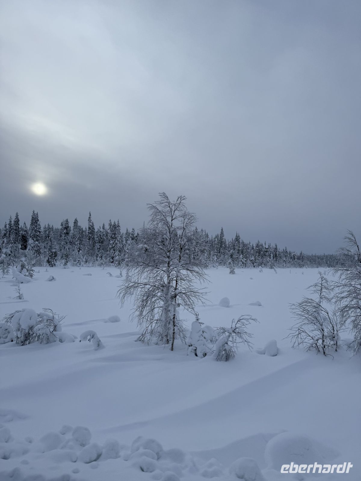 Mir schien es schon immer, dass eine Reise wie ein kurzes Leben innerhalb des ohnehin schon kurzen Lebens ist, das wir führen. Wo die Gegenwart nur ein Augenblick ist. Und das Überraschende an beiden „Leben“ ist ihre Fähigkeit, uns zu erstaunen. Wenn wir glauben, einen Gipfel der Euphorie erreicht zu haben, umgeben von wilder Natur, angenehmer Gesellschaft und Traumlandschaften, bricht ein neuer Tag an, der uns eine Lektion erteilen will, indem er die Schönheit des Vortages bei weitem übertrifft. Und genau so war unser Tag heute. Nachdem wir am Vortag die Hundeschlittenfahrt genossen hatten und dachten, das sei wohl das Schönste, was wir auf dieser Reise erleben würden, kam überraschend – zumindest für jene, die es nicht erwarteten – eine unvergleichliche Wanderung. Wenige Minuten genügten, um uns mit einer Panorama-Seilbahn auf den Berg zu bringen, eine Fahrt, die wir jede Minute genossen. Doch die größte Überraschung erwartete uns auf dem Gipfel: eine völlig andere Landschaft, buchstäblich wie aus einem Märchen. Die Arktis fühlte sich in diesem Moment nah an, denn vor unseren Augen lag ein Wald, der fast vollständig unter dem Schnee begraben war. Die Unwirtlichkeit und zugleich die Schönheit des Klimas spiegelten sich in einer Postkarte wider, die sich vor uns enthüllte. Voller Emotionen wagten wir uns in diesen magischen Wald, natürlich mit Schneeschuhen, damit wir nicht ein paar Meter tief im Schnee versinken würden, der weiß und geduldig alles mit seinem weichen Mantel bedeckte. Hier und da unglaubliche Ausblicke, „schlafende Riesen“, die wie Bäume unter einem ewigen Mantel wirken, in dieser neuen magischen Welt, die wir gerade erst entdeckt haben. Wir stahlen mit einem „Klick“ bereitwillig Bilder, immer in der Hoffnung, dass die Erinnerung so länger anhält oder dass dieses Bild bezeugen kann, was für einen gewöhnlichen Sterblichen sonst wie eine verrückte Beschreibung klingen mag. Die Stunden vergingen; die zweite Hälfte des Tages war ebenso schön, aber in verschiedene Richtungen verteilt: einige auf dem Fahrrad, andere zu Fuß, an dem einen oder anderen Punkt trafen wir uns wieder und entdeckten dieses kleine weiße Stück Erde, das uns so viel zu zeigen hatte.