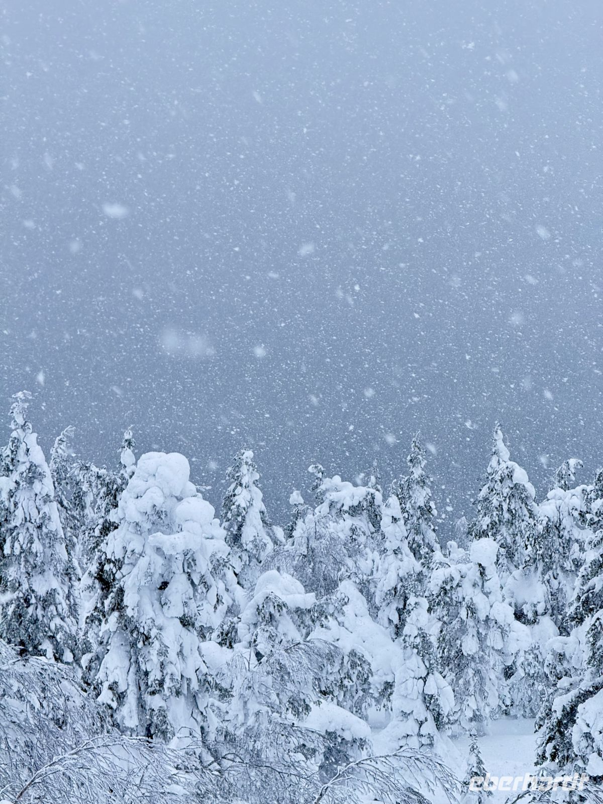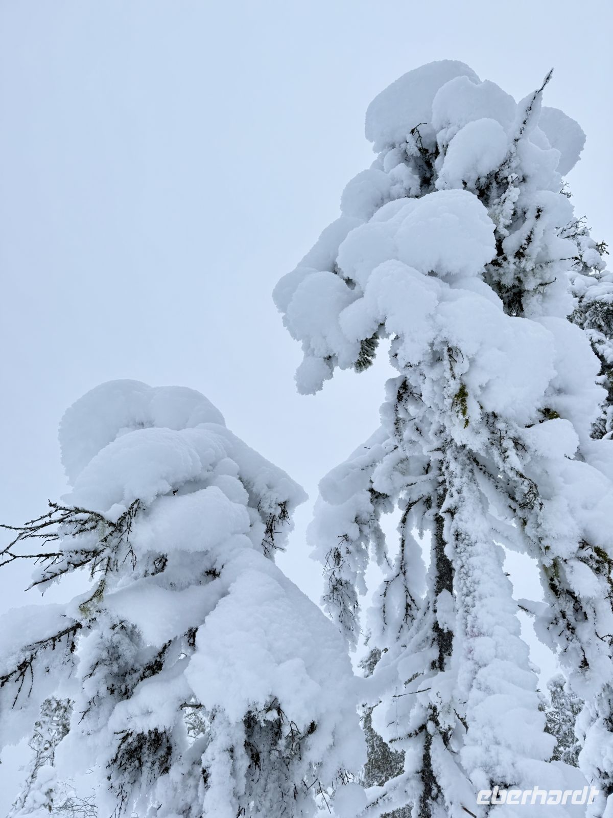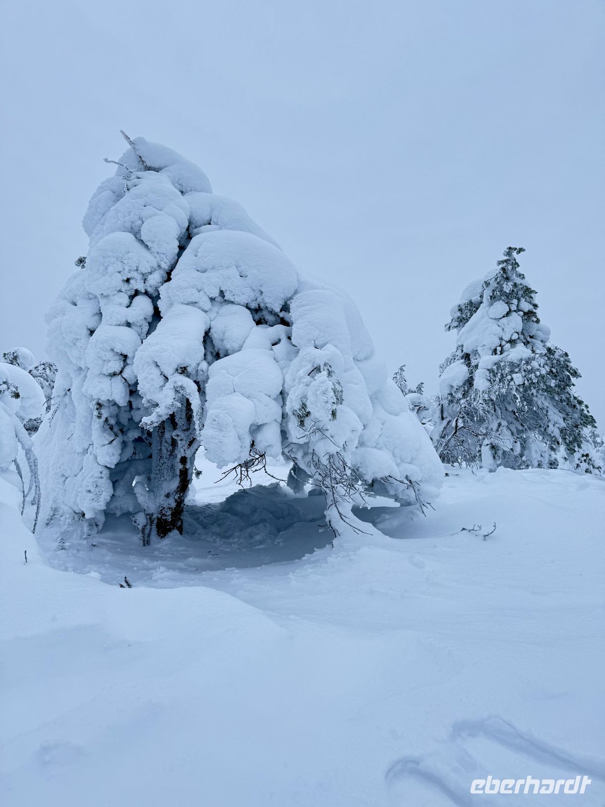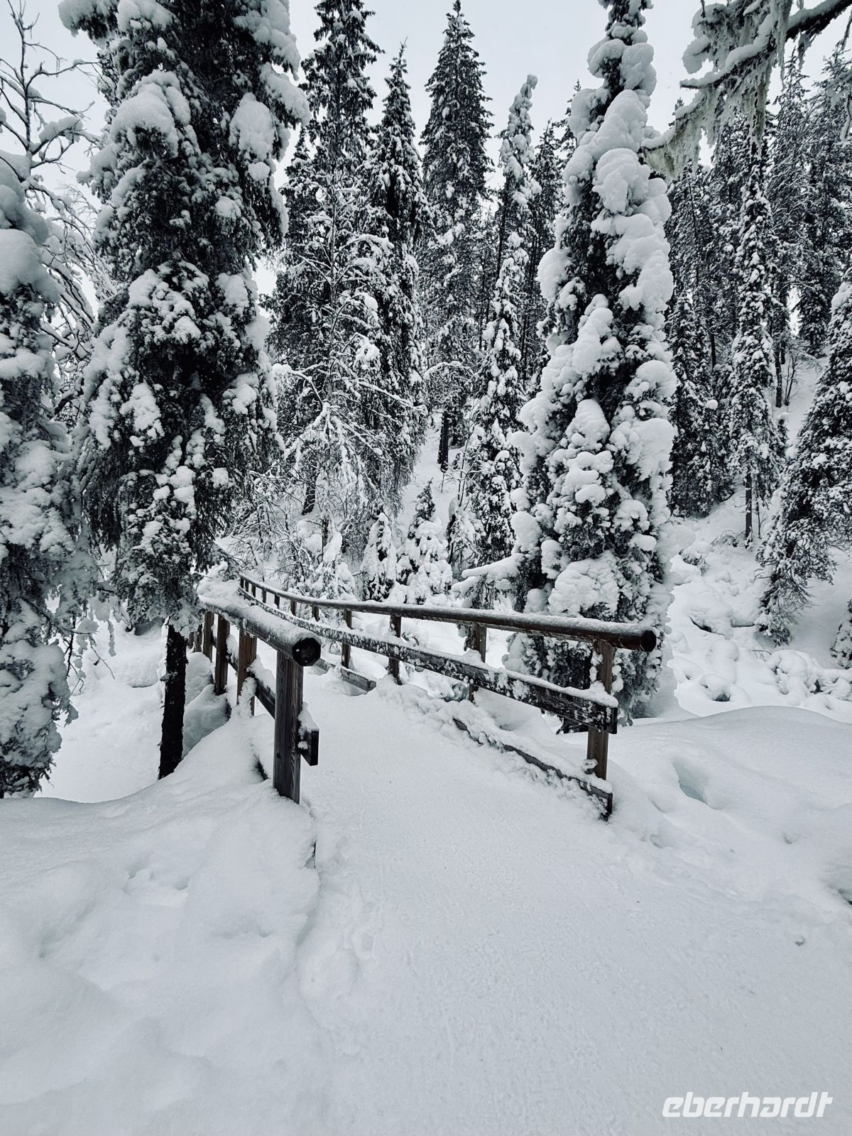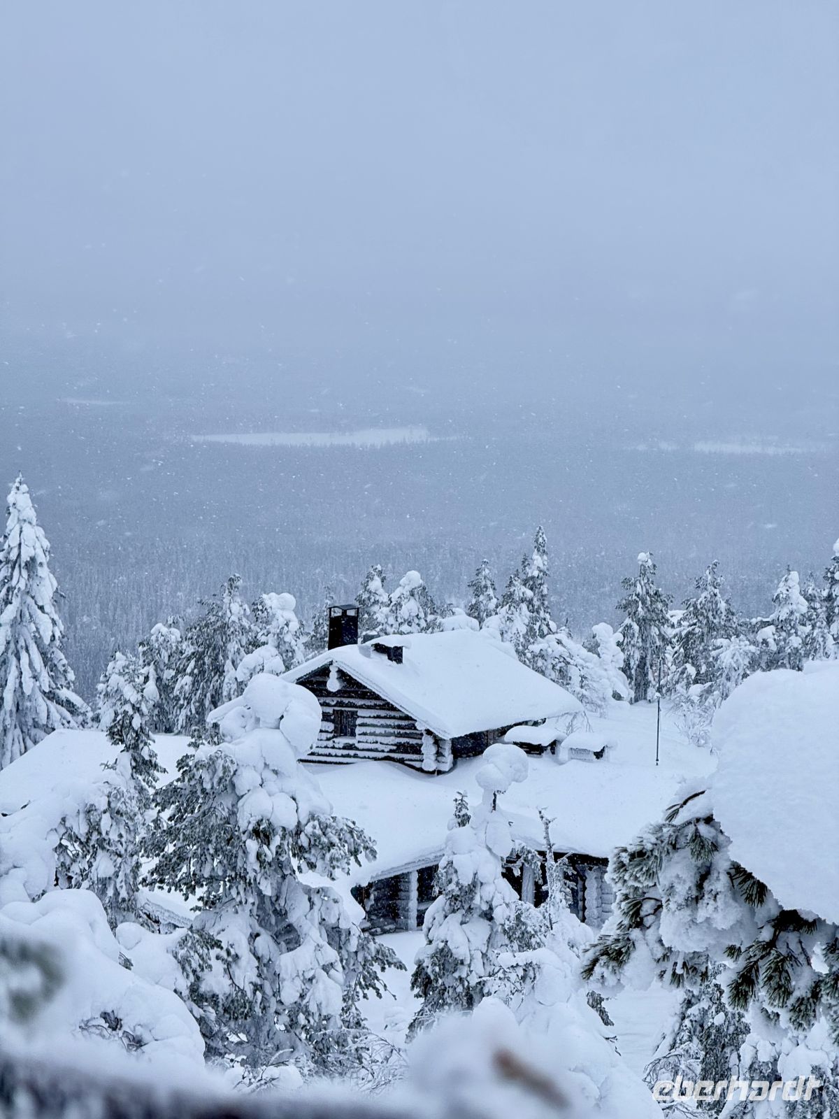 Mir schien es schon immer, dass eine Reise wie ein kurzes Leben innerhalb des ohnehin schon kurzen Lebens ist, das wir führen. Wo die Gegenwart nur ein Augenblick ist. Und das Überraschende an beiden „Leben“ ist ihre Fähigkeit, uns zu erstaunen. Wenn wir glauben, einen Gipfel der Euphorie erreicht zu haben, umgeben von wilder Natur, angenehmer Gesellschaft und Traumlandschaften, bricht ein neuer Tag an, der uns eine Lektion erteilen will, indem er die Schönheit des Vortages bei weitem übertrifft. Und genau so war unser Tag heute. Nachdem wir am Vortag die Hundeschlittenfahrt genossen hatten und dachten, das sei wohl das Schönste, was wir auf dieser Reise erleben würden, kam überraschend – zumindest für jene, die es nicht erwarteten – eine unvergleichliche Wanderung. Wenige Minuten genügten, um uns mit einer Panorama-Seilbahn auf den Berg zu bringen, eine Fahrt, die wir jede Minute genossen. Doch die größte Überraschung erwartete uns auf dem Gipfel: eine völlig andere Landschaft, buchstäblich wie aus einem Märchen. Die Arktis fühlte sich in diesem Moment nah an, denn vor unseren Augen lag ein Wald, der fast vollständig unter dem Schnee begraben war. Die Unwirtlichkeit und zugleich die Schönheit des Klimas spiegelten sich in einer Postkarte wider, die sich vor uns enthüllte. Voller Emotionen wagten wir uns in diesen magischen Wald, natürlich mit Schneeschuhen, damit wir nicht ein paar Meter tief im Schnee versinken würden, der weiß und geduldig alles mit seinem weichen Mantel bedeckte. Hier und da unglaubliche Ausblicke, „schlafende Riesen“, die wie Bäume unter einem ewigen Mantel wirken, in dieser neuen magischen Welt, die wir gerade erst entdeckt haben. Wir stahlen mit einem „Klick“ bereitwillig Bilder, immer in der Hoffnung, dass die Erinnerung so länger anhält oder dass dieses Bild bezeugen kann, was für einen gewöhnlichen Sterblichen sonst wie eine verrückte Beschreibung klingen mag. Die Stunden vergingen; die zweite Hälfte des Tages war ebenso schön, aber in verschiedene Richtungen verteilt: einige auf dem Fahrrad, andere zu Fuß, an dem einen oder anderen Punkt trafen wir uns wieder und entdeckten dieses kleine weiße Stück Erde, das uns so viel zu zeigen hatte.
