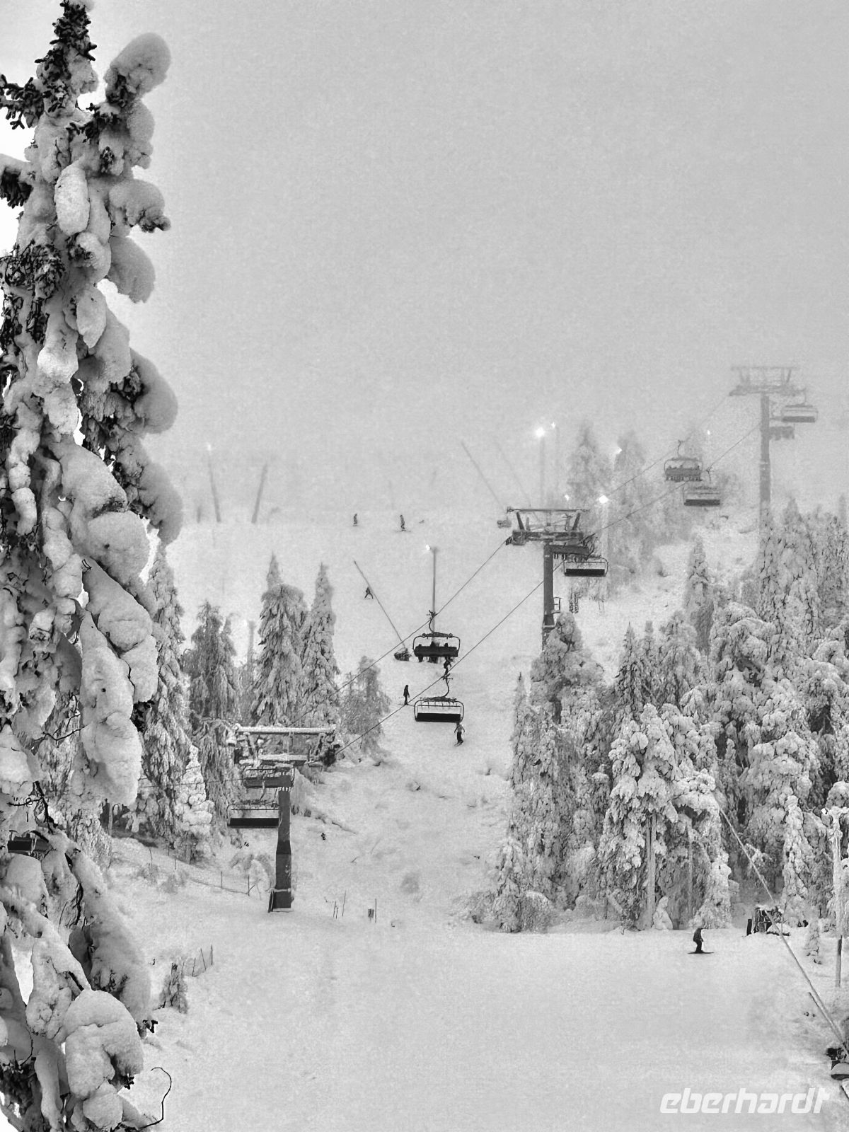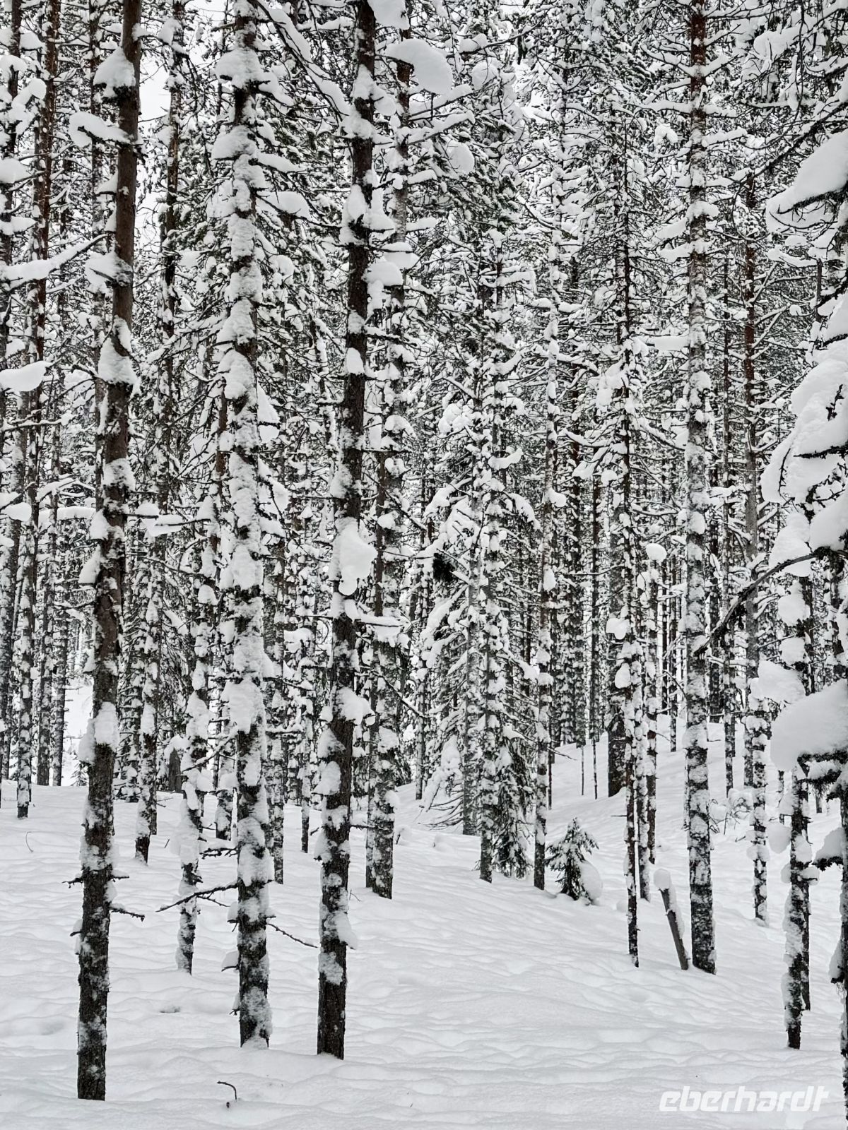 Wenn es ein weißes Paradies gibt, mussten wir nicht länger suchen. Hier war es, wir hatten es gefunden. An diesem Tag drangen wir auf Schneemobilen tief in die Wälder vor – anfangs noch etwas unsicher, später voller Freude und einem Lächeln, als wären wir bereits Experten. In unsere Thermoanzüge eingemummelt, war uns die Kälte fast fremd und gleichgültig. Wir spürten sie zwar an der Brise, die unser Gesicht streifte, aber sie durchdrang nicht unseren Körper, der warm blieb, gut eingepackt in den riesigen Anzügen, die uns von Kopf bis Fuß bedeckten. Daher rührte das wohl Gefühl, dass die Kälte gar nicht so richtig zur Landschaft passen wollte. Ein „gefrorenes Paradies“ mochte seltsam klingen, doch was wir vor uns hatten, war genau das und noch viel mehr. Vor unseren Augen entfalteten sich kapriziöse Formen, natürliche Skulpturen, gebildet aus Schneeansammlungen hier und da, die riesige weiße Pompons formten. Man hätte sie fast für riesige Zuckerwatten halten können, die die Kiefern um uns herum schmückten. Es schien fast unnatürlich, dass sie eine so eigenwillige Dekoration trugen, die zwar in geringer Menge leicht sein mag, aber in dieser Fülle eine gewaltige Präsenz einnimmt. So fuhren wir fort, versunken in die makellos weiße Landschaft und der kalten, reinen Luft. Mit der Erlaubnis des Waldes brachen wir mit dem Schnurren unserer Motoren in den dort herrschenden Frieden ein, mit dem Ziel, mit unseren Augen ein Stück dieser Landschaft zu stehlen und es für immer in unserem Geist zu bewahren. Nach einer angenehmen Pause in einer einsamen Hütte im Wald, wo wir ein munteres Feuer knistern sahen, das uns Wärme schenkte, tranken wir einen süßen heißen Tee, bevor wir zurückkehrten. Der Tag war jedoch noch nicht zu Ende; jeder ging seinen Beschäftigungen nach – ein wenig in den Bergen wandern, einen Kaffee trinken oder die Sauna erleben. Später beim Abendessen kamen alle wieder zusammen, um ihre gemachten Erfahrungen dieses Tages zu teilen, der tiefe Eindrücke bei uns hinterließ.