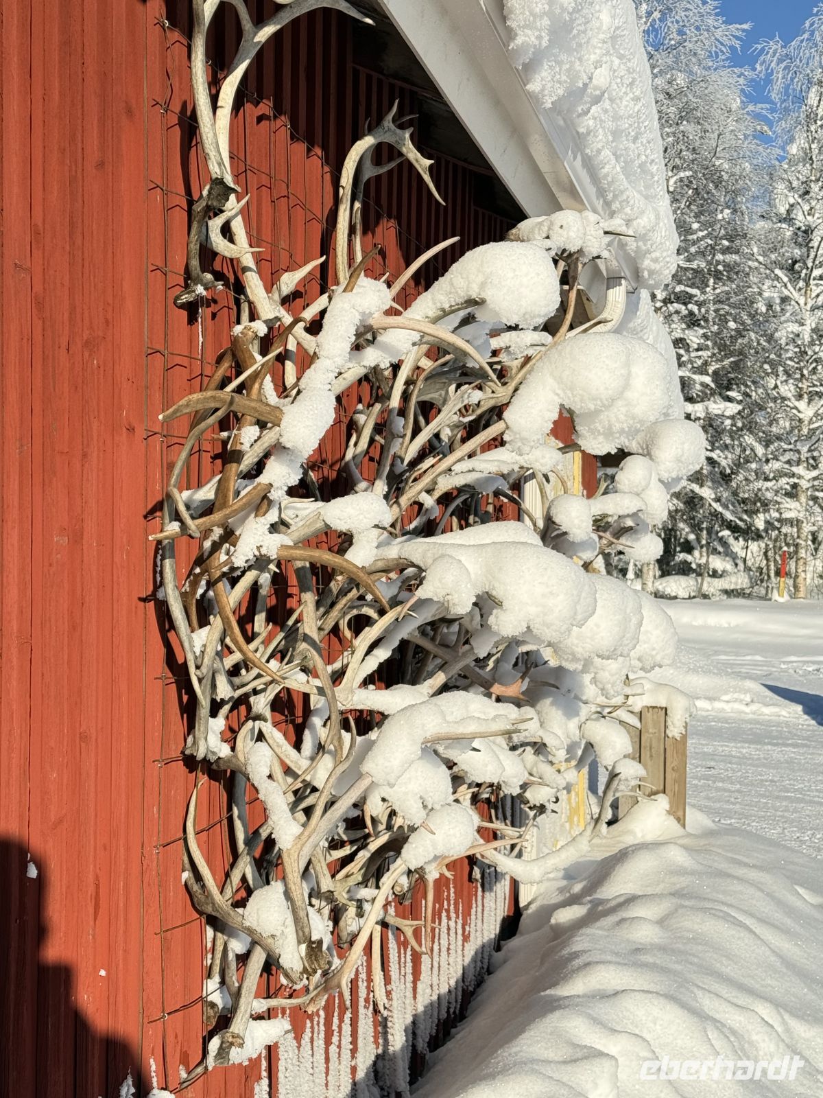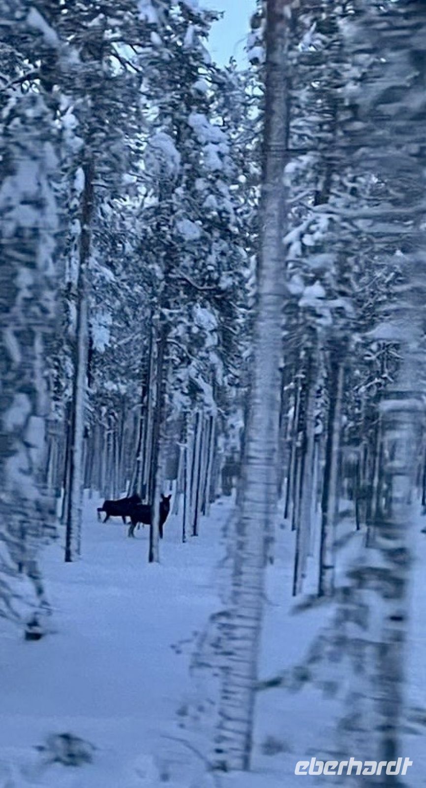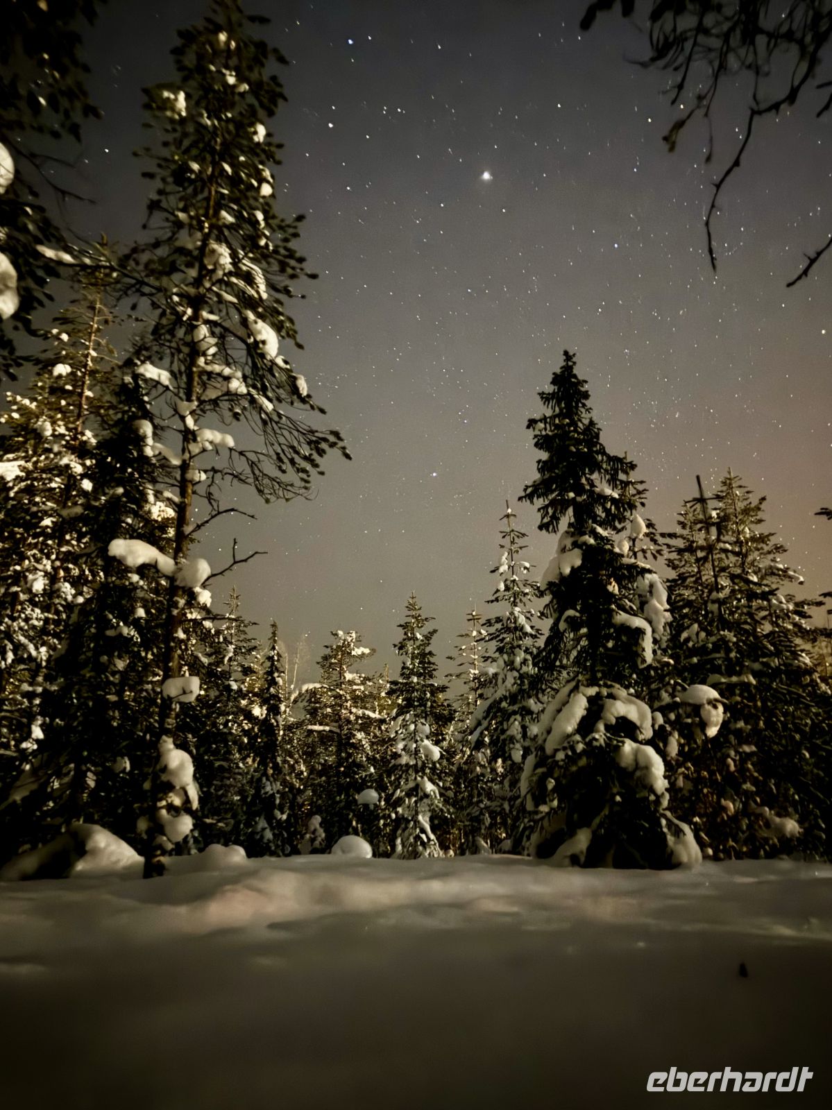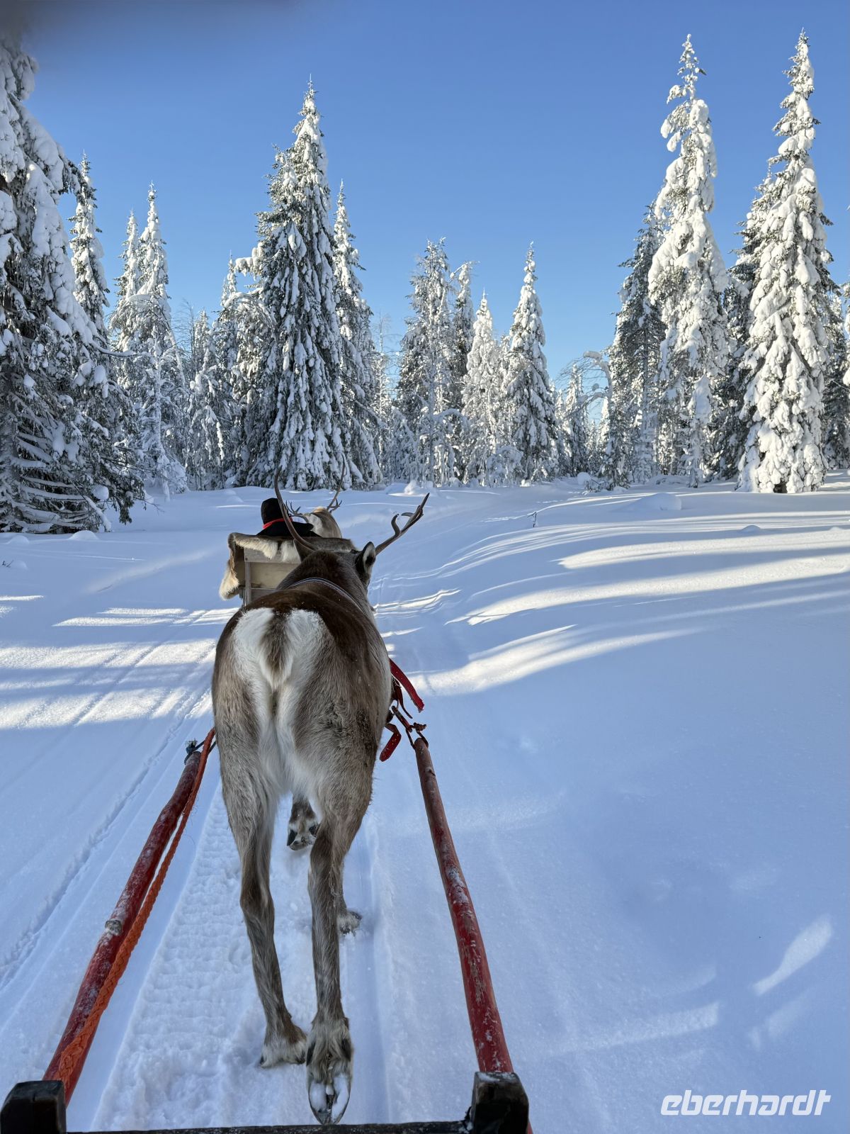 Wir befinden uns weiterhin in einem schwindelerregenden Aufstieg an Glück, Schönheit und Genuss auf dieser Reise. Ich werde mein Bestes geben, aber irgendwann werden die Worte nicht mehr ausreichen, um zu beschreiben, was wir bezeugt haben, wovon wir Teil waren und – was am wichtigsten ist – was es in uns ausgelöst hat. Trotz der Kälte hielt uns das starke Klopfen unserer Herzen warm. Das Wetter war ehrlich zu uns, wir waren nie unzufrieden, und es belohnte uns mit einem blendenden Sonnenaufgang, der nur der Anfang einer Lichtshow sein sollte, die wir „Tag“ nennen würden. In diesen Breitengraden und genau zu dieser Jahreszeit erreicht die Sonne nie ganz den Zenit, vielleicht steht sie nur etwa 10 Grad hoch, aber sie gewinnt jeden Tag viele Minuten an Licht dazu, während sie sich schnell vom Kaamos entfernt, jener langen und dunklen Polarnacht. Das Licht bietet wie kaum ein anderes lange Schatten und eine unbeschreibliche Schönheit. Genau mit diesem Licht betrachteten wir aus dem Fenster die vorbeiziehende Winterlandschaft, die uns entzückte. Unser Ziel heute: eine hübsche Rentierfarm, wo der Höhepunkt stattfand, während wir, in Felle gehüllt in unserem bequemen Schlitten, gezogen von einem freundlichen Rentier, den magischen und verschneiten Wald durchquerten. Die Runde war zeitlich vielleicht kurz, aber sie wird für immer in unserer Erinnerung bleiben, weil sie so magisch und gleichzeitig lustig war. Fotos reichten nicht aus, also versuchten wir dieses Mal, den Moment einfach mit den Augen einzufangen. Der Besuch auf der Farm war mehr als nur ein Ausflug; wir genossen es auch, die kleinen Rentiere zu füttern oder gemütlich in einer gewärmten Hütte der Geschichte der Farm und allem, was mit Rentieren zu tun hat, zu lauschen. Auf unserem Rückweg zum Hotel gerieten wir plötzlich in ein Rennen gegen die Zeit, denn die Sonne sank bereits, und wir wollten uns von dem Gestirn vom höchsten Punkt des Berges aus verabschieden, der direkt vor dem Hotel aufragt. Und so war es: Wir kamen im letzten Moment an, genau rechtzeitig, um die Sonne zu beobachten, die mit all ihrer Kraft im Kontrast zur Kälte und dem Schnee um uns herum stand. Langsam, unser Entzücken verlängernd, sank dieser riesige glühende Himmelskörper in der Ferne herab. Es erlaubte uns, diesen Tanz der Kontraste aus Licht, Schatten und Schnee zu fotografieren und zu genießen. Stunden später, als nur noch die Sterne am Himmel standen, wagten einige von uns das Abenteuer, die Chancen auf Polarlichter am Himmel herauszufordern. Die immer frische Luft, der Wald, der See, der Berg und der Himmel – es konnte keine schlechte Wahl sein, denn auch die nächtliche Landschaft hat ihre Magie. Man muss nur mit weit offeneren Augen hinsehen.