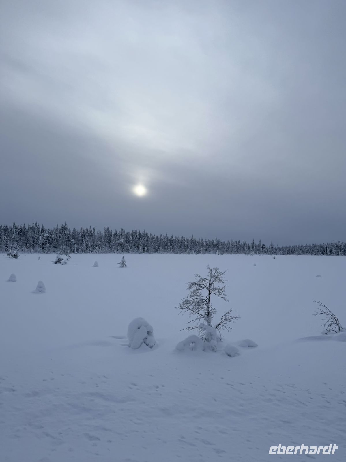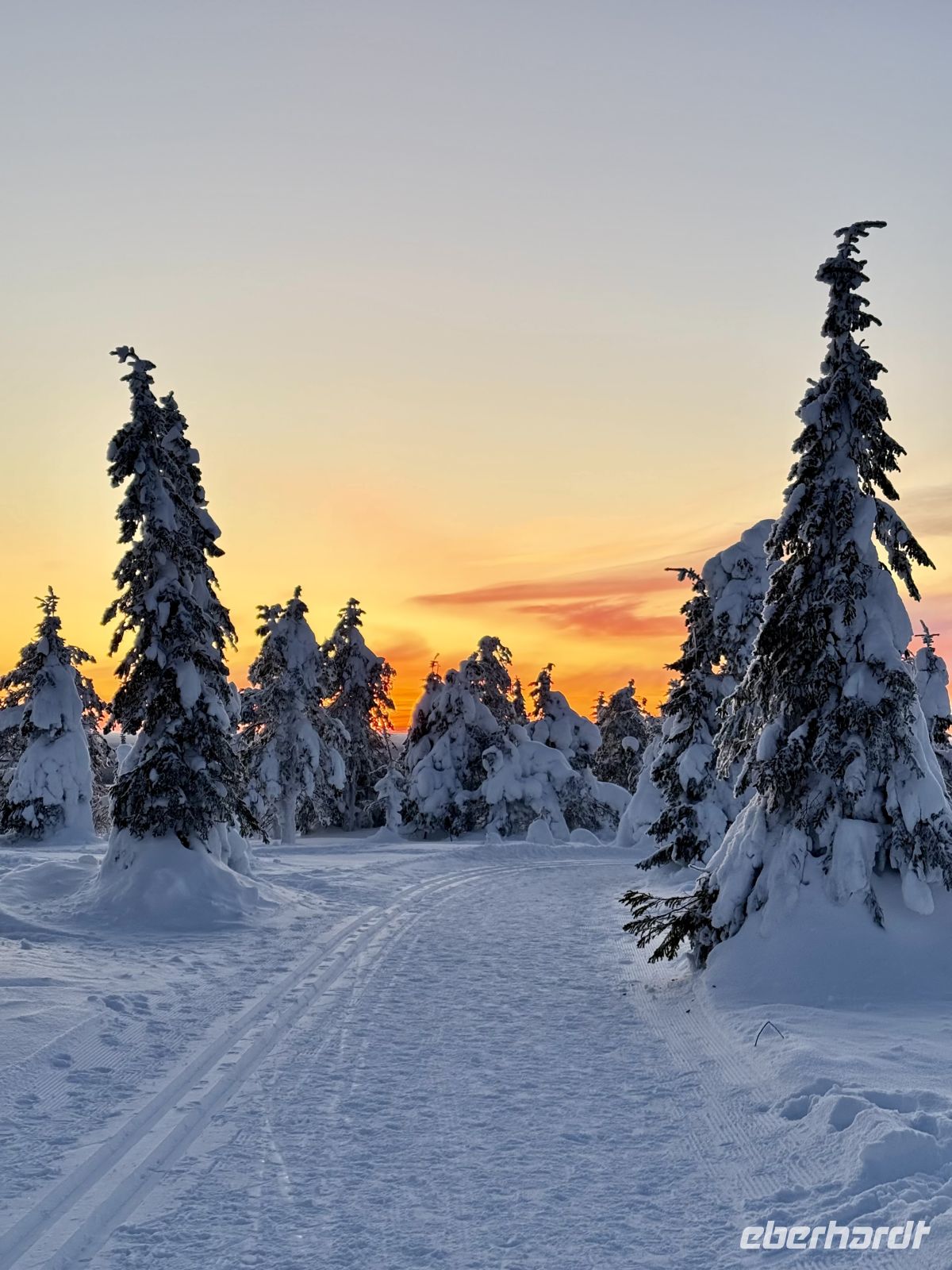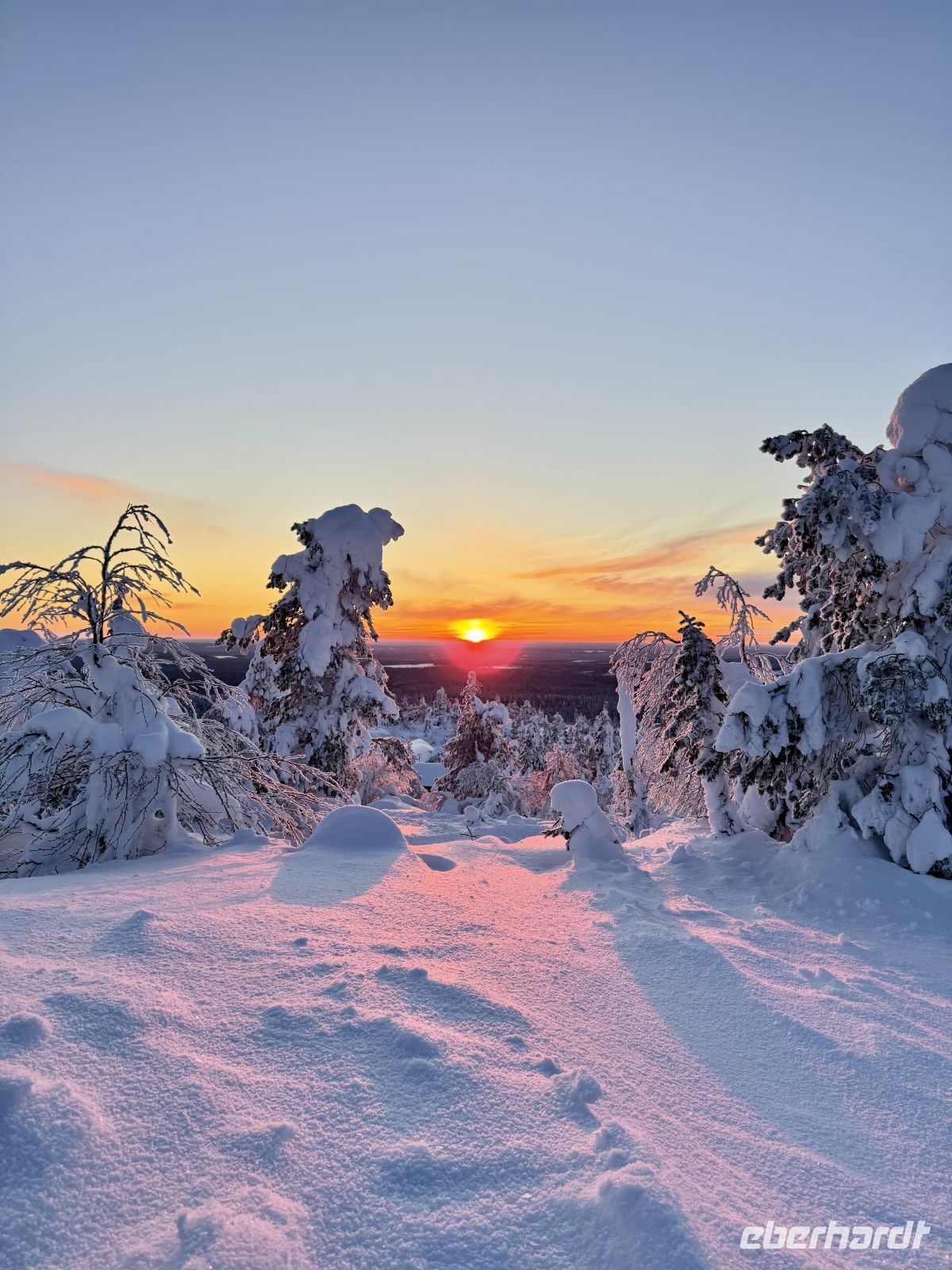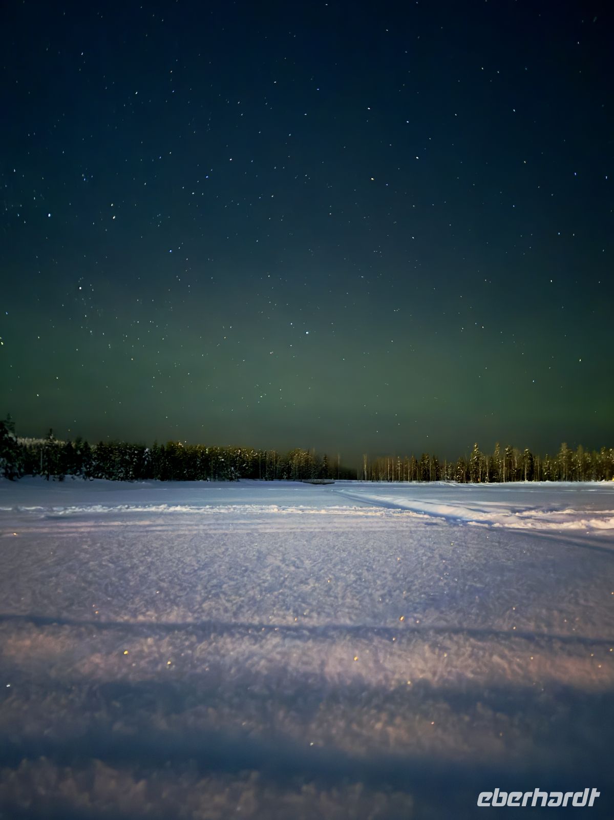 Nach einigen Tagen mit starken Schneefällen in Deutschland folgten kalte, aber schneearme Tage. Kurz vor Beginn unserer Reise schwankte die Temperatur um den Gefrierpunkt, begleitet von vereinzelten Regenschauern, die schließlich den angesammelten Schnee aus den Höfen, von den Feldern und zuletzt von den Straßenrändern und Gehwegen spülten. Obwohl es kalt war – ein Thema, das bei vielen oft zu Gesprächen und Klagen führt –, sollte uns unsere Reise an ein Ziel führen, wo es mindestens 10 Grad kälter sein sollte! Und da standen wir nun am Flughafen Dresden, inmitten einer Menge von Reisenden, die mit ihren Winteranzügen und einem breiten Lächeln im Gesicht bereit waren, einen Direktcharterflug an die Grenze der finnischen Arktis zu besteigen. Wir kamen bei strahlendem Sonnenschein an; schon aus der Luft ließ Lappland eine magische Winterlandschaft erahnen. Sobald wir gelandet waren, verstärkte sich das Gefühl, in einem Märchenland zu sein. Aus dem Flugzeug zu steigen, die Sonnenstrahlen im Gesicht zu spüren, diese reine Luft einzuatmen und die weiße Unermesslichkeit zu betrachten, war schlichtweg genial. Später, nach den üblichen Formalitäten, machten wir uns auf den Weg zu unserem Hotel und genossen pausenlos diese verschneite Landschafte, als sähen wir zum ersten Mal Schnee. Und ja, wir alle haben ihn schon oft gesehen, aber wohl niemals in diesen Mengen, in solch einer Umgebung und mit einem Sonnenuntergang, bei dem das Licht langsam verblasst und uns eine gigantische „Goldene Stunde“ schenkte. Und das ist nicht übertrieben: Wie in einem Märchen wirkt das Licht hier so rein. Es ist Teil dieser arktischen Klarheit, die alles in Magie hüllt. Die Sonnenstrahlen spiegeln sich in den in der Luft schwebenden Eiskristallen wider und erzeugen einen Effekt, als würde alles glitzern. Mit diesen Eindrücken, die wir lange vor Augen hatten, machten wir uns Stunden später bereit zum Ausruhen.