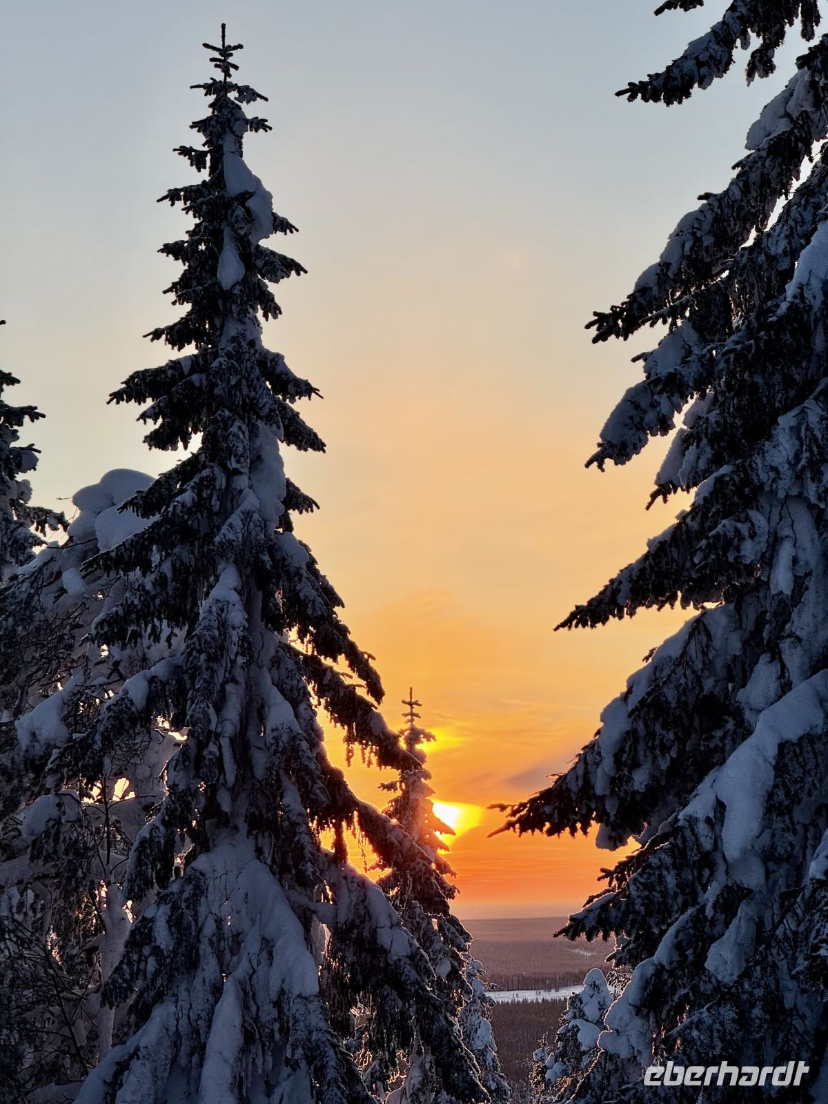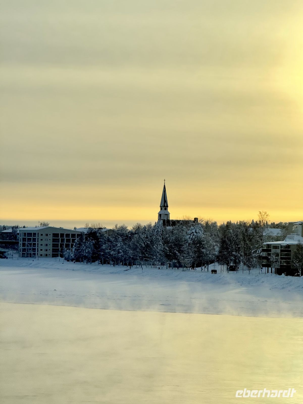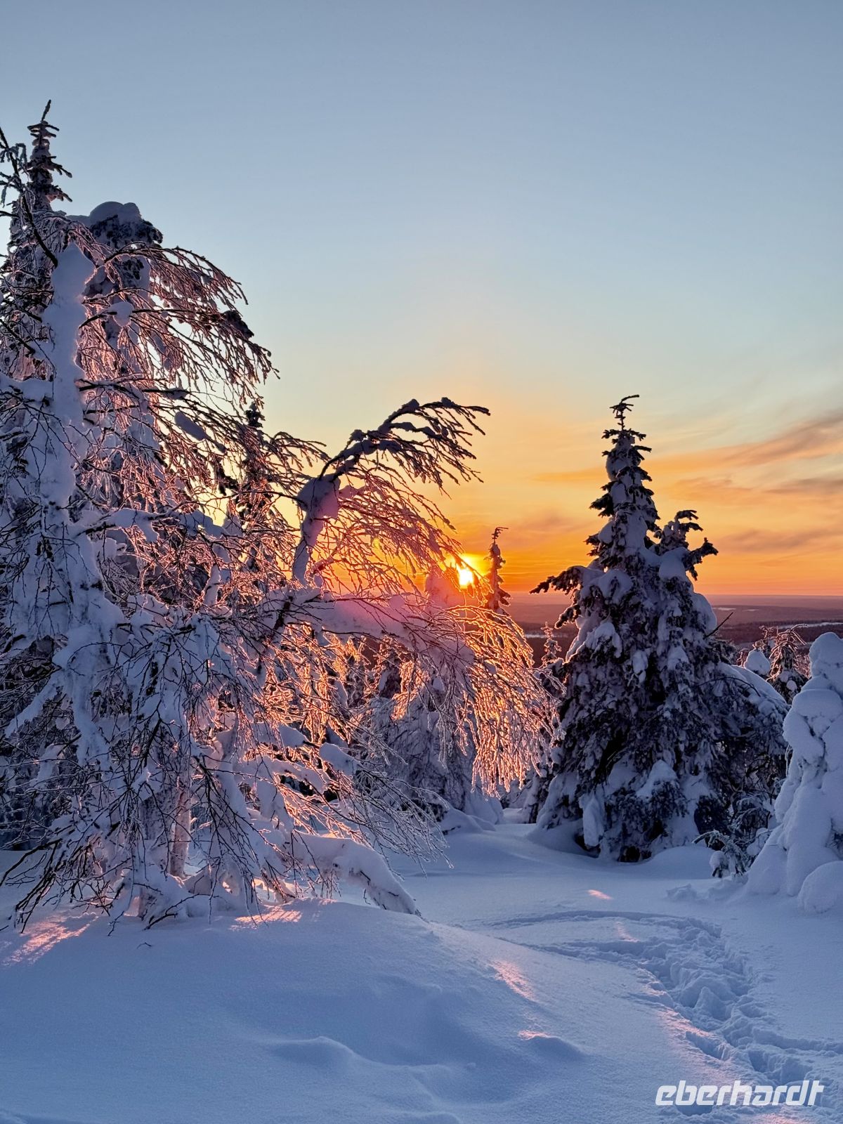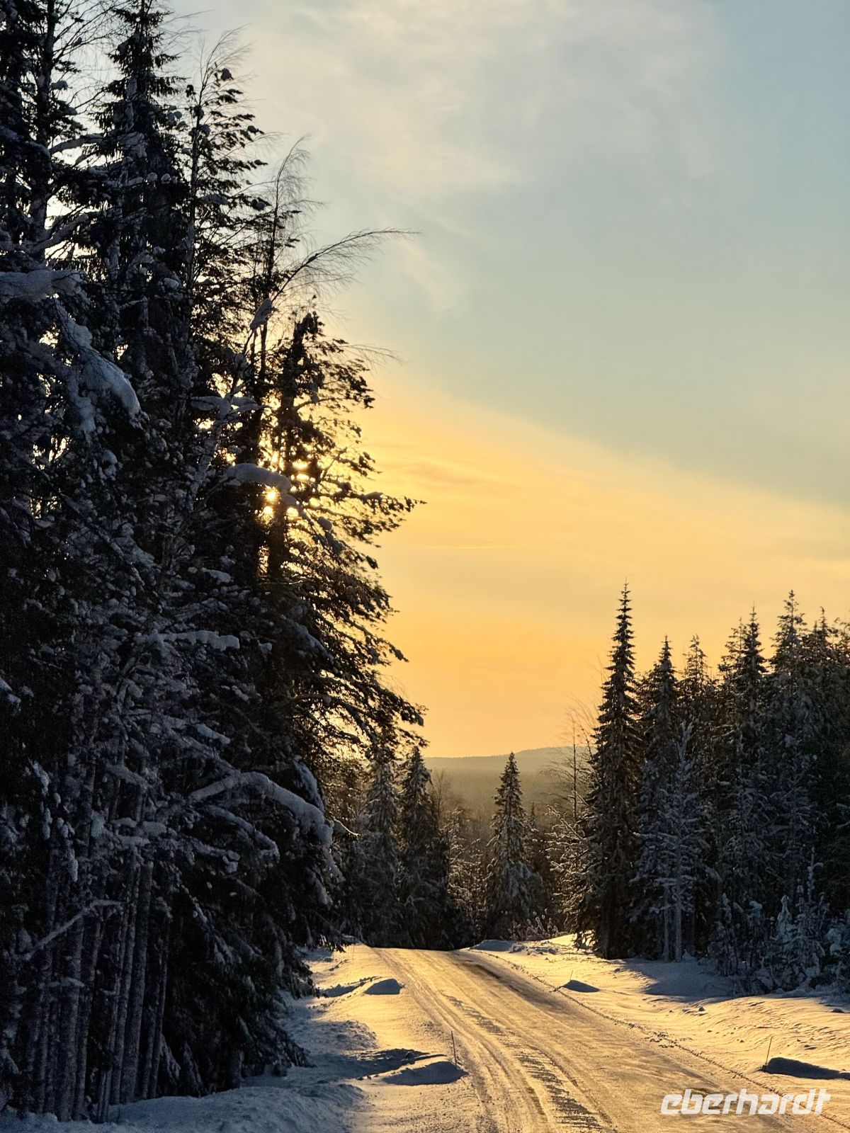 Nach einigen Tagen mit starken Schneefällen in Deutschland folgten kalte, aber schneearme Tage. Kurz vor Beginn unserer Reise schwankte die Temperatur um den Gefrierpunkt, begleitet von vereinzelten Regenschauern, die schließlich den angesammelten Schnee aus den Höfen, von den Feldern und zuletzt von den Straßenrändern und Gehwegen spülten. Obwohl es kalt war – ein Thema, das bei vielen oft zu Gesprächen und Klagen führt –, sollte uns unsere Reise an ein Ziel führen, wo es mindestens 10 Grad kälter sein sollte! Und da standen wir nun am Flughafen Dresden, inmitten einer Menge von Reisenden, die mit ihren Winteranzügen und einem breiten Lächeln im Gesicht bereit waren, einen Direktcharterflug an die Grenze der finnischen Arktis zu besteigen. Wir kamen bei strahlendem Sonnenschein an; schon aus der Luft ließ Lappland eine magische Winterlandschaft erahnen. Sobald wir gelandet waren, verstärkte sich das Gefühl, in einem Märchenland zu sein. Aus dem Flugzeug zu steigen, die Sonnenstrahlen im Gesicht zu spüren, diese reine Luft einzuatmen und die weiße Unermesslichkeit zu betrachten, war schlichtweg genial. Später, nach den üblichen Formalitäten, machten wir uns auf den Weg zu unserem Hotel und genossen pausenlos diese verschneite Landschafte, als sähen wir zum ersten Mal Schnee. Und ja, wir alle haben ihn schon oft gesehen, aber wohl niemals in diesen Mengen, in solch einer Umgebung und mit einem Sonnenuntergang, bei dem das Licht langsam verblasst und uns eine gigantische „Goldene Stunde“ schenkte. Und das ist nicht übertrieben: Wie in einem Märchen wirkt das Licht hier so rein. Es ist Teil dieser arktischen Klarheit, die alles in Magie hüllt. Die Sonnenstrahlen spiegeln sich in den in der Luft schwebenden Eiskristallen wider und erzeugen einen Effekt, als würde alles glitzern. Mit diesen Eindrücken, die wir lange vor Augen hatten, machten wir uns Stunden später bereit zum Ausruhen.