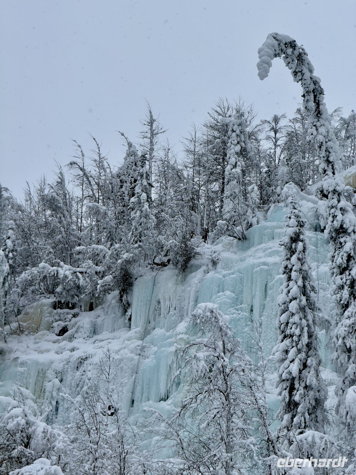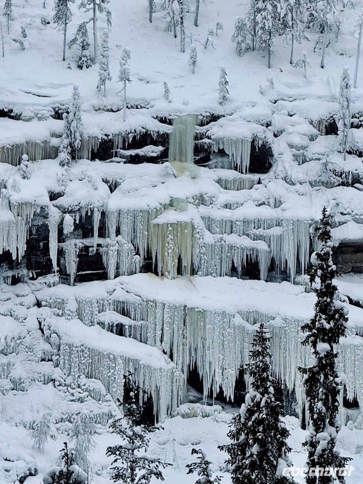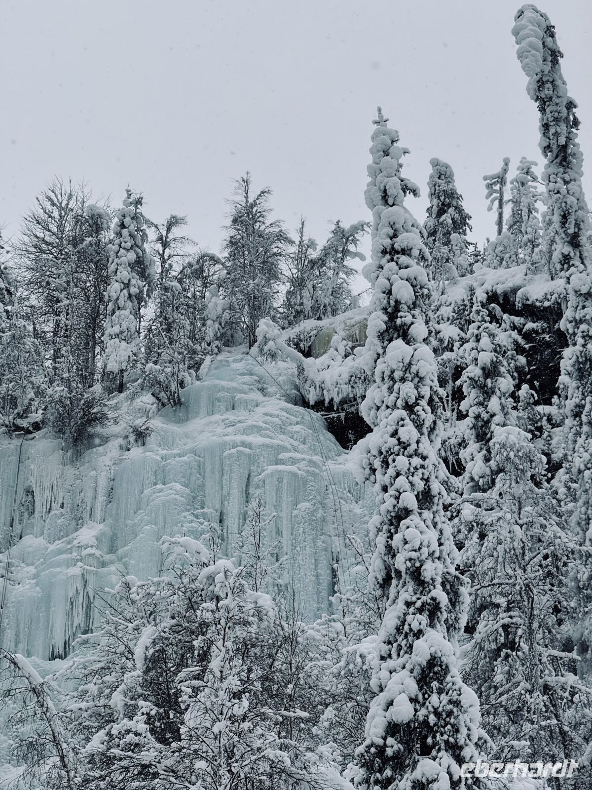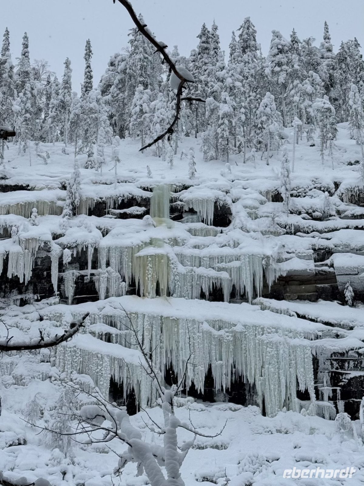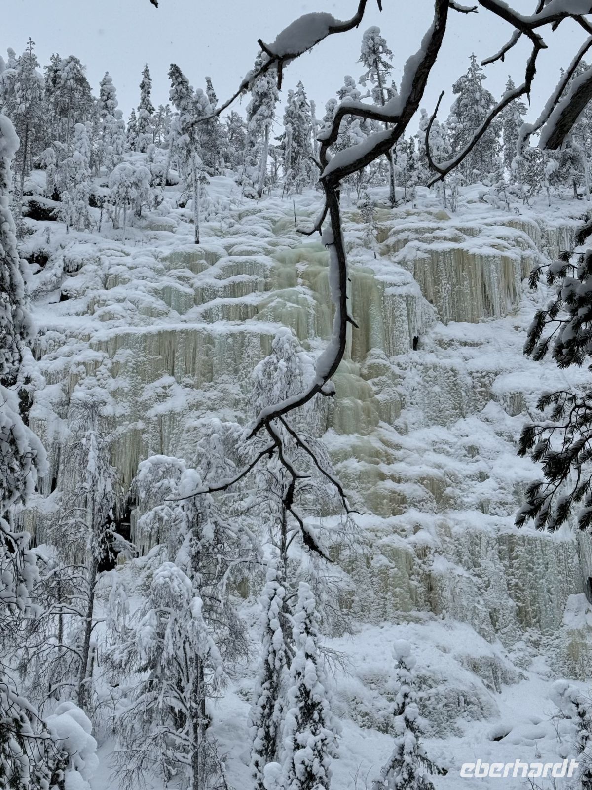 Die Gegenwart verlängert sich, selbst wenn wir schlafen. Und genau auf dieser Reise war es eine echte Anstrengung, zwischen Realität und Traum zu unterscheiden. An diesem Tag war uns der weiße Mantel, der alles bedeckt, gar nicht mehr fremd. Es schien, als wären die weißen Hänge und die gefrorenen Bäume, die schneebeladen den Himmel stützen, schon immer für uns da gewesen. Wir machten uns prompt auf zum Abenteuer des Tages, denn genau das sollte es werden: unsere Wanderung durch eine winterliche Schlucht mit gefrorenen Wasserfällen im Kourouoma-Nationalpark. Wir begannen den Abstieg inmitten eines Märchenwaldes mit einer einzigartigen Führerin auf höchstem Niveau. Einmal an das Schuhwerk für das Eis gewöhnt, die reine Luft tief einatmend und versunken in der Beobachtung des Waldes, erreichten wir den ersten Blick auf die bekannten Wasserfälle, deren Wasser auf ihrem Weg zum Meer mitten im Sprung beschlossen hatte, innezuhalten, um die Landschaft zu betrachten. Welch ein Anblick: Das Wasser ist mitten im Flug gefroren, und die gewaltige Felswand verfügt über mehr als nur einen Wasserfall, der im gleichen Zustand wie seine Nachbarn statisch verharrt und für mehrere Monate – wie das Klima es vorgeschrieben hat – in die Unendlichkeit blickt. Nachdem wir den Boden der Schlucht erreicht hatten, setzte sich unser Weg parallel zur linken Wand fort, wobei wir immer wieder neue Wasserfälle in verschiedenen Farben erblicken konnten, die alle die Besonderheit hatten, in der Zeit eingefroren zu sein. Eine Pause war willkommen; ein wenig Feuer stärkte jene, denen die Kälte etwas zugesetzt hatte. Aber nach dieser Wärme, einem kleinen Imbiss und etwas heißem Tee waren wir alle bereit weiterzugehen. Diesmal bergauf – genug Bewegung, um uns warmzuhalten. Im Bus auf der Rückfahrt zum Hotel, nach einer kurzen Pause und einem verdienten Kaffee, war es ruhig und schläfrig; einige schlossen für einen Moment die Augen, glücklich und zufrieden mit dem heute genossenen Erlebnis. Die Tage vergingen, und es war unbestreitbar, dass das Ende der Reise bereits um die Ecke lauerte. Doch im Moment versuchten wir nicht an das zu denken, was kommen würde, und konzentrierten uns auf diese Nacht! Unsere letzte Nacht in der Arktis, und wir werden uns an sie erinnern.