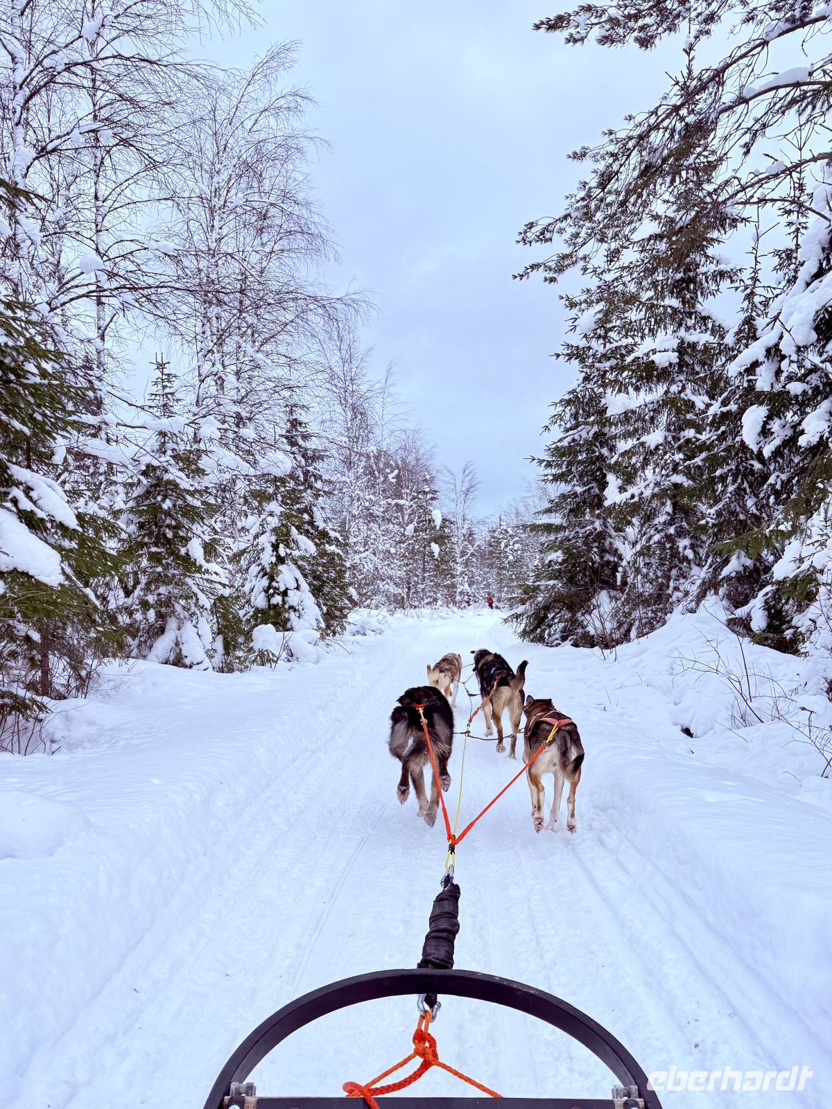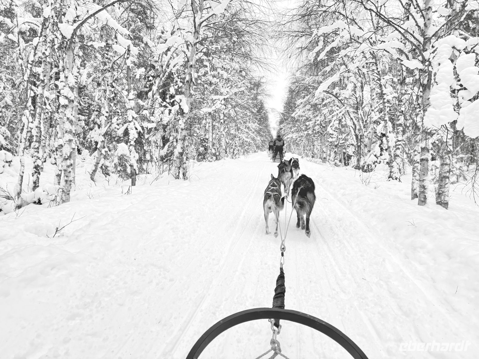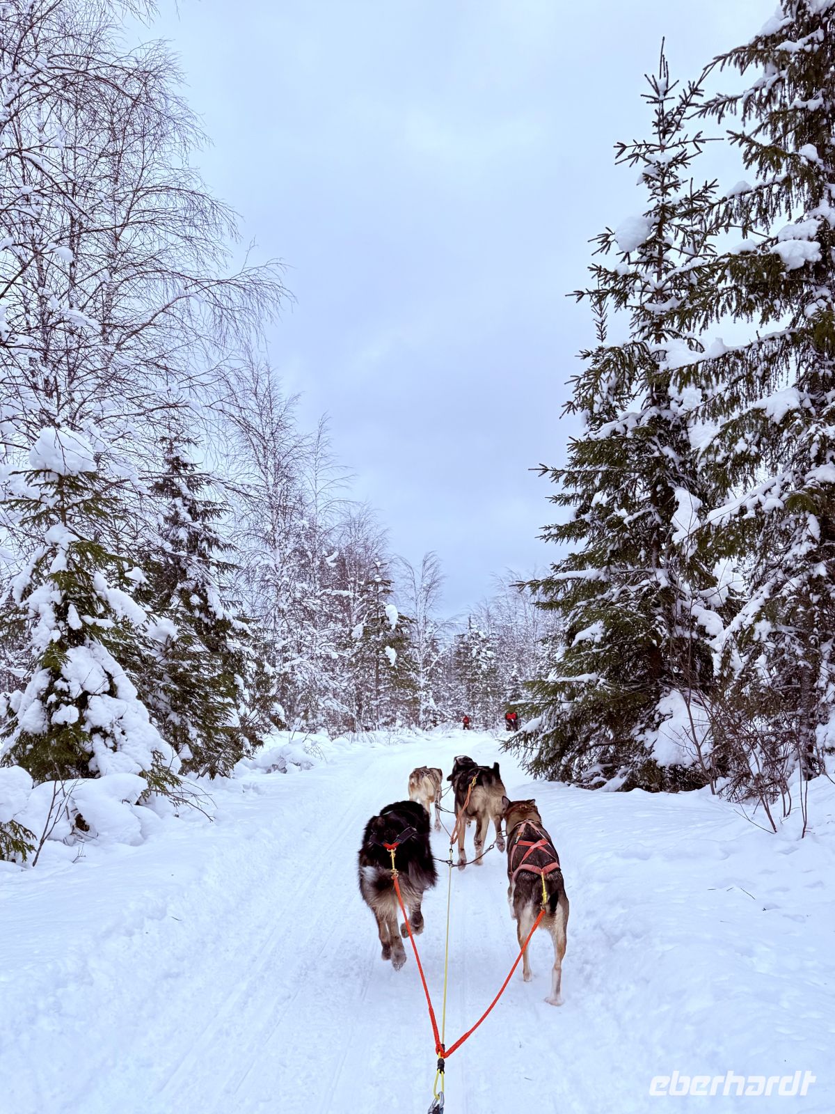 Die Energie auf unserer Reise war im Steigen begriffen. Einer nach dem anderen nahmen wir an dem teil, was einer der angenehmsten Momente dieser Reise werden sollte. Am heutigen Tag würden wir dieses gefrorene Paradies aus einer ganz anderen Perspektive sehen, aber mit hoher Geschwindigkeit. Damit meine ich, dass man, wenn man in einem von Hunden gezogenen Schlitten sitzt, sich im Grunde auf Bodenhöhe befindet und das gefrorene Paradies an den Seiten vorbeiziehen sieht, was die Erfahrung magisch macht. Man betrachtet diese neue Welt mit anderen Augen: von unten. Und als wären unsere Anwesenheit nicht schon genug, schloss sich uns noch eine fröhliche Meute von 5 bis 6 Hunden pro Schlitten an. Wenn unsere Freude schon groß war, stellt euch vor, wie es danach war – sie hat sich schlagartig verfünffacht. Geteilte Freude ist eben doppelte Freude, und es gibt keine treueren Wesen als diese fröhlichen Hunde, die vom ersten Augenblick an vor Verlangen brannten, unsere Schlitten mit aller Kraft voranzuziehen. Die Geschwindigkeit empfanden wir anfangs als ungewohnt, ja fast unerwartet, da wir schnell über die schneebedeckten Wege glitten, scheinbar ohne jede Kontrolle. Es ist eben kein Fahrrad oder kein Auto, es hat keine Pedale, Knöpfe, Hebel oder Lenker. Nun ja, ich würde lügen, wenn ich nicht sagen würde, dass es, so rudimentär es auch schien, tatsächlich eine Bremse hatte. Doch egal wie viele Erklärungen man vorab erhält: Es ist unmöglich, mit Worten zu beschreiben, was man in diesen ersten Augenblicken erlebt, wenn man nicht die totale Kontrolle hat, sondern sich einfach auf die Reise einlässt. Wir drangen in die gefrorene Welt ein, ohne die dort herrschende Stille zu brechen. Unser Tag war ein Juwel, und als solches werden wir ihn in unseren Erinnerungen bewahren. Später plauderten wir alle gut gelaunt über das heute Erlebte.