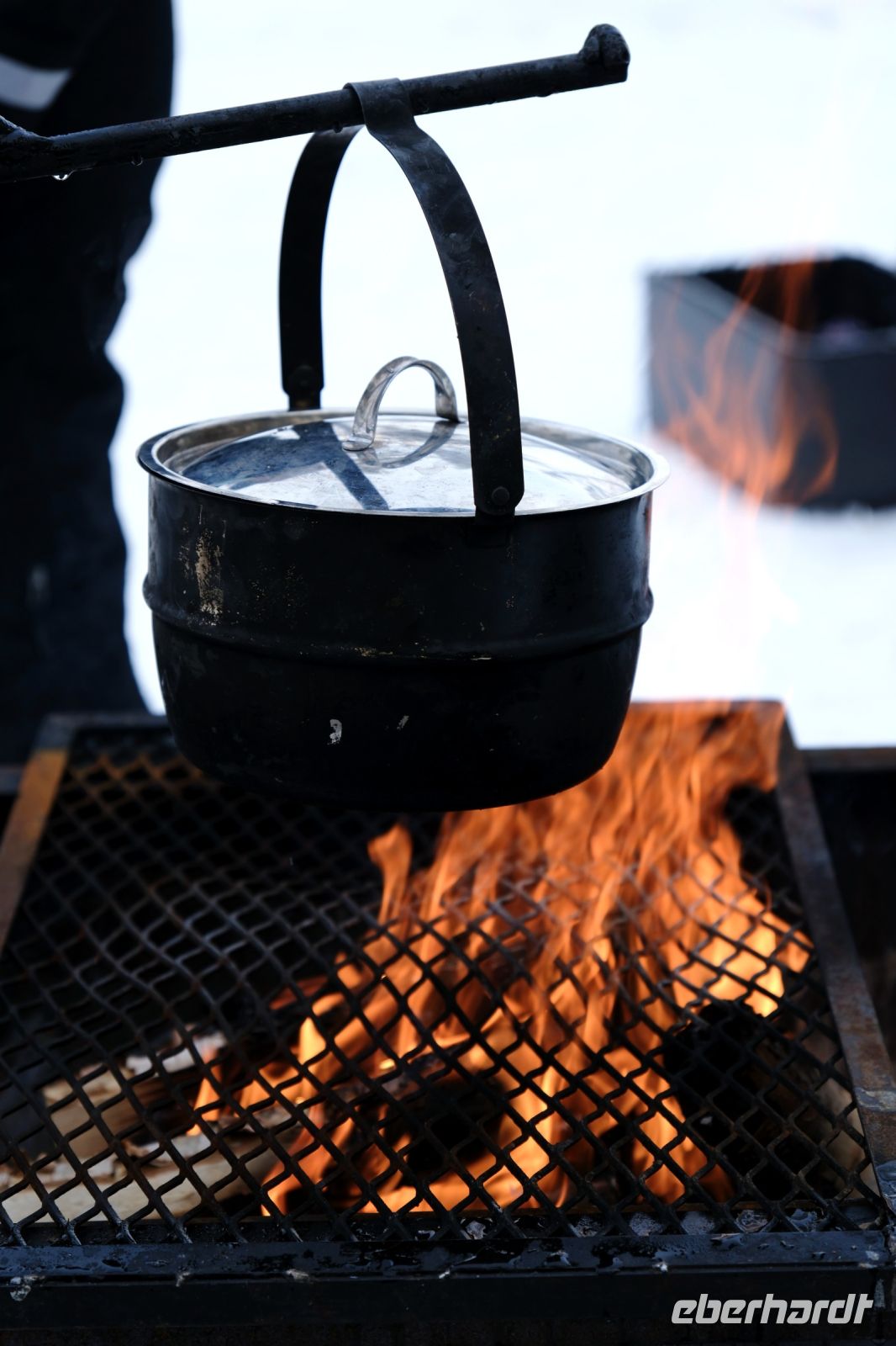 Weiter ging es nach unten, mit kleinen Stopps wo uns Terhi einiges über die früheren Gegebenheiten und das Leben der Sami erzählte. Wir wanderten vorbei an vereisten Wasserfällen, durch eine wunderschöne Schneelandschaft mit vereisten Bäumen und natürlichen Eisskulpturen. Bevor es wieder die Schlucht hoch ging, gab es leckere Suppe und Heiße Beerensaft am Lagerfeuer.