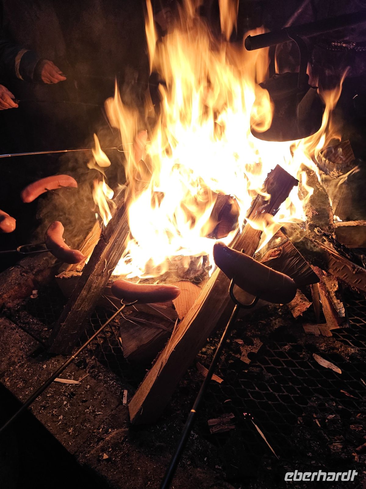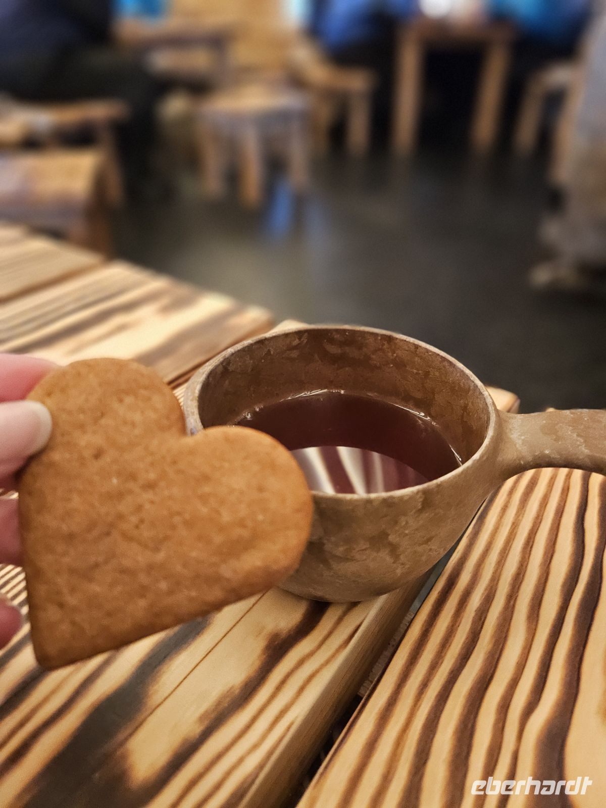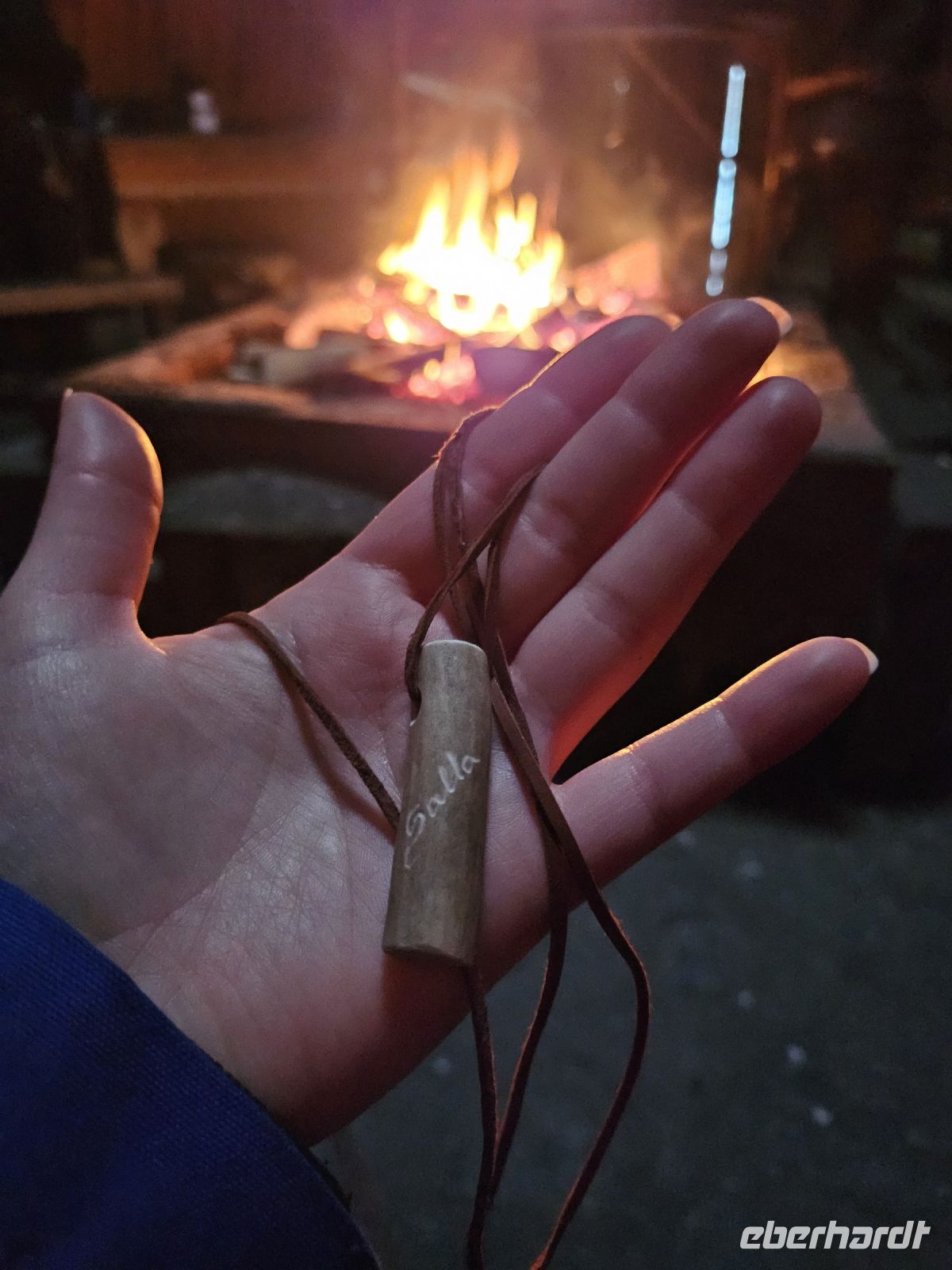 In einer traditionellen Kota wärmten wir uns anschließend beim Würstchen-Grillen über dem offenen Feuer inkl. Kaffee und Tee auf. Am Lagerfeuer wurden Geschichten über die jahrhundertealte Rentierzucht erzählt, was uns tief beeindruckte. Als besondere Erinnerung erhielten wir einen Rentierführerschein und ein kleines Amulett aus Rentierhorn.