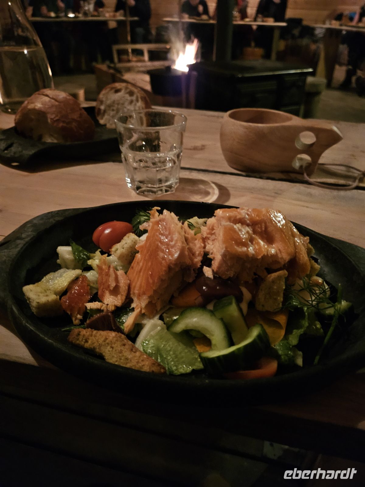 Am Abend erwartete uns ein besonderes Highlight: das Kota-Dinner. In einer traditionellen Holzhütte knisterte das Feuer, während der Flammlachs dicht am Feuer garte. Was für ein Anblick! Den Lachs gab es zur Vorspeise und als Hauptgang leckeren Rentiergulasch mit Preiselbeeren. Jeder von uns hatte dann noch die Gelegenheit, selbst Pfannkuchen am Feuer zu backen, was für viel Begeisterung sorgte. Dieses rustikale und gemütliche Erlebnis war der kulinarischer Höhepunkt der Reise.