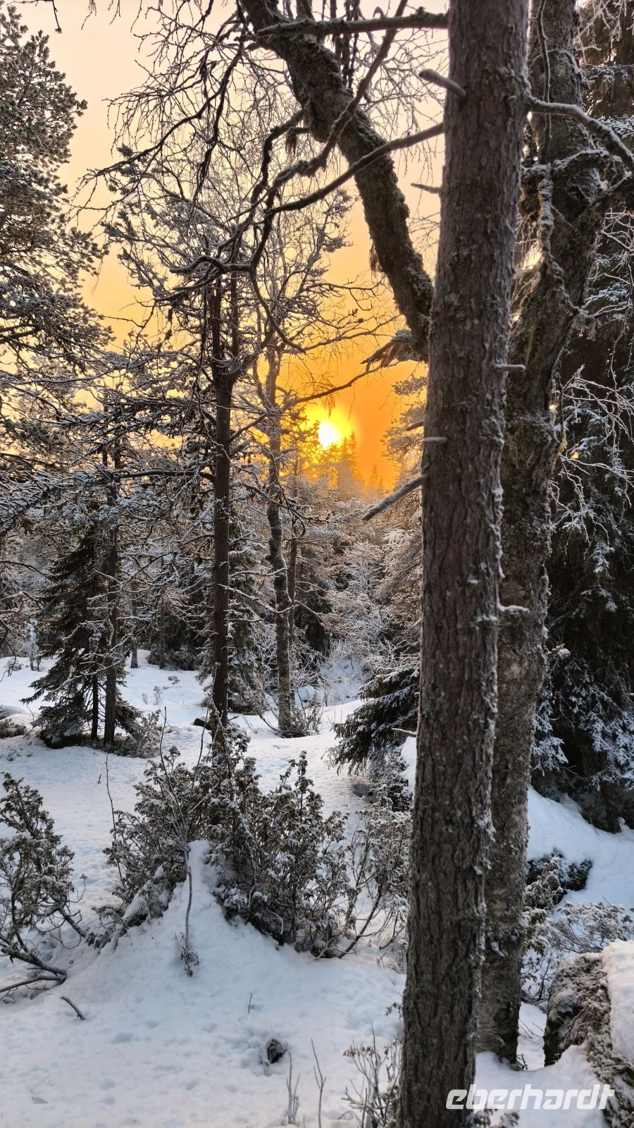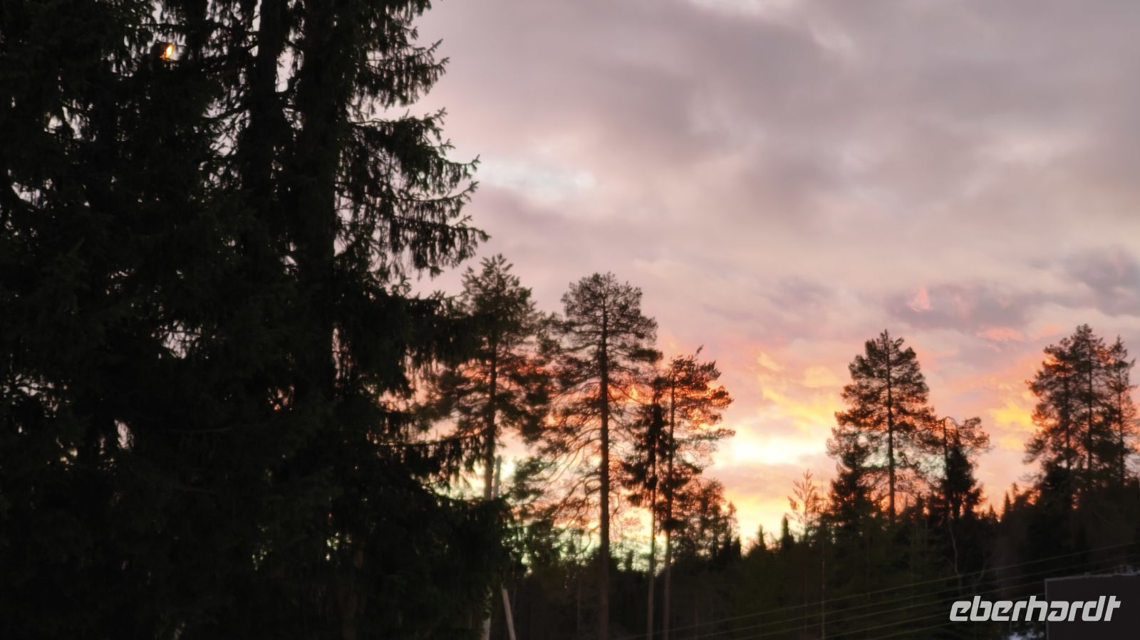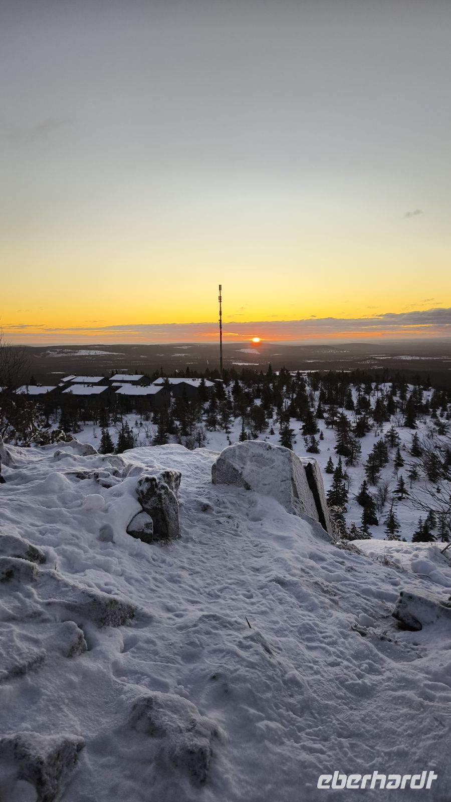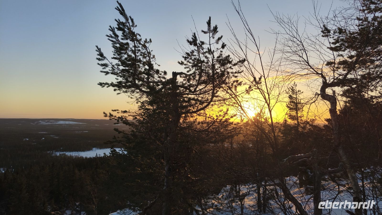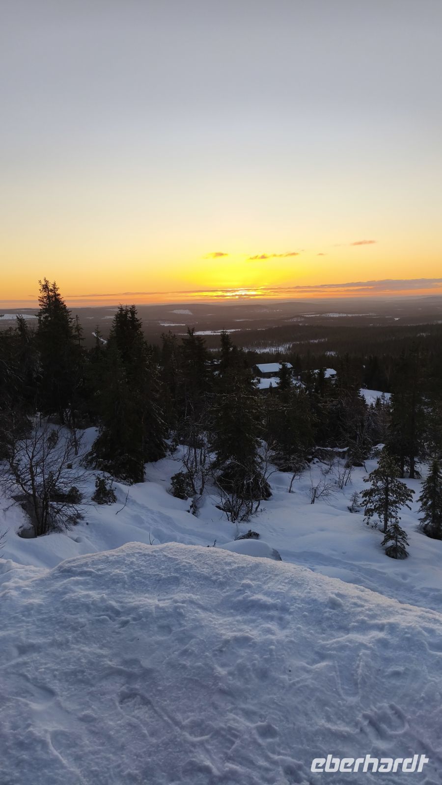 Nach Rückkehr mit der "Vormittags Gruppe" haben wir noch eine Wanderung zum "Tophill Hotel" gemacht. Wie der Name schon sagt oben auf dem Berg. Nach einer knappen Stunde bergauf mit tollen Aussichten. Die tief stehende Sonne färbt den Himmel in einmalige Gelb- und Rot-Töne. Das ist das besondere Licht Lapplands und tief beeindruckt sind wir immer wieder stehen geblieben, um diese Lichtstimmungen mit der Kamera einzufangen. Sie zeigen Lappland von seiner magischen Seite.