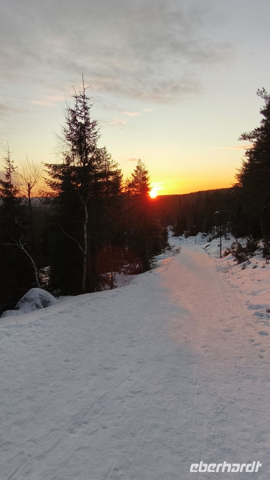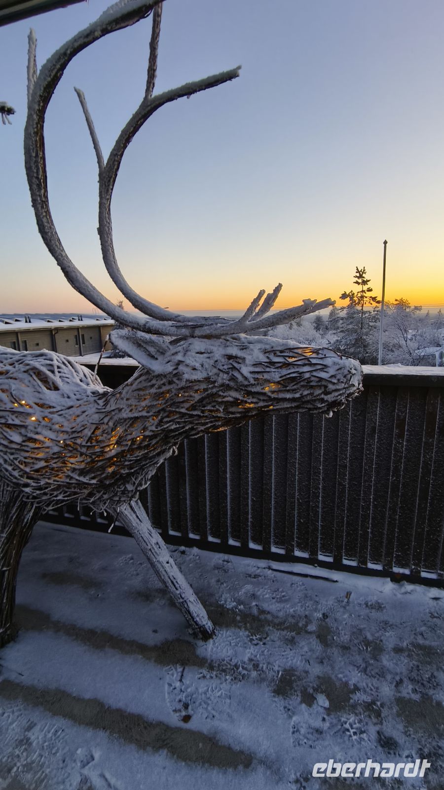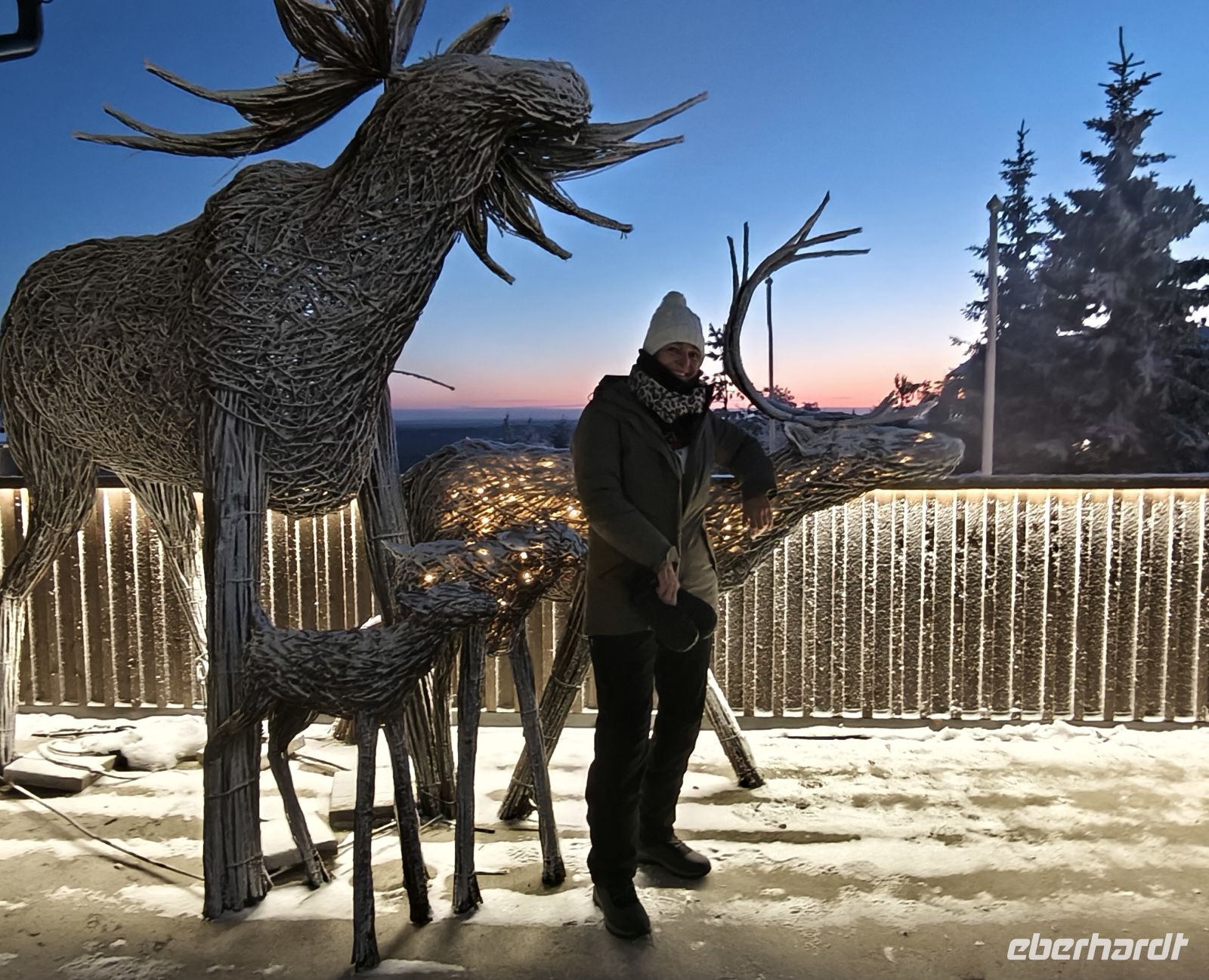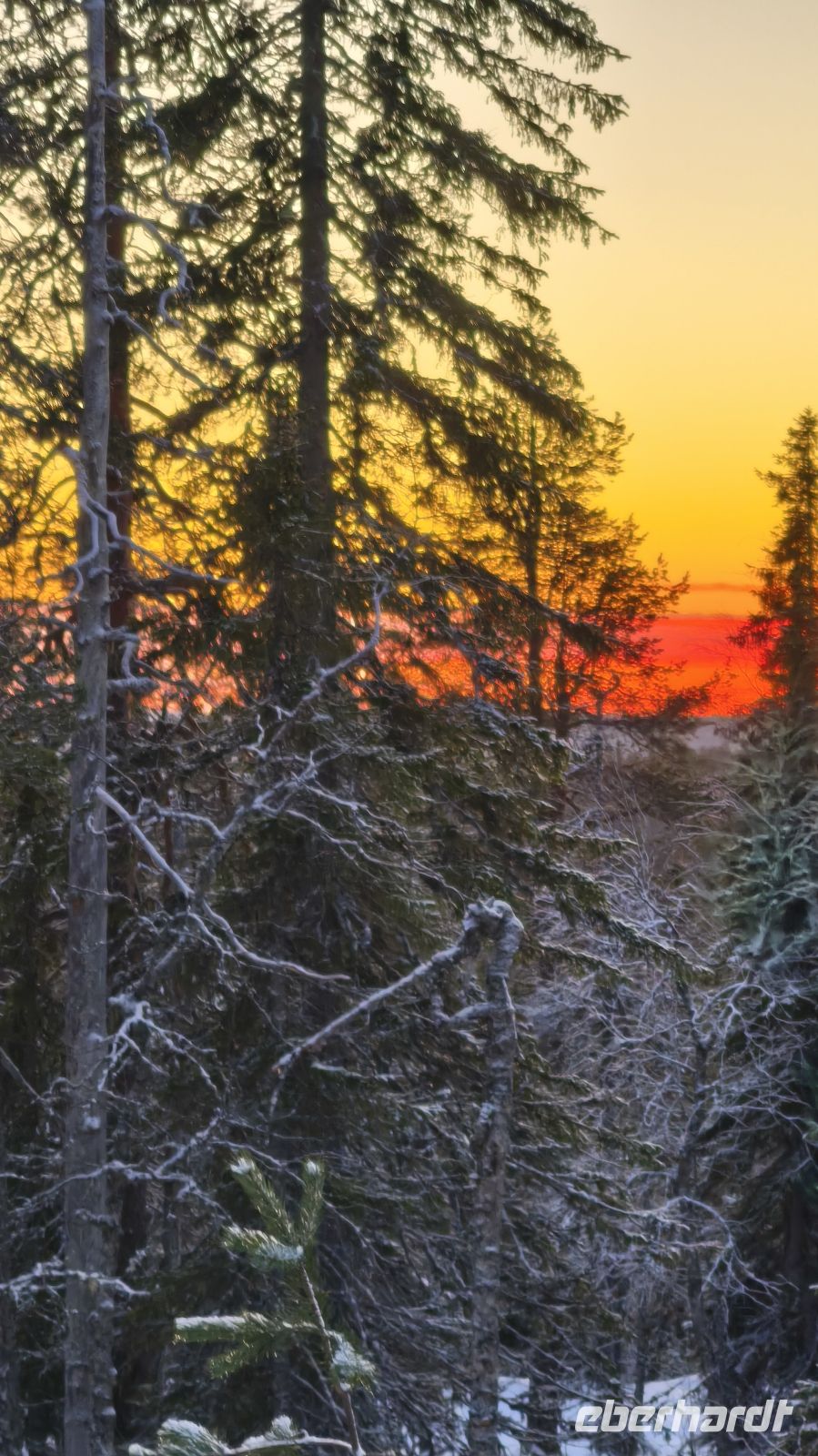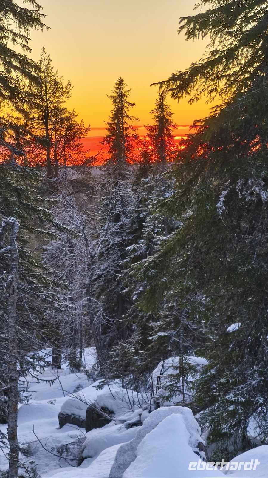 Nach Rückkehr mit der "Vormittags Gruppe" haben wir noch eine Wanderung zum "Tophill Hotel" gemacht. Wie der Name schon sagt oben auf dem Berg. Nach einer knappen Stunde bergauf mit tollen Aussichten. Die tief stehende Sonne färbt den Himmel in einmalige Gelb- und Rot-Töne. Das ist das besondere Licht Lapplands und tief beeindruckt sind wir immer wieder stehen geblieben, um diese Lichtstimmungen mit der Kamera einzufangen. Sie zeigen Lappland von seiner magischen Seite.
