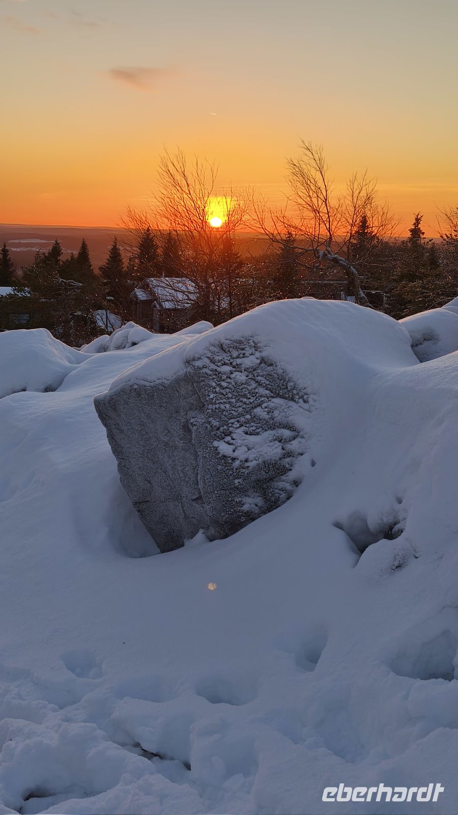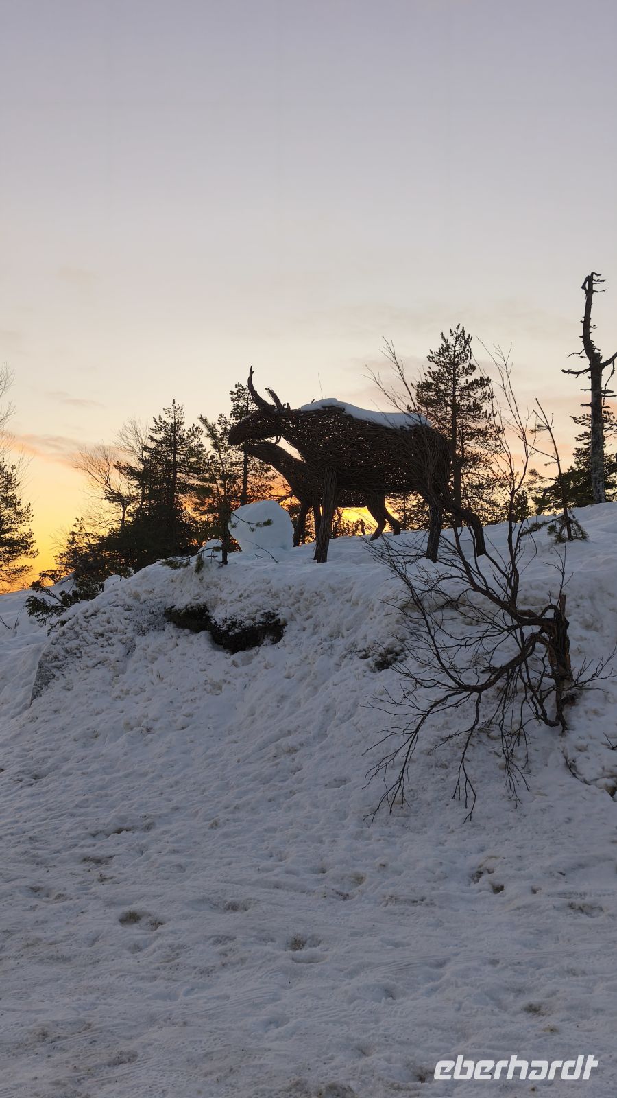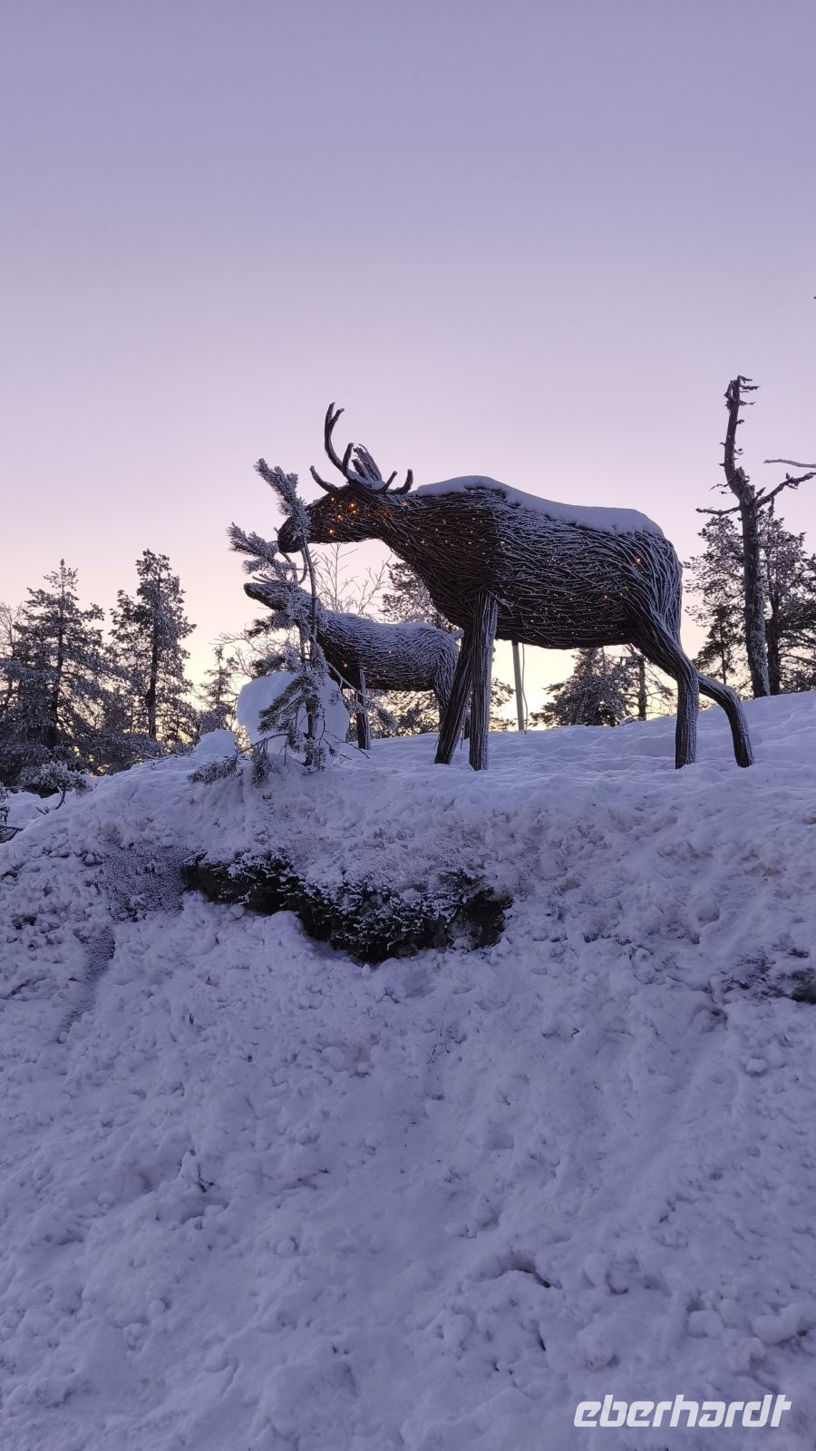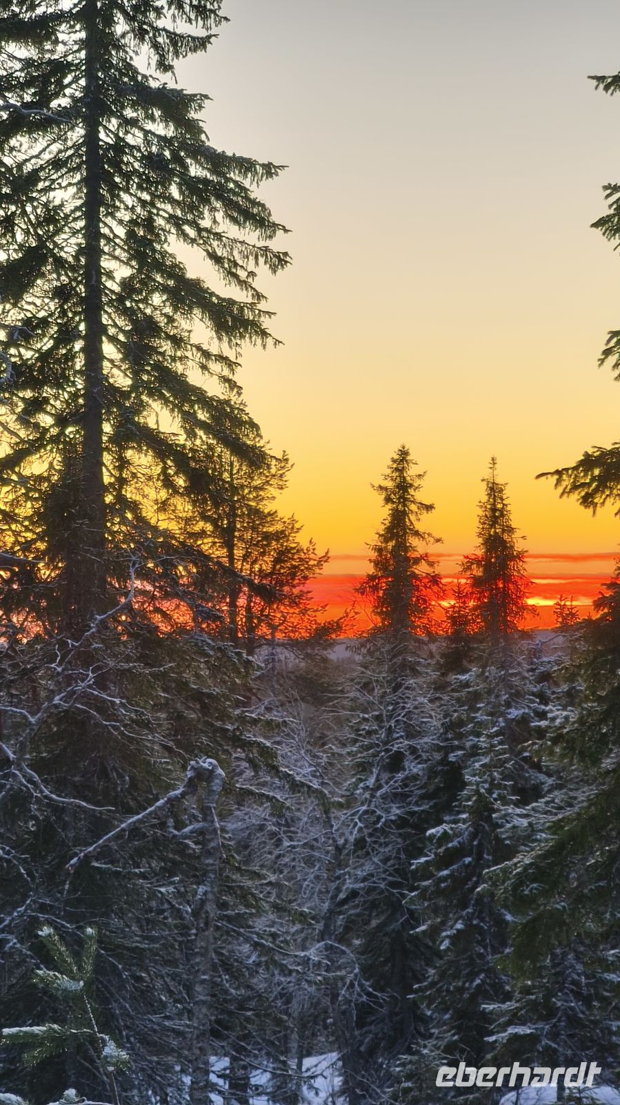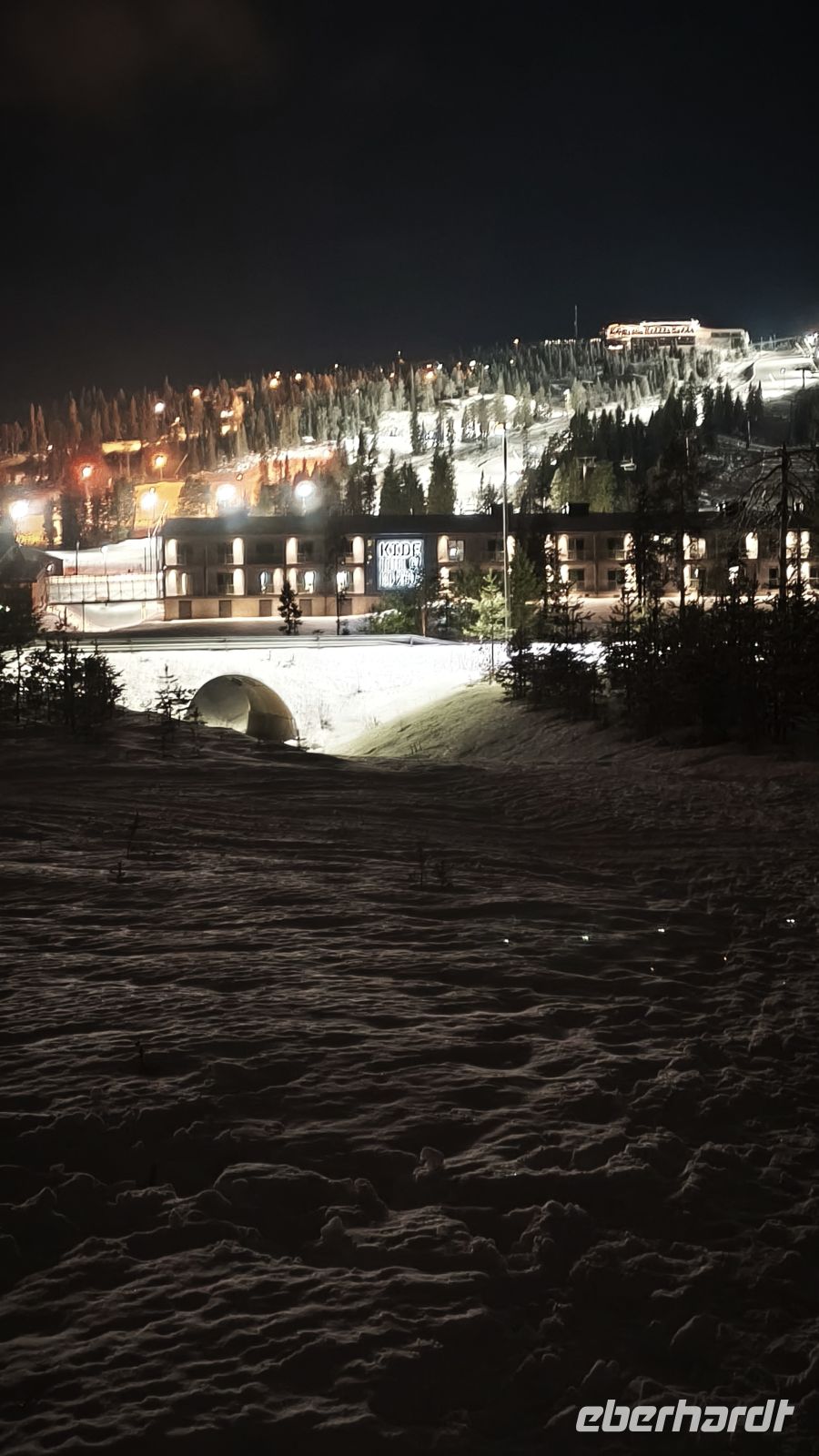 Nach Rückkehr mit der "Vormittags Gruppe" haben wir noch eine Wanderung zum "Tophill Hotel" gemacht. Wie der Name schon sagt oben auf dem Berg. Nach einer knappen Stunde bergauf mit tollen Aussichten. Die tief stehende Sonne färbt den Himmel in einmalige Gelb- und Rot-Töne. Das ist das besondere Licht Lapplands und tief beeindruckt sind wir immer wieder stehen geblieben, um diese Lichtstimmungen mit der Kamera einzufangen. Sie zeigen Lappland von seiner magischen Seite.
