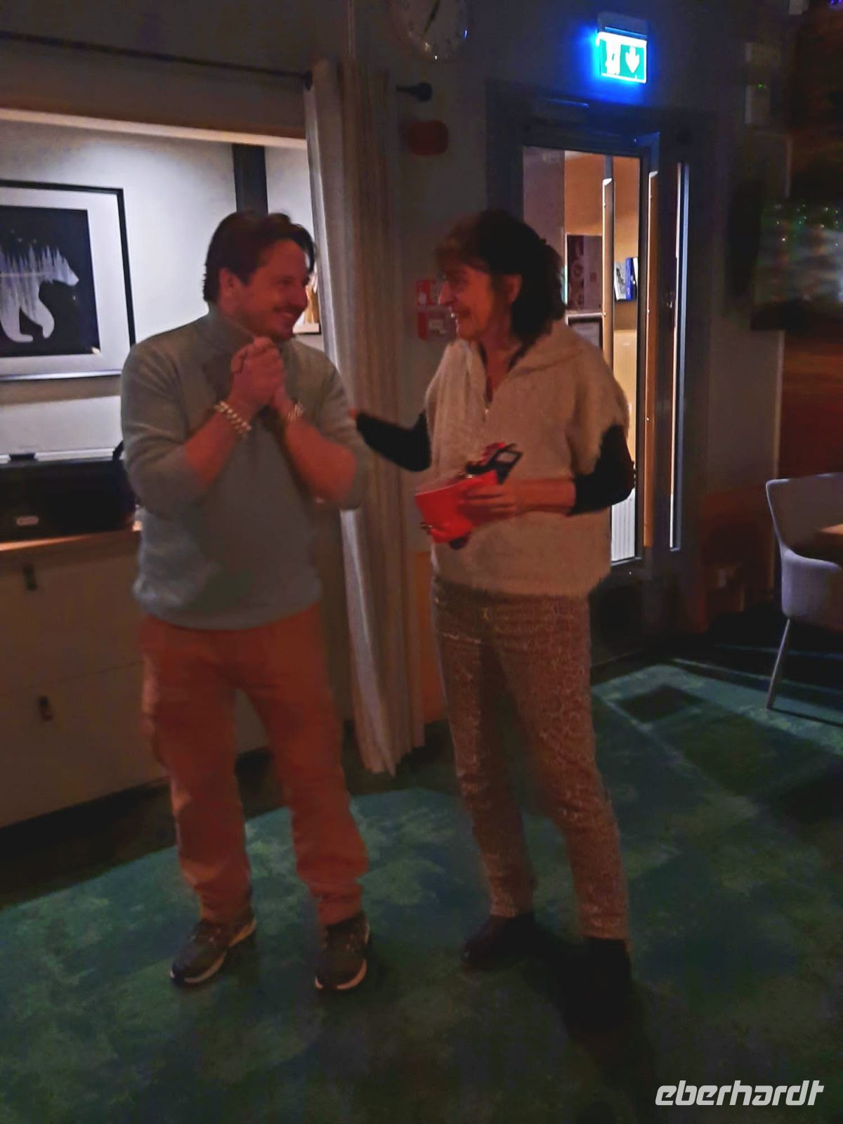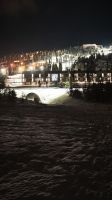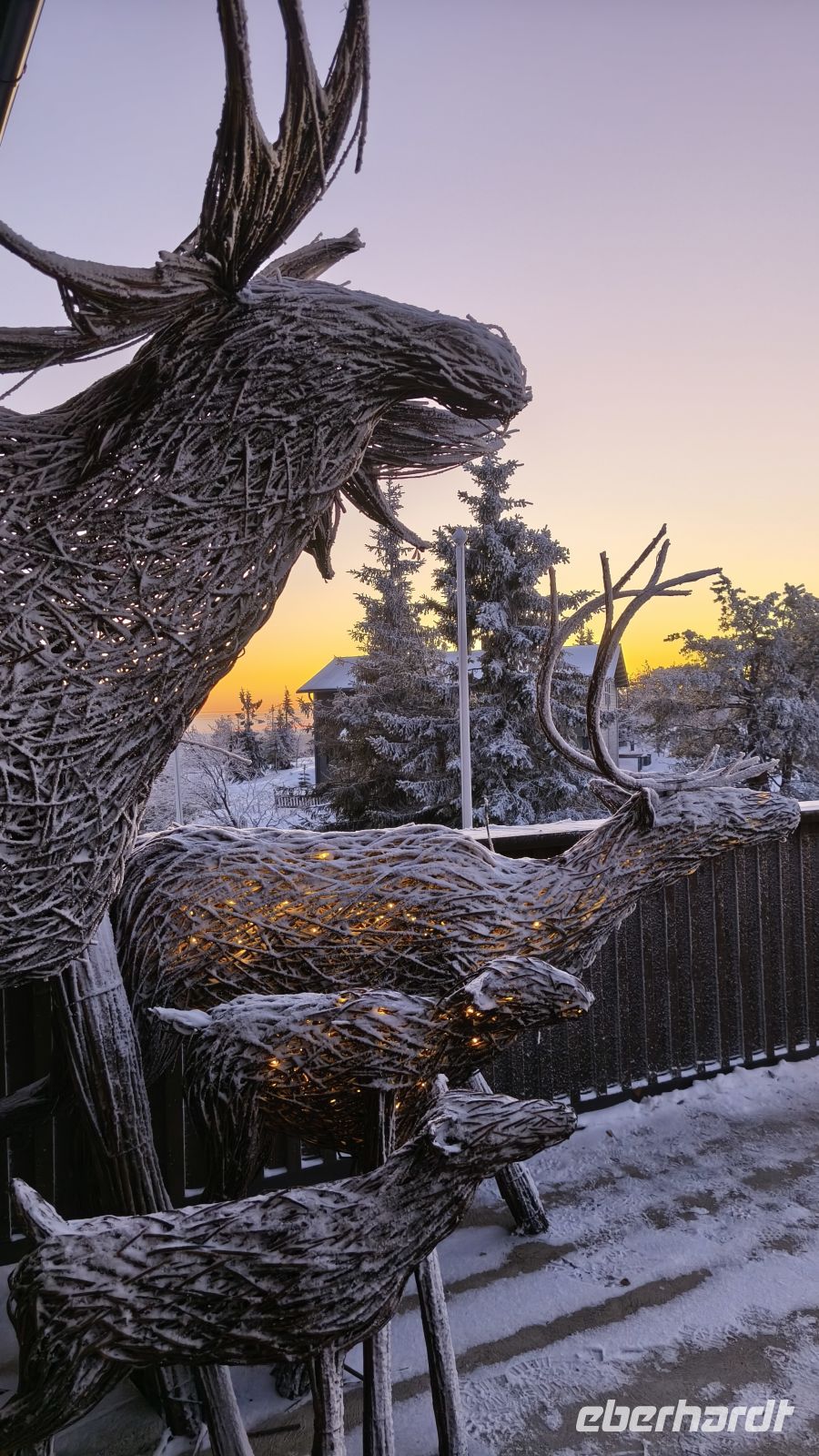 Oben angekommen haben wir uns ein warmes Getränk verdient, genießen noch kurz die Aussicht durch die Glasfront des Hotels und machen uns dann durch die weiße Schneelandschaft im fast Dunklen wieder nach unten. Das Abendessen erwartet uns und lässt uns flott zurück kehren.