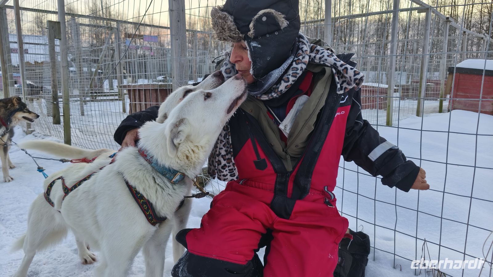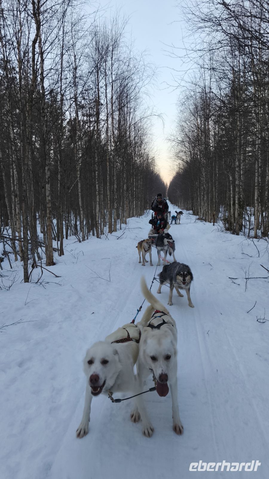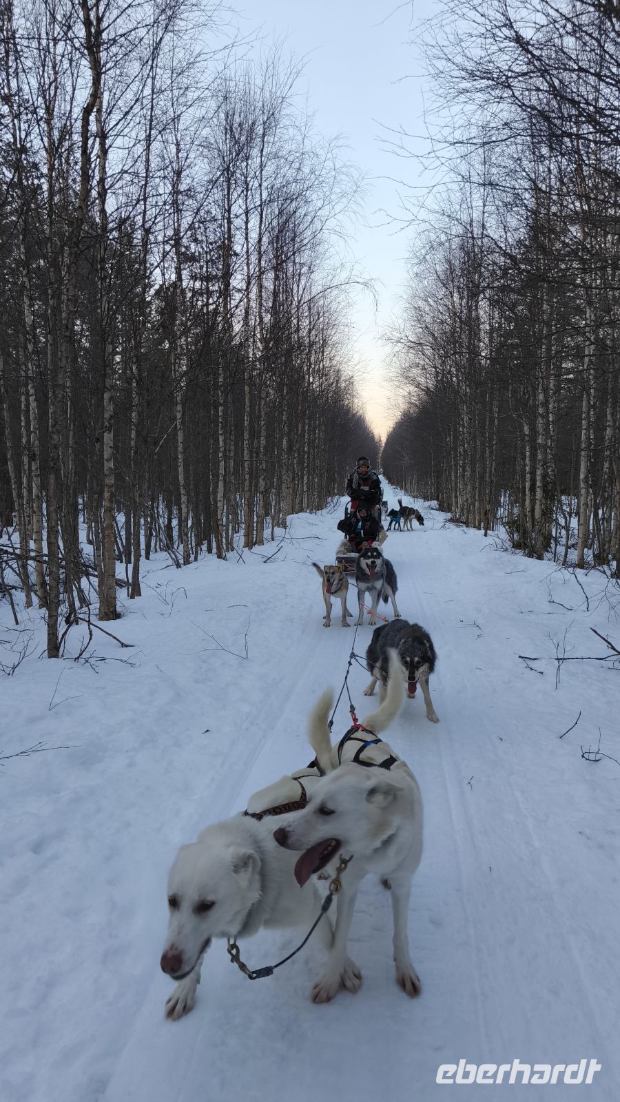Dann endlich ging es los, der Moment worauf alle gewartet hatten. Die vier Schlitten mit jeweils fünf Hunden waren angespannt und zur Abfahrt bereit. Immer zwei Personen mit einem Schlitten, ein " Musher" (Fahrer) und der Beifahrer mehr oder weniger entspannt im Schlitten auf einem Rentierfell sitzend. Arme unbedingt im Schlitten lassen, sonst gegebenenfalls "Arm ab" so wurden wir lachend angewiesen. Ungeduldig warten die Schlittenhunde auf das Kommando zum Start. Langsam und mit Gefühl den Fuß von der Bremse und ab geht die Post. Voller Energie ziehen die Hunde den Schlitten durch die verschneite Landschaft. Kurven waren das ein oder andere Mal durchaus eine Herausforderung vor allem das bremsen auf dem hart gefrorenen Boden war schwierig, sodass man trotz voller Bremsung den Vordermann touchiert hat, weil man die Hunde nicht zum stehen gebracht hat. Nach der Hälfte der Strecke durfte wer wollte wechseln und weiterfahren. Begleitet wurden wir von zwei Motorschlitten die an gefährlichen Kurven aufgepasst haben, dass wir rumkommen ohne in einer Schneewehe zu landen oder dass wir an Wurzeln hängen bleiben. Wir sind alle heil wieder angekommen. Hunde sowie "Musher" und Beifahrer hatten riesigen Spaß. Nach diesem außergewöhnlichen Erlebnis, haben wir die Hunde gestreichelt und gelobt und sie haben die Aufmerksamkeit sichtlich genossen.