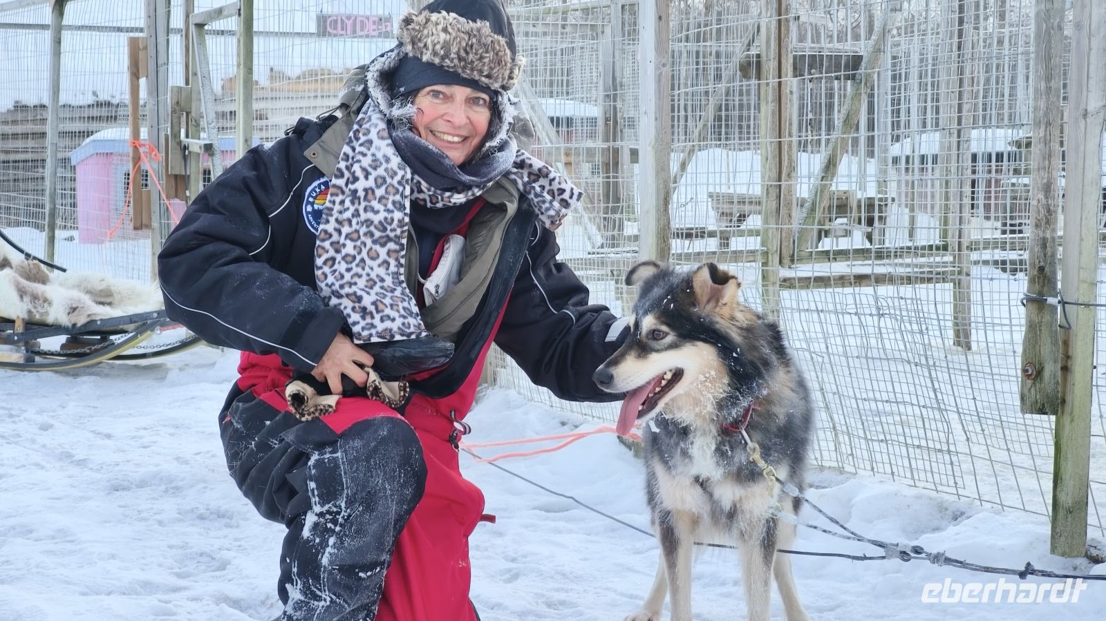 Gleich zu Beginn unserer Reise ein besonderes Highlight. Die Huskytour. Wir wurden in zwei Gruppen aufgeteilt, eine Vormittags und eine Nachmittags mit jeweils acht Teilnehmern. Ein bisschen Unsicherheit und Aufregung war spürbar. Das Wetter war klar, sonnig und sehr kalt. Dick eingepackt haben wir zunächst eine Einweisung bekommen. Wie lenkt man einen Hundeschlitten und vor allem wie bremst man ihn ab. Was ist wichtig im Umgang mit dem Schlitten und mit den freundlichen, aber kraftvollen und höchst motivierten Hunden. Die Voraussetzungen waren nicht optimal da es getaut hatte und durch den Frost die Wege wieder hart gefroren waren.