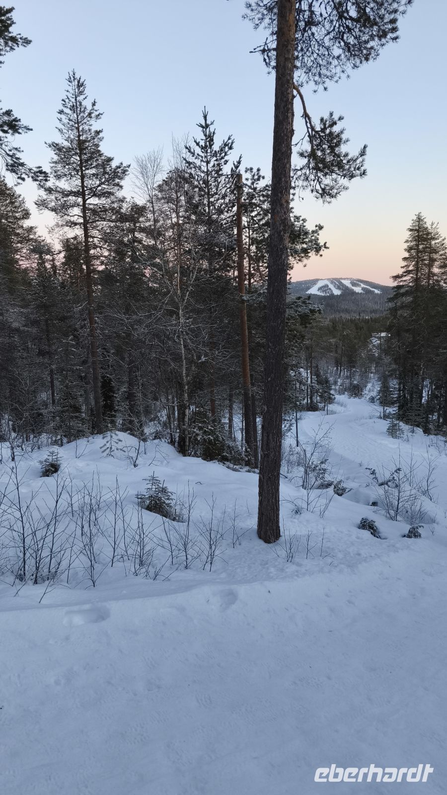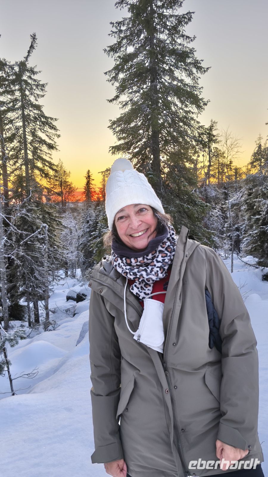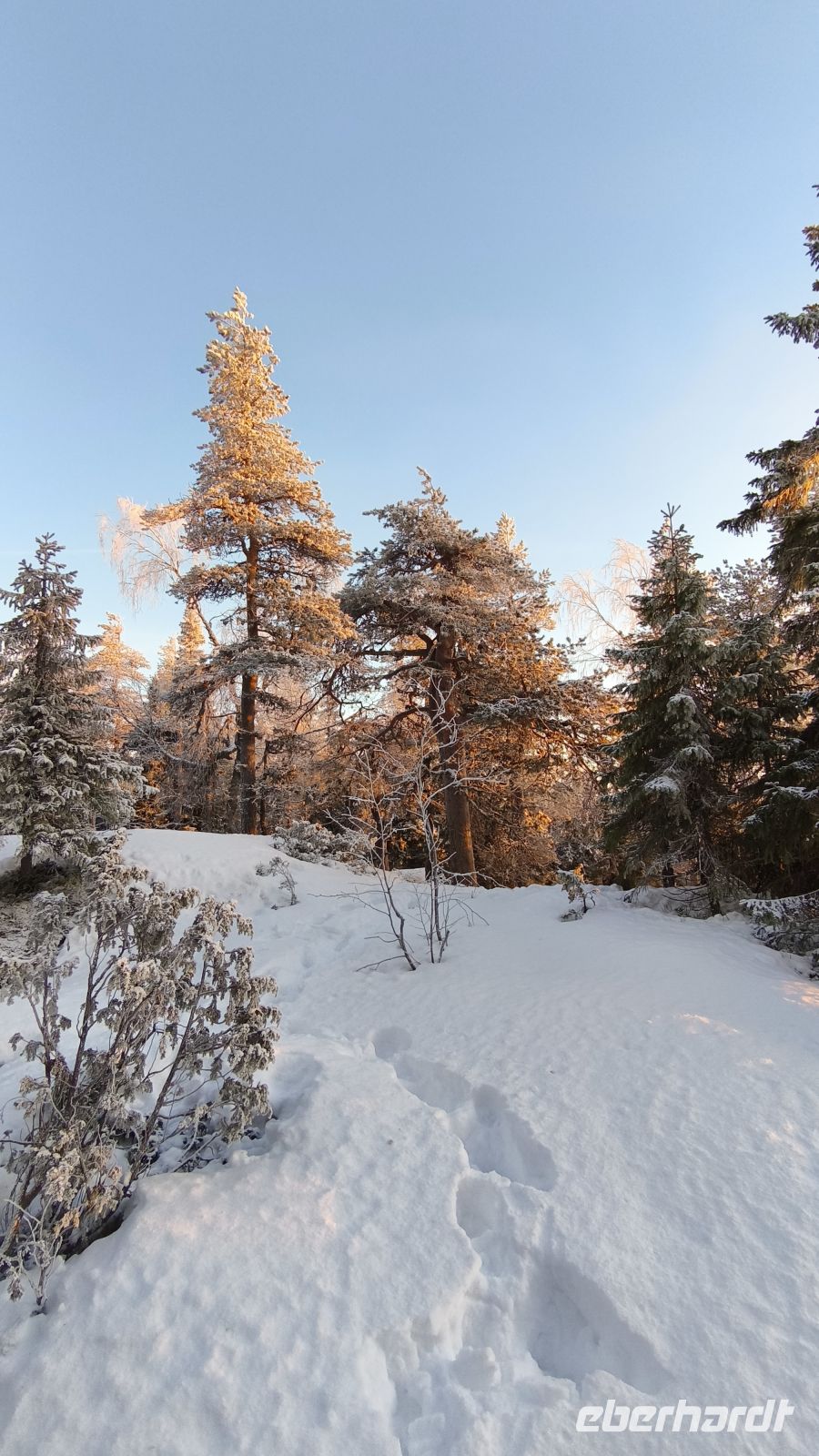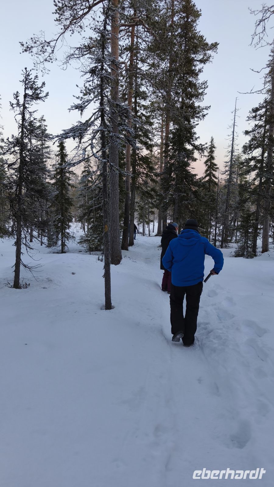 Wir bieten eine Wanderung in den Naturpark an. Ein Großteil der Reisegruppe nimmt mit Fabio und mir teil. Durch die wunderschöne verschneite finnische Landschaft laufen wir über schmale Pfade durch das Naturschutzgebiet bei Iso Syöte direkt ab Hotel. Bei herrlich klarem Wetter genießen wir wieder das wunderbare, zauberhafte Licht, das die niedrig stehende Sonne für uns bereithält.