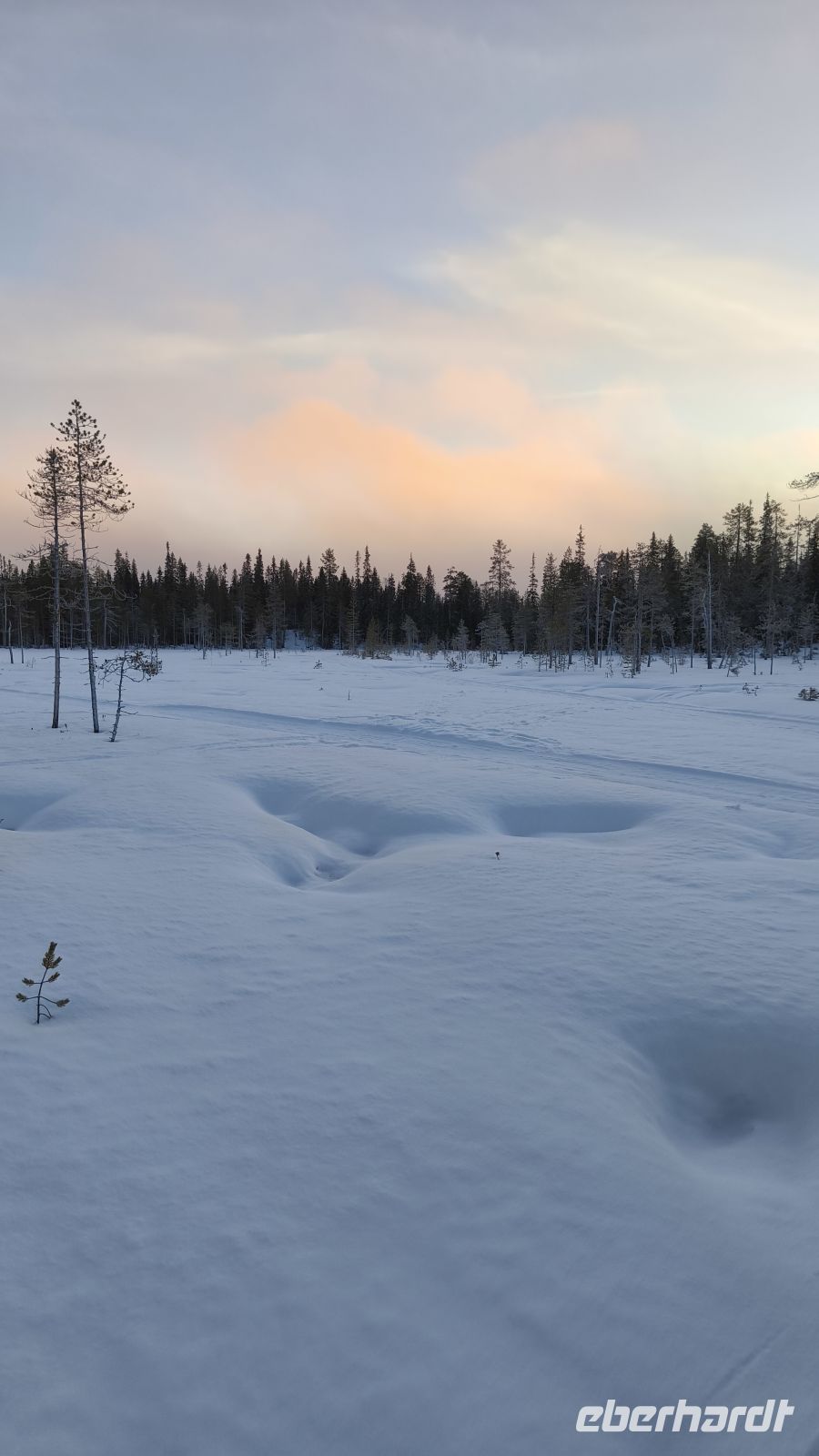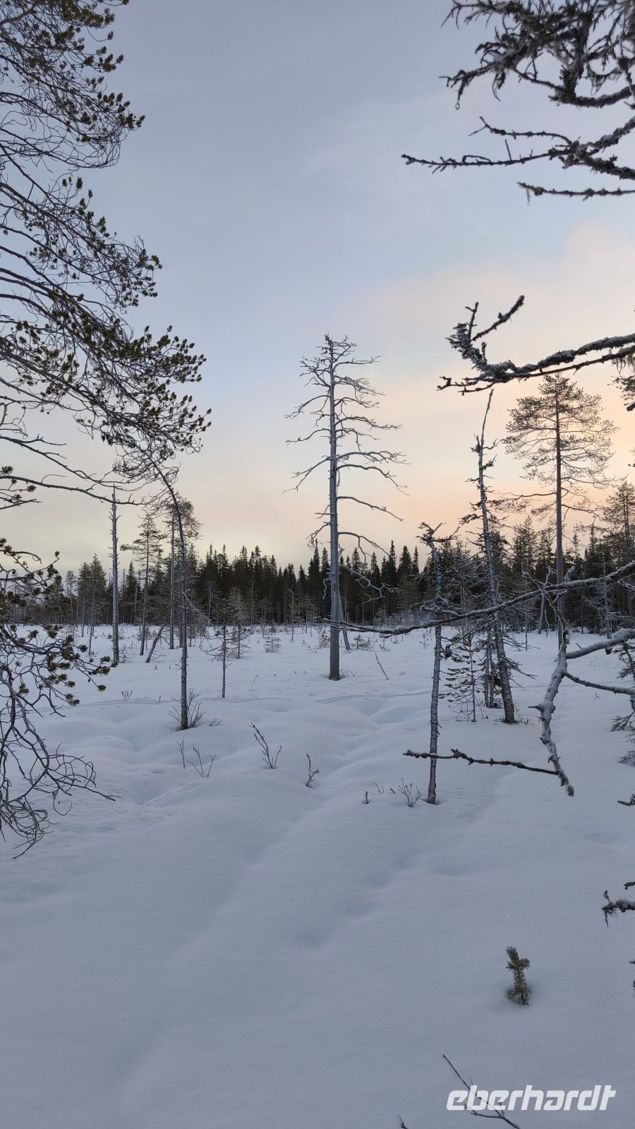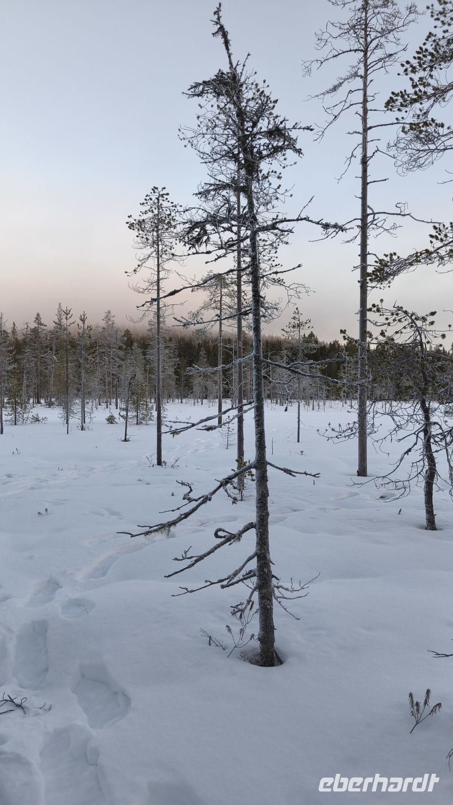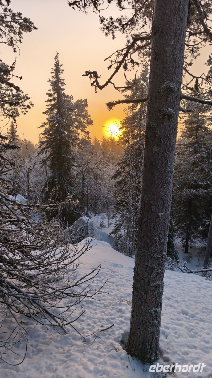 Wir bieten eine Wanderung in den Naturpark an. Ein Großteil der Reisegruppe nimmt mit Fabio und mir teil. Durch die wunderschöne verschneite finnische Landschaft laufen wir über schmale Pfade durch das Naturschutzgebiet bei Iso Syöte direkt ab Hotel. Bei herrlich klarem Wetter genießen wir wieder das wunderbare, zauberhafte Licht, das die niedrig stehende Sonne für uns bereithält.