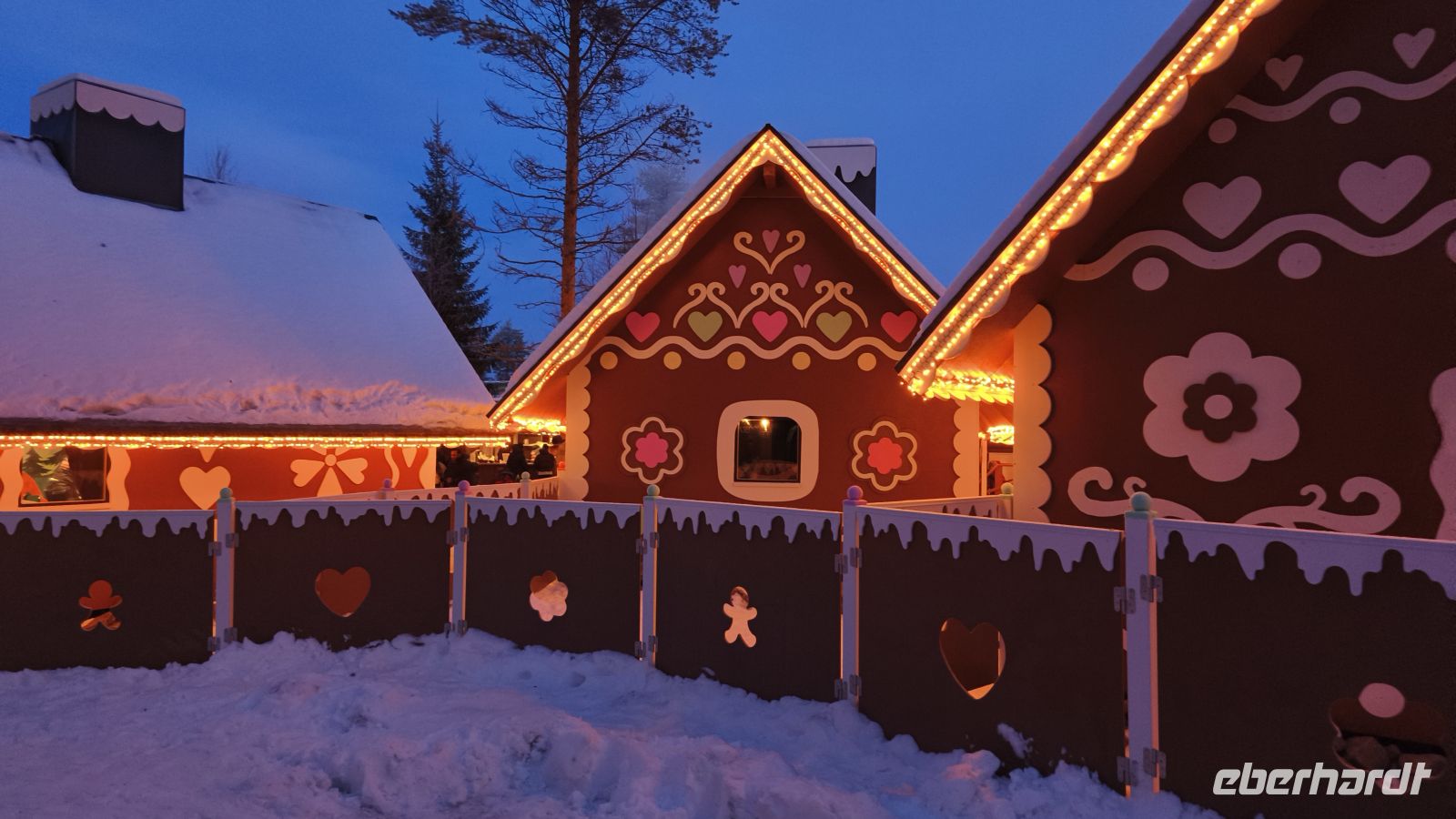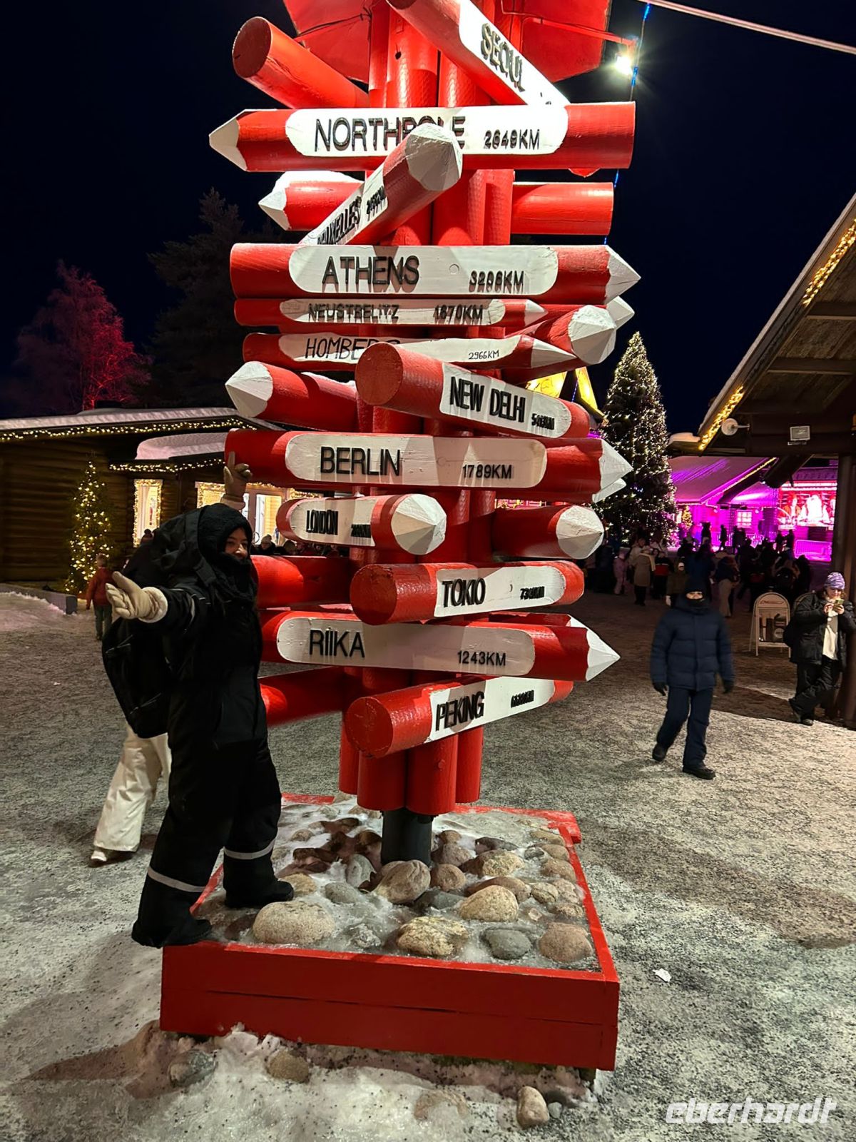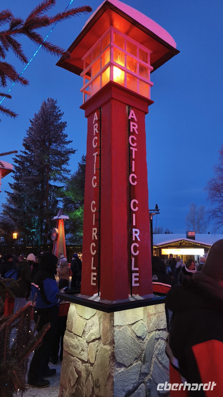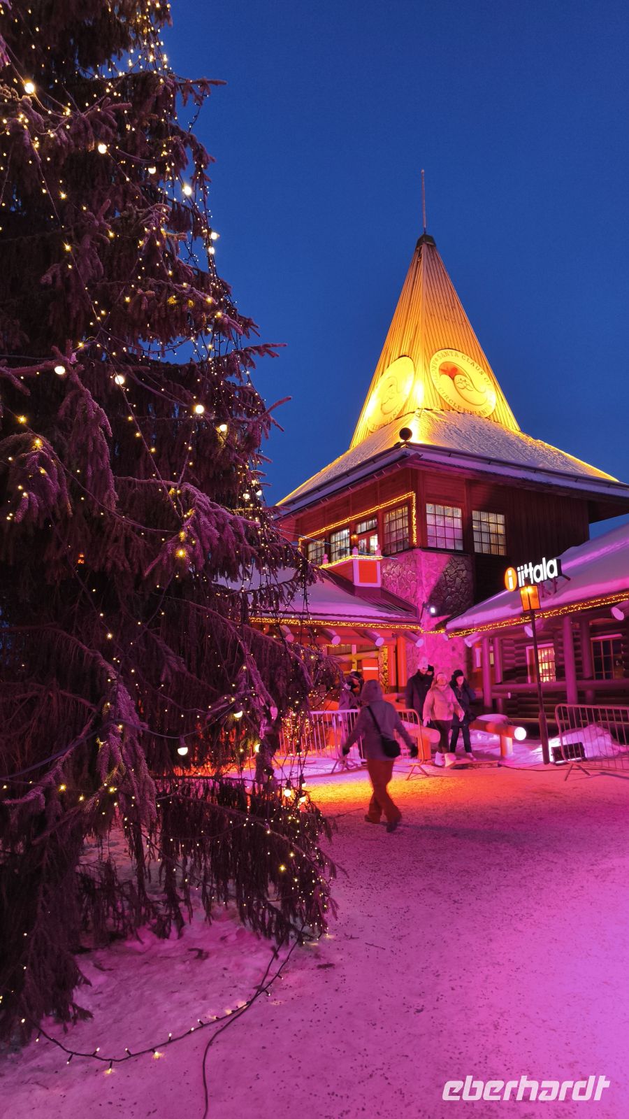 Anschließend fahren wir ein kurzes Stück mit dem Bus zum Weihnachtsdorf, auch Santa Claus Village genannt. Hier hat der Weihnachtsmann seinen festen Wohnsitz, das weiß jedes Kind in Finnland, denn schließlich leben seine Rentiere in Lappland. Ein besonderer und weit über die Landesgrenzen bekannter ganzjährig geöffneter Ort. Es ist voll, lebendig, laut und faszinierend überall "blink blink", ein Lichtermeer aus beleuchteten Häuschen und Geschäften mit Weihnachtsaccessoires. Einige wollten den Weihnachtsmann besuchen, doch leider keine Chance, er war bereits komplett ausgebucht....kein Wunder einen Tag vor Weihnachten. Im Weihnachtsmann Postamt schrieben einige Karten nach Hause. Der Gedanke, dass diese Briefe offiziell vom Polarkreis verschickt werden, macht sie besonders. Der eigentliche Polarkreis ist mitten im Dorf deutlich markiert. Ein Hotspot für Erinnerungsfotos.