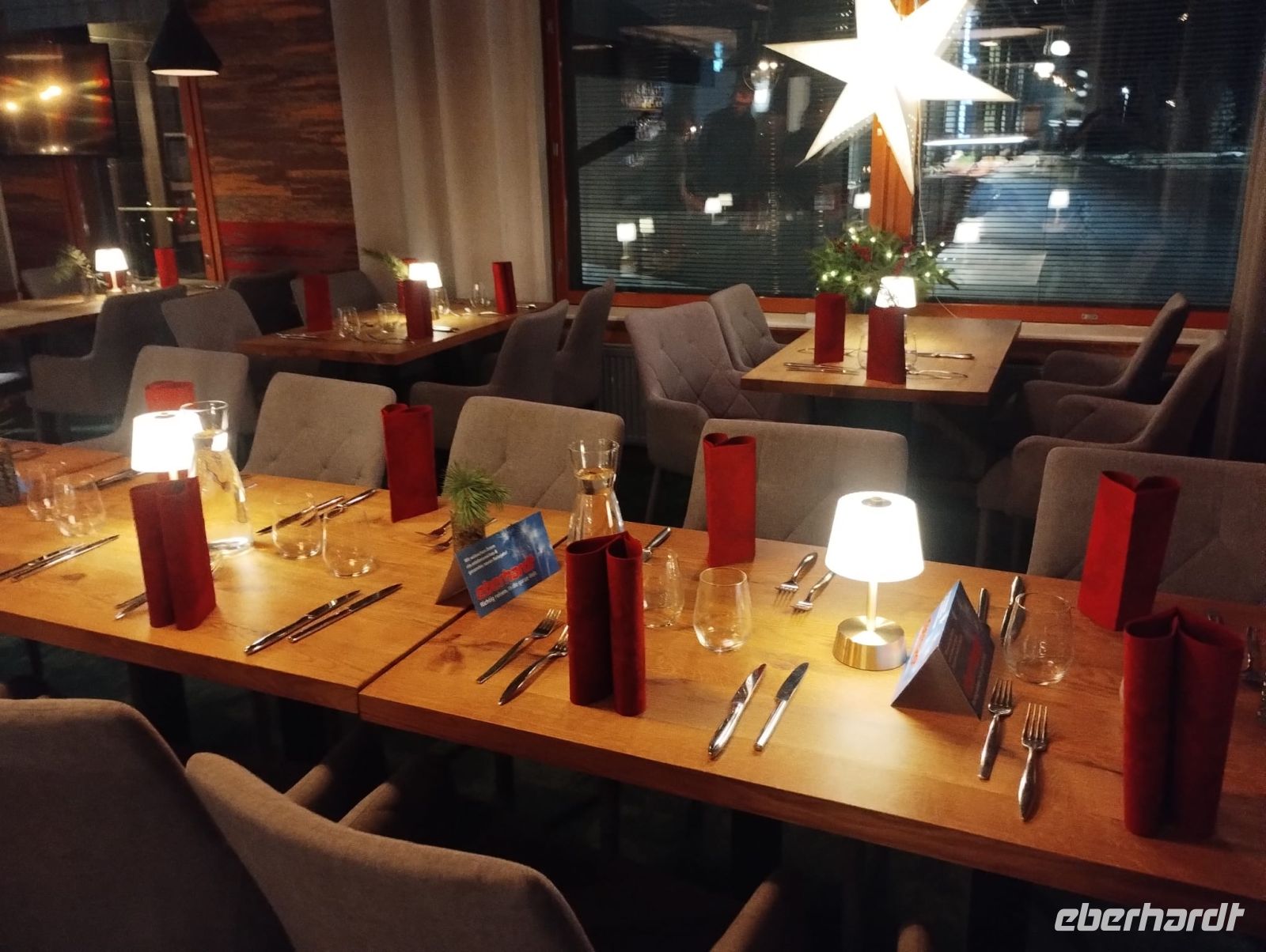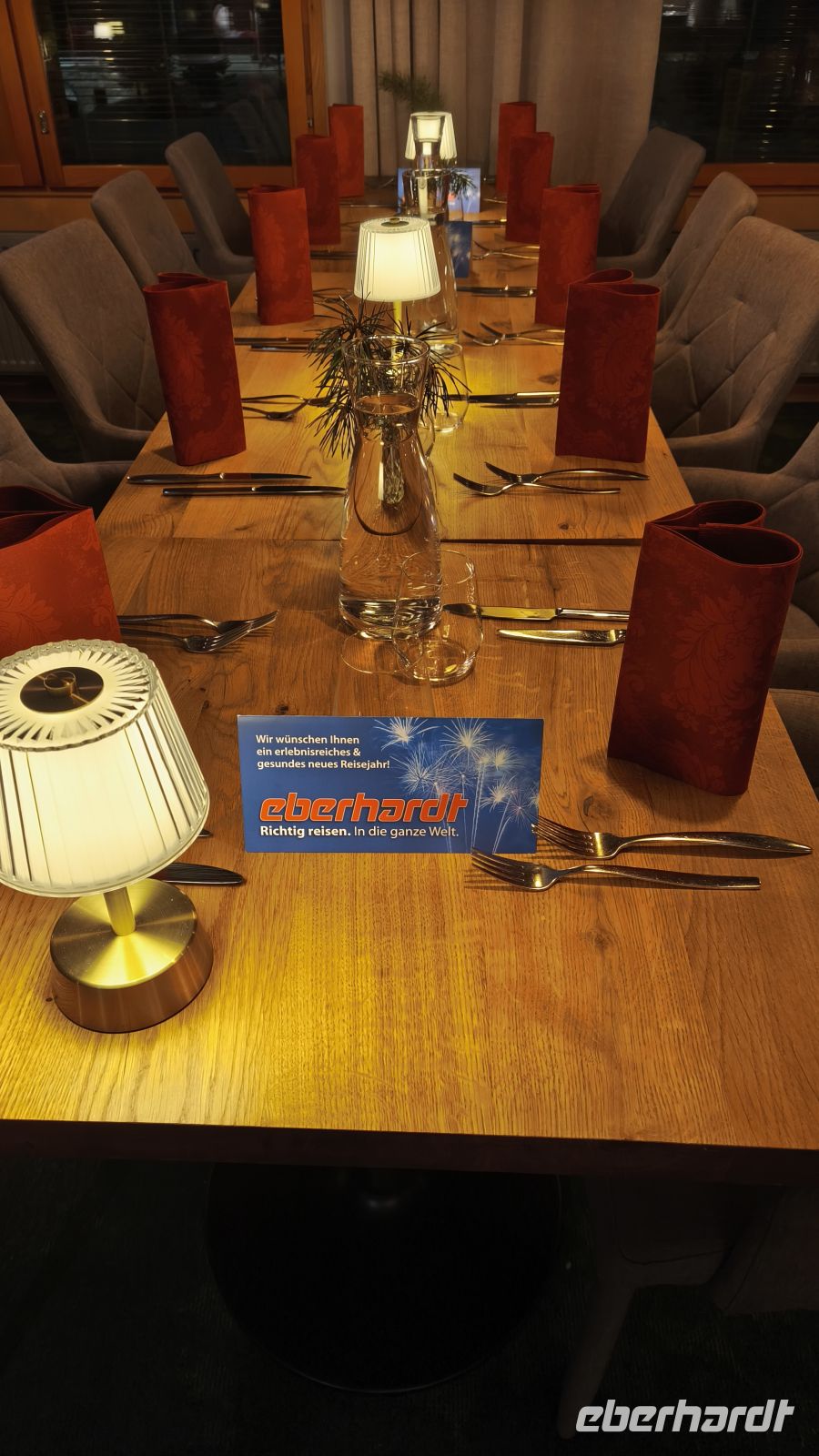 Zurück im Bus freuen wir uns auf das Abendessen. Die ganze Gruppe sitzt im Restaurant gemütlich zusammen und wir berichten uns gegenseitig von den Erlebnissen im Weihnachtsdorf.