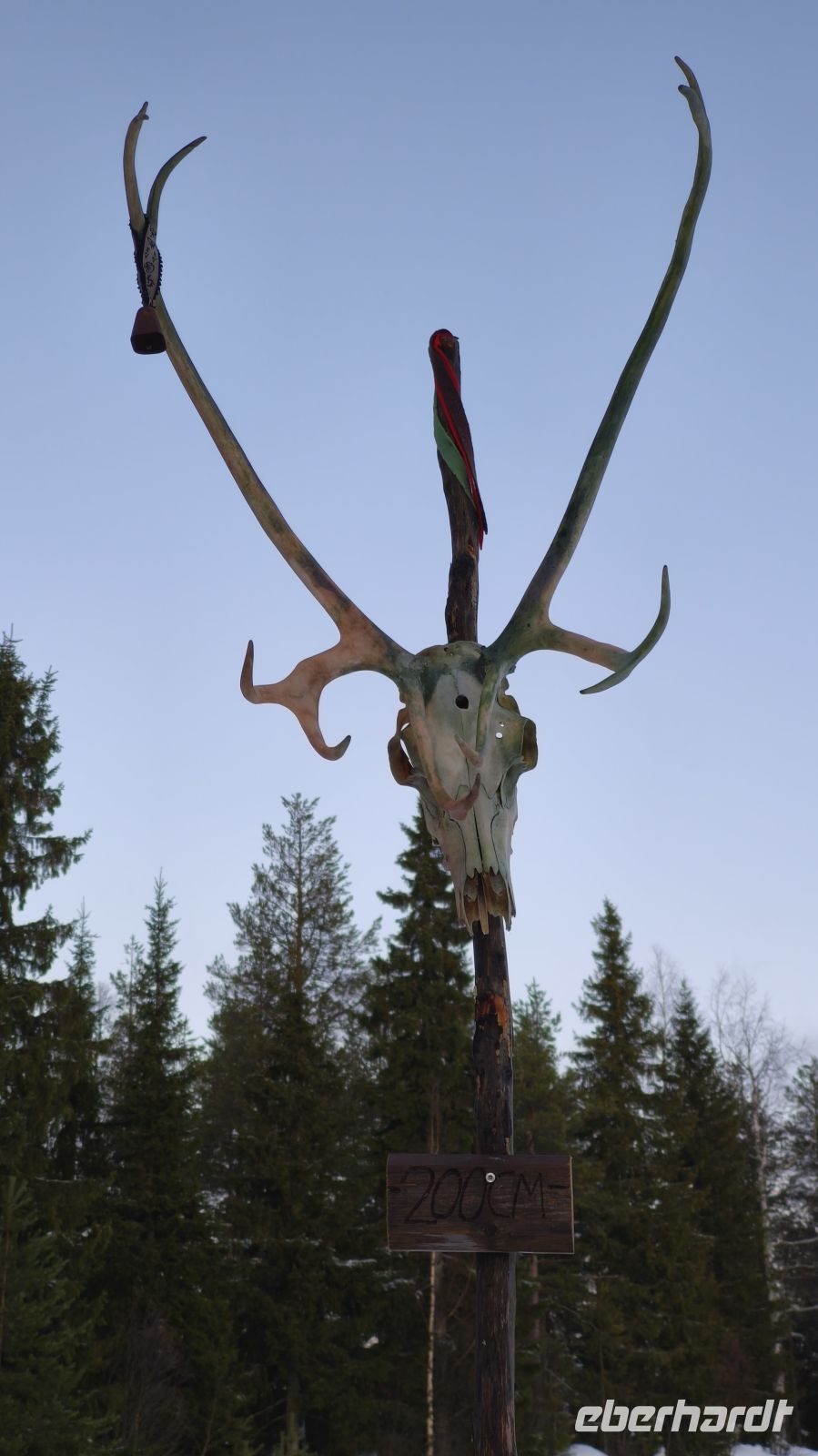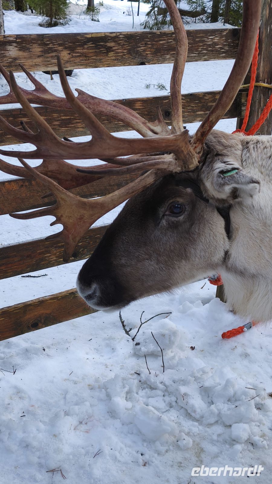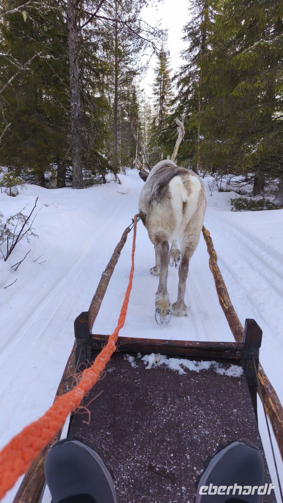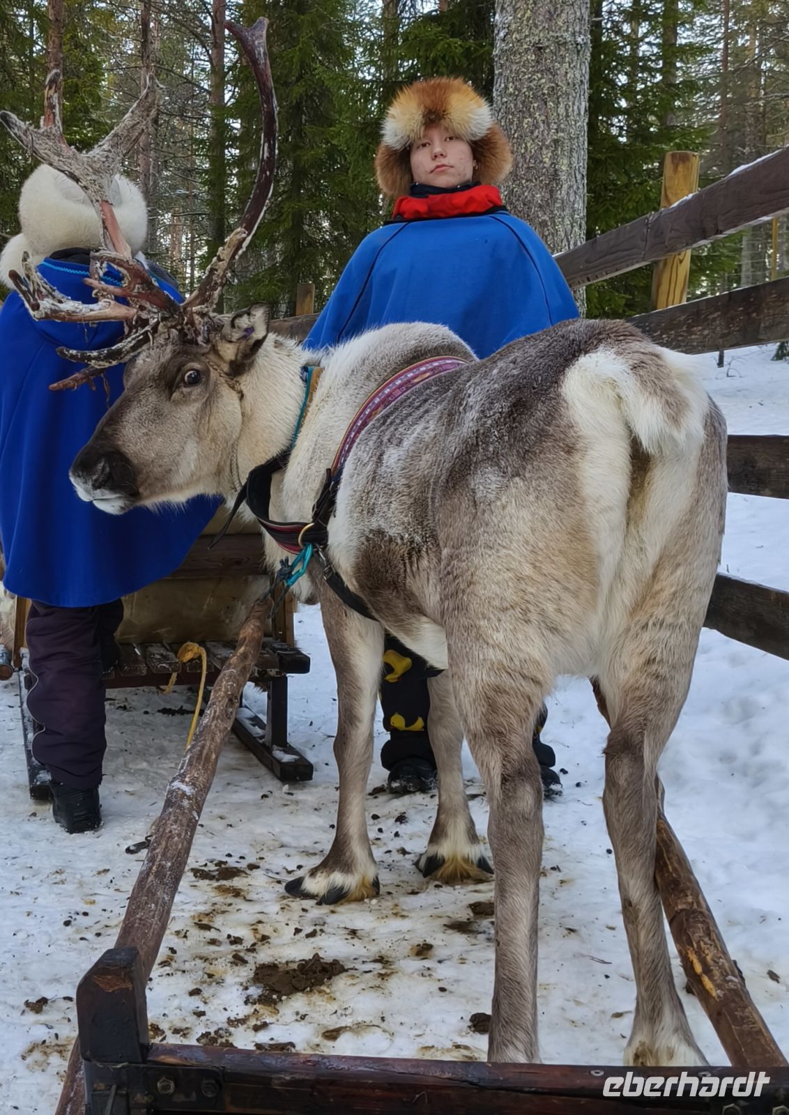 Im Rahmen unserer Reise erwartete uns heute der Besuch der Rentierfarm von Mika und Satu. Wir freuten uns alle sehr. Bevor es mit dem Rentierschlitten losging bekamen wir eine genaue Einweisung von Niklas (er ist der Sohn der Farmerfamilie). Wie sitzt man sicher im Schlitten, wie wird die Leine gehalten und welche Kommandos verstehen die Tiere. Das Tempo, so wurden wir angewiesen, bestimmt mehr oder weniger das Rentier und ziehen an der Leine ist streng (!) verboten, lediglich ein wenig antreiben mit der Leine ist erlaubt. Dann ging es los auf die 2,5km lange Strecke durch den Wald. Nun denn, die Ren(n)tiere der ersten drei Schlitten sind sofort los galoppiert und lieferten sich munter einen Wettkampf miteinander. Schon bald waren sie von unserem Schlitten aus, nicht mehr zu sehen. Unser Rentier ließ es eher gemächlich angehen, aber nach einer Weile hatten wir den Dreh raus, es ein wenig anzutreiben und schließlich kamen wir auch ins Ziel. Die Fahrt hat allen riesig Spaß gemacht.