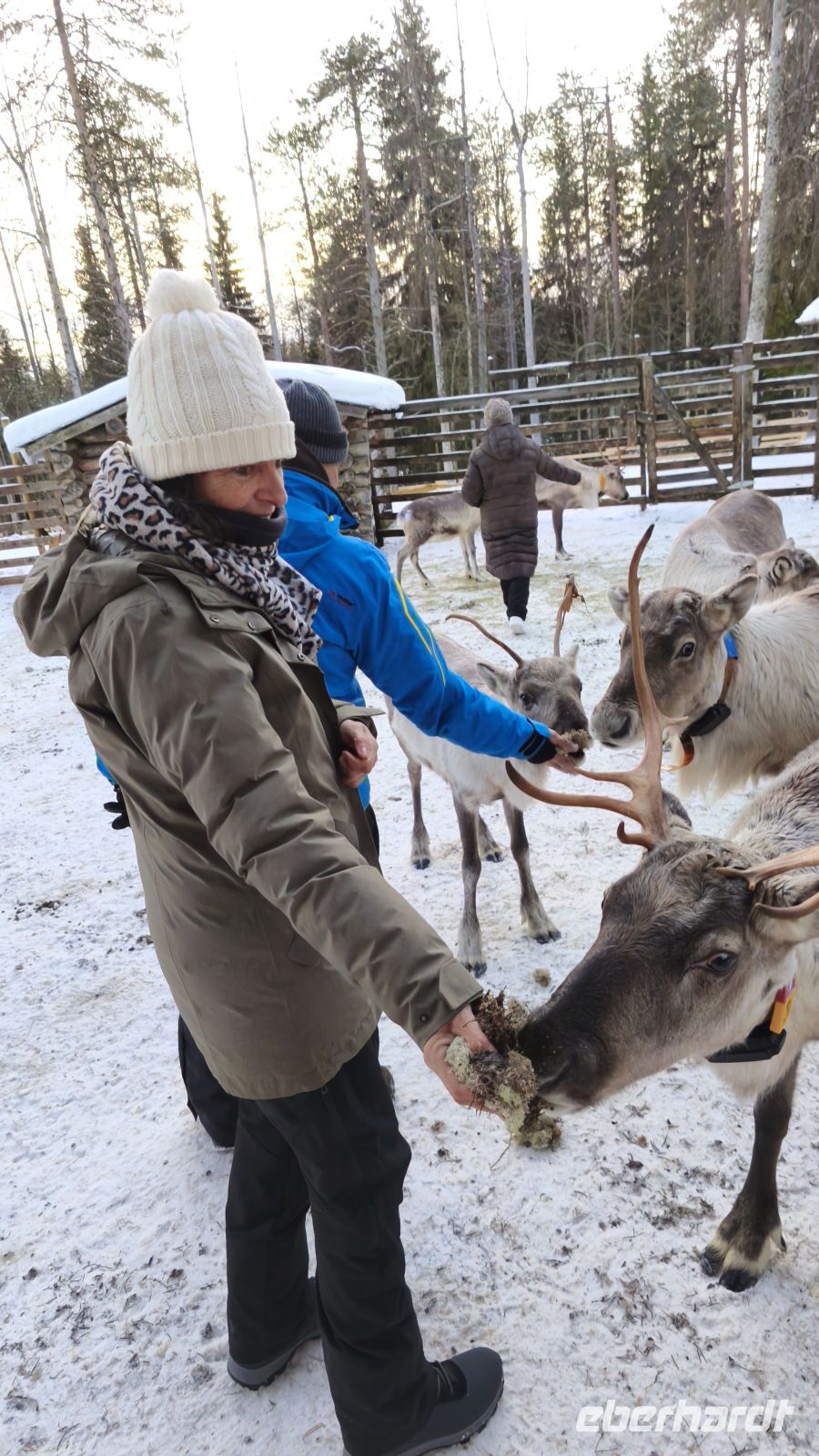 Dann konnten wir die Rentiere füttern. Ausgestattet mit speziellem Futtermoos konnten wir ins Rentiergatter. Nicht ohne vorab mit dem Hinweis uns seitlich den Rentieren zu näheren, ansonsten würden wir gegebenenfalls unliebsame Bekanntschaft mit den Geweihen machen. Alle hatten Spaß und keiner ist "aufgespießt" worden.