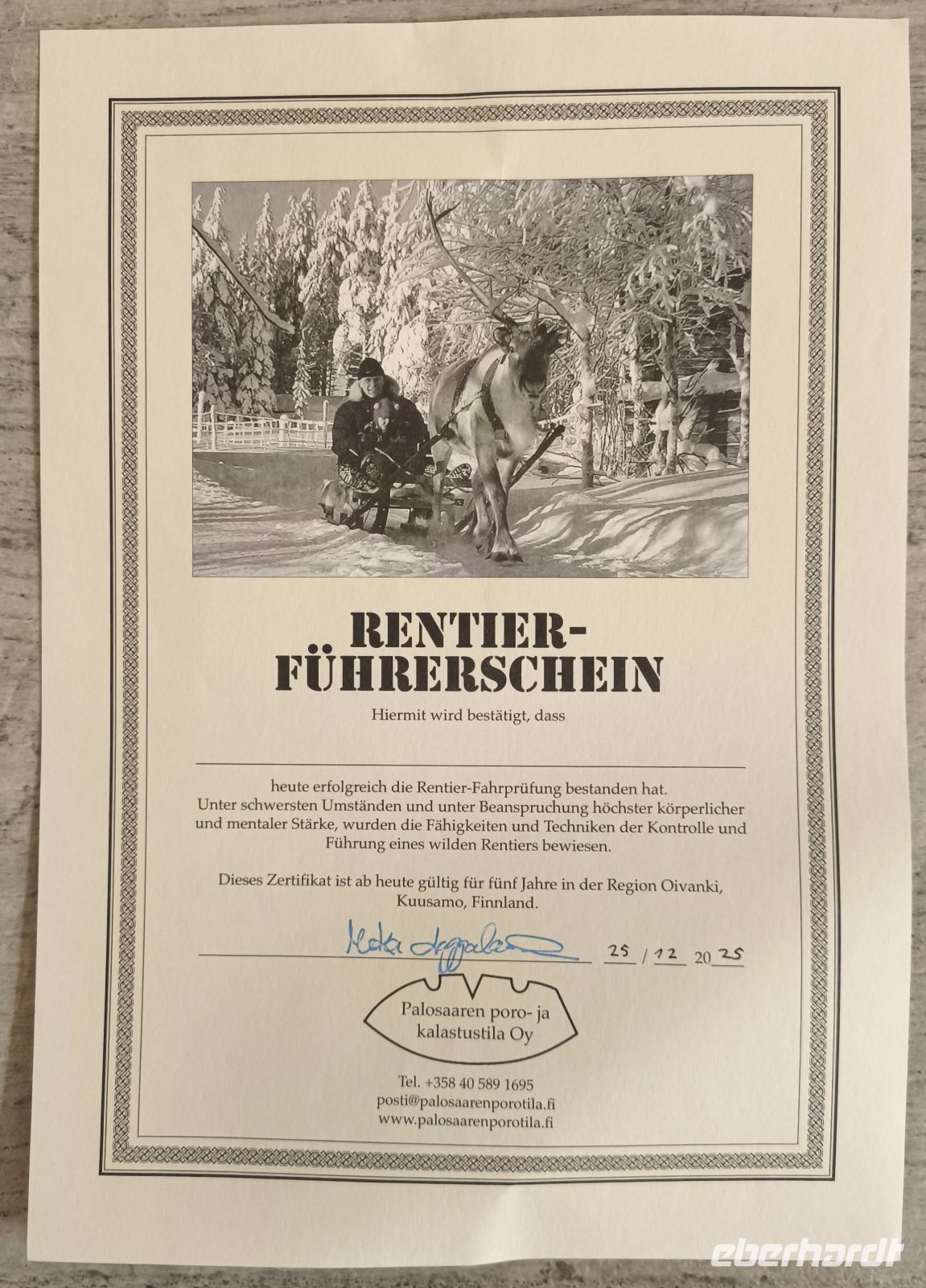 Auf der Farm gibt es noch das 1925 erbaute Haus der Großeltern, mittlerweile umgebaut zu einem Museum und kleinem Shop mit Dingen rund um das Rentier aus eigener Produktion. Zum Abschied gab es noch für jeden als Andenken den "Rentier Führerschein", eine nette Geste und schöne Erinnerung.