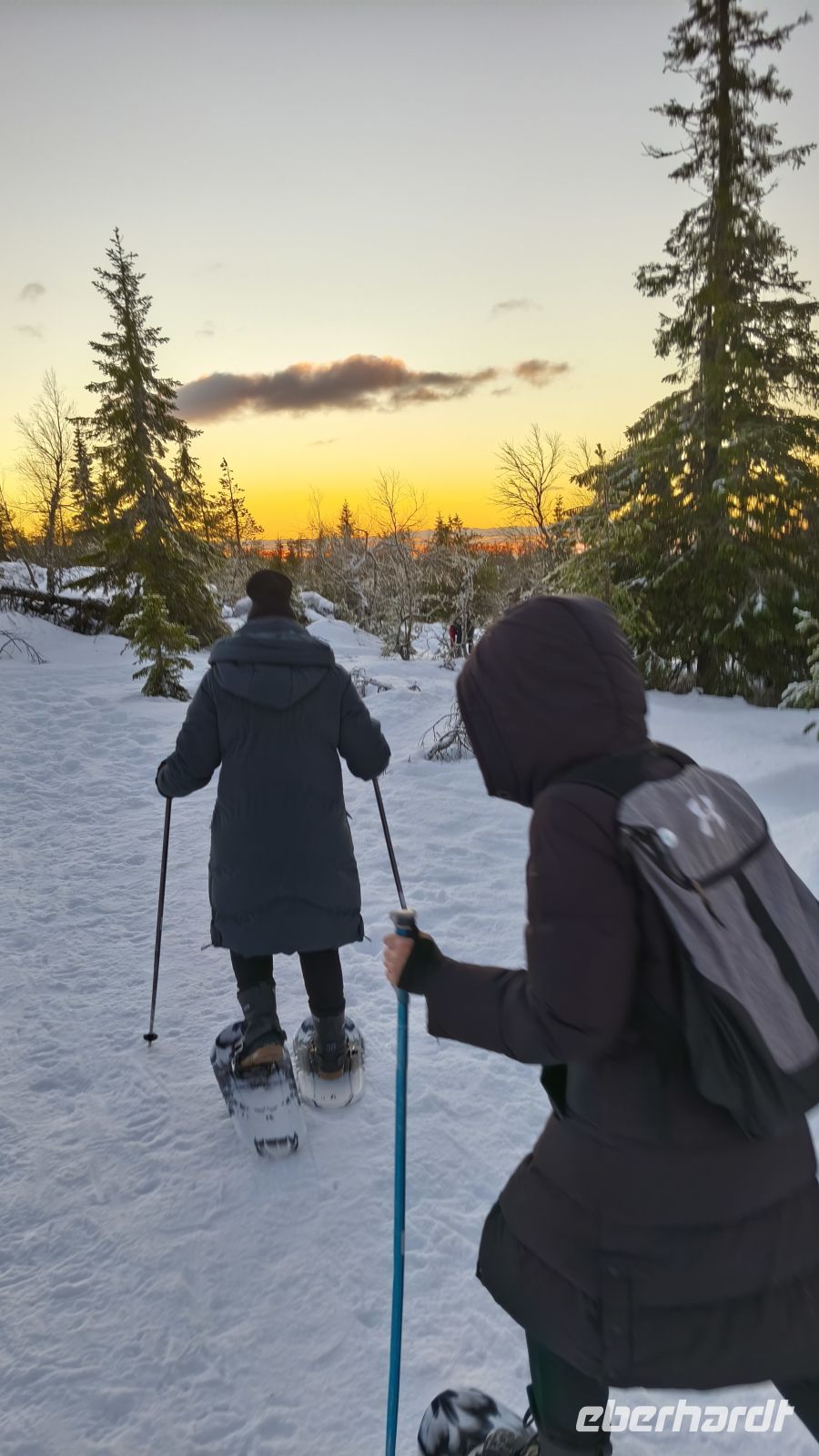 Das Wetter zeigt sich wieder von seiner schönsten Seite, blauer Himmel und die tiefstehende Sonne begleiten uns. Siehe da, Schneeschuh wandern ist gar nicht schwer und im gleichmäßigen Tempo wandern wir mit unseren Schneeschuhen durch die hügelige Landschaft. Wir legen kurze Pausen ein, um die herrliche Landschaft zu genießen. Von der Anhöhe bot sich ein weiter Blick über die Wälder Lapplands und das Skigebiet. Die Lichtverhältnisse sind wieder wahnsinnig eindrucksvoll und schaffen eine tolle Stimmung Das kann man nur in Lappland erleben.