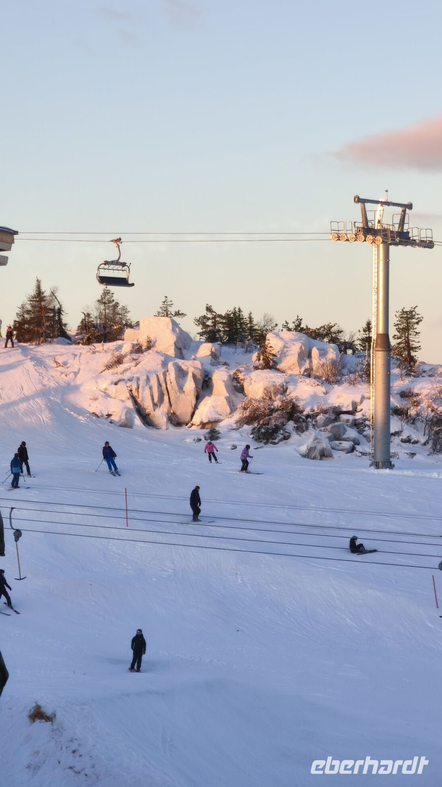 Andere genießen die Natur mit Langlaufski. Es gibt viele gut gespurte Loipen durch durch den Wald und über zugefrorene Seen. Auch Abfahrtsski wird angeboten. Es gibt einen Sessellift und mehrere Schlepplifte. Auch dieses Angebot nahmen einige gerne an. Die Pisten werden bei Einbruch der Dunkelheit beleuchtet. Ausrüstung für alle sportlichen Aktivitäten gibt es direkt gegenüber vom Hotel.