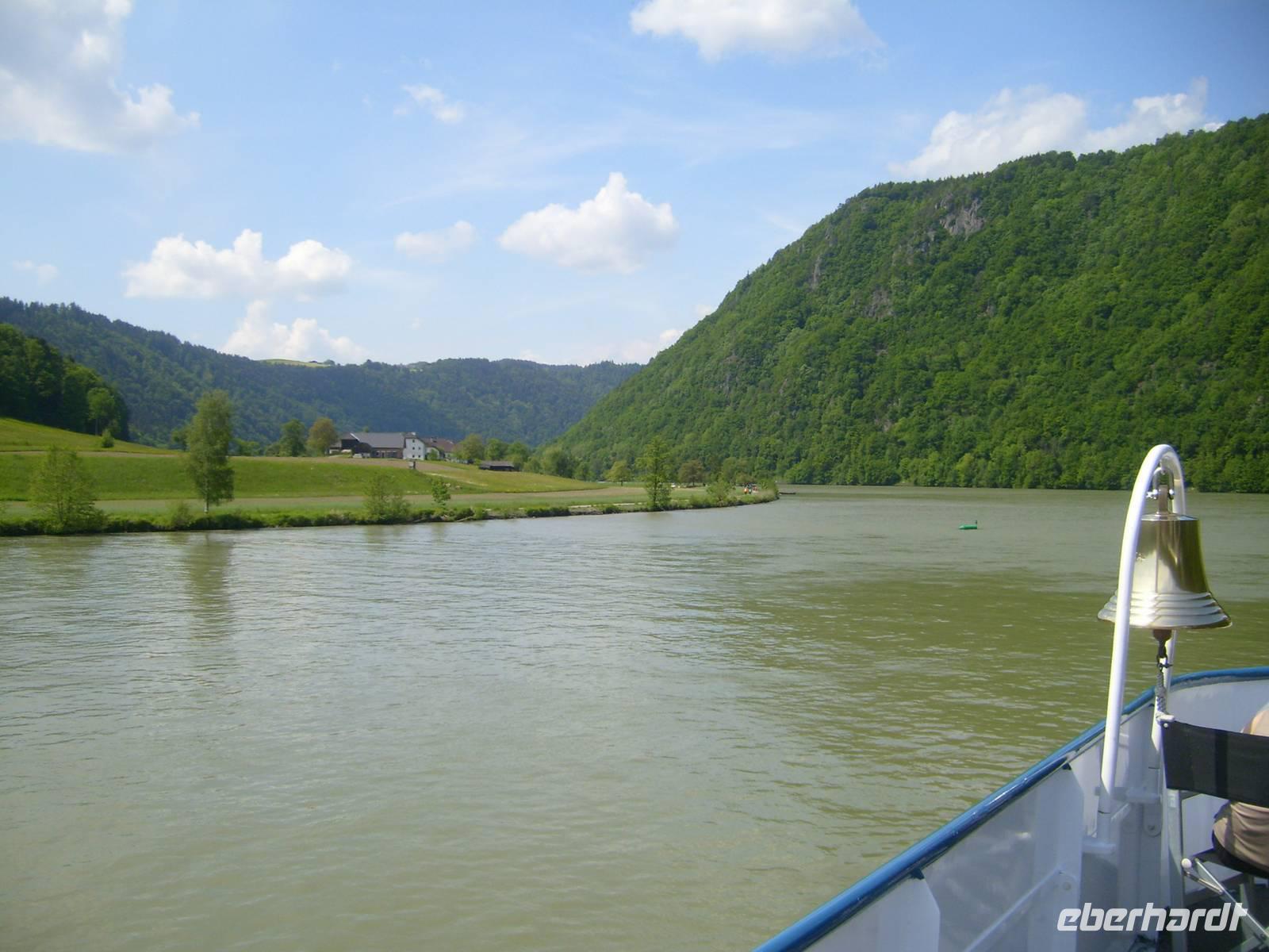 Diese malerische Stadt liegt im Grenzbereich zwischen Deutschland und Österreich. Die Flüsse Inn und Ilz vereinen sich hier mit der Donau zu einem mächtigen Strom. Ca. 400m breit beginnt die Donau hier ihren neuen vereinigten Lauf, den sie dann im Donaudelta beendet. Die Donau hat wenig Gefälle und neigt deshalb oft über die Ufer zu treten. Was die Menschen hier in Passau oft schon erlebt haben. Die Farbe des Stromes verändert sich. Das leuchtende grün des Alpenflusses Inn, das Schwarz der Ilz, die aus einem Moorgebiet kommt. Mit viel Phantasie kann man also schon hier von der „Blauen Donau“ sprechen. Hier spüren wir zum ersten Mal das die Donau Europas zweitlängster Strom mit 2.850km ist. In Passau verlässt die Donau Deutschland und wird später zur Duna.
